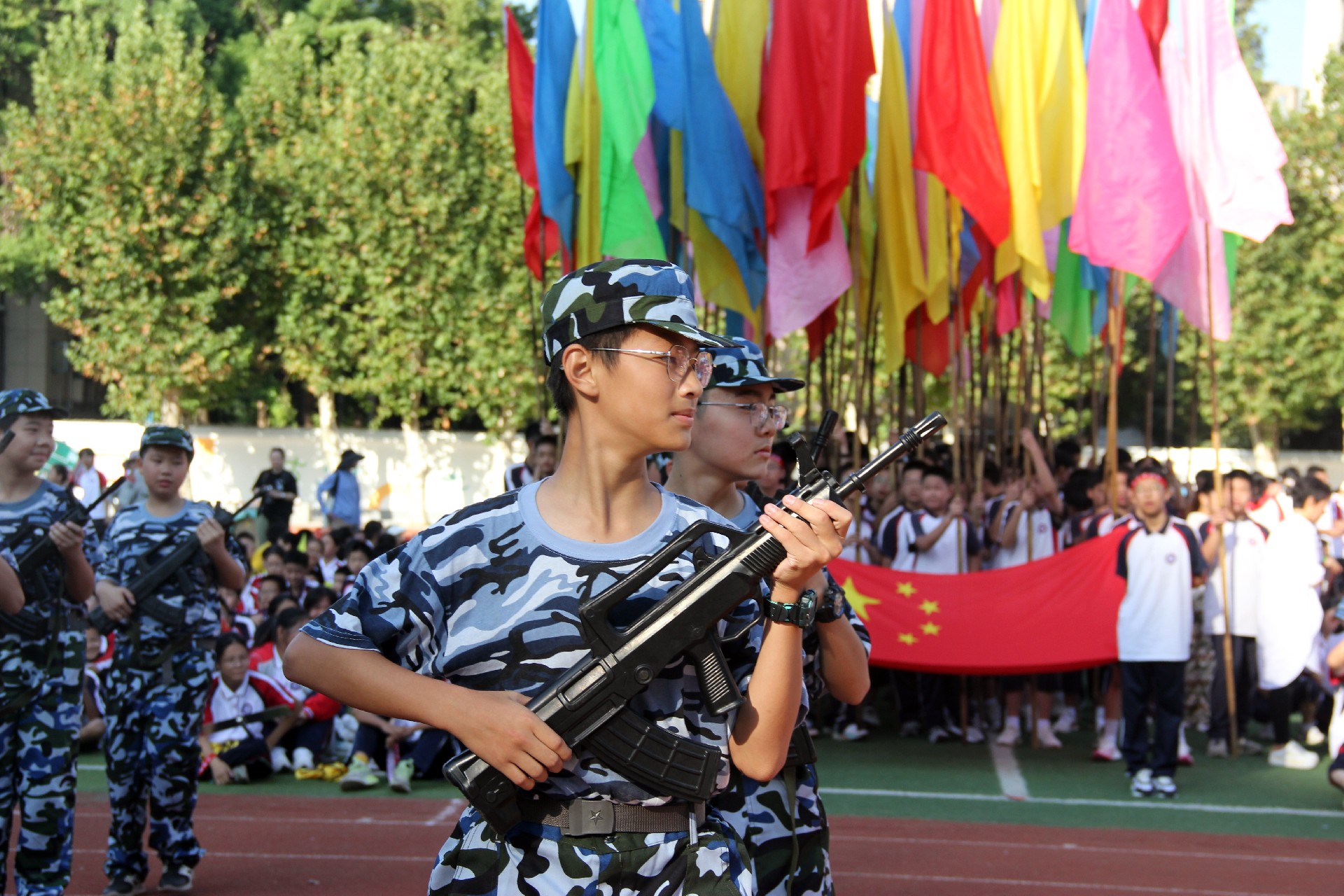 今日赛场齐拼搏,共创辉煌放光彩。迎面走来的是初二(3)班代表队。“宗之潇洒美少年,举殇白眼望青天”。他们步伐坚毅,身着迷彩,脚下击打节拍飞扬;他们眼中有光,手握长枪,双眸迸发活力向上。鹰击长空不足以概括他们的神勇,英姿飒爽不足以诠释他们的蓬勃!少年意气风发,心怀梦想,何惧道阻且长!