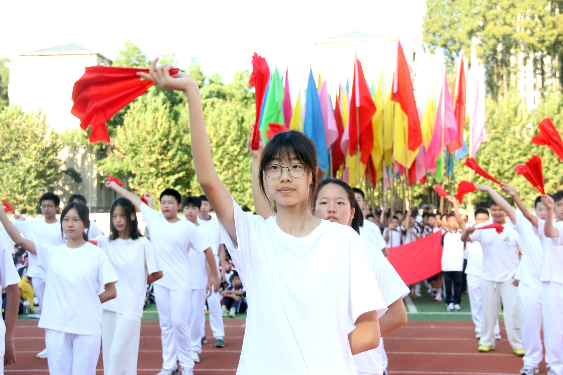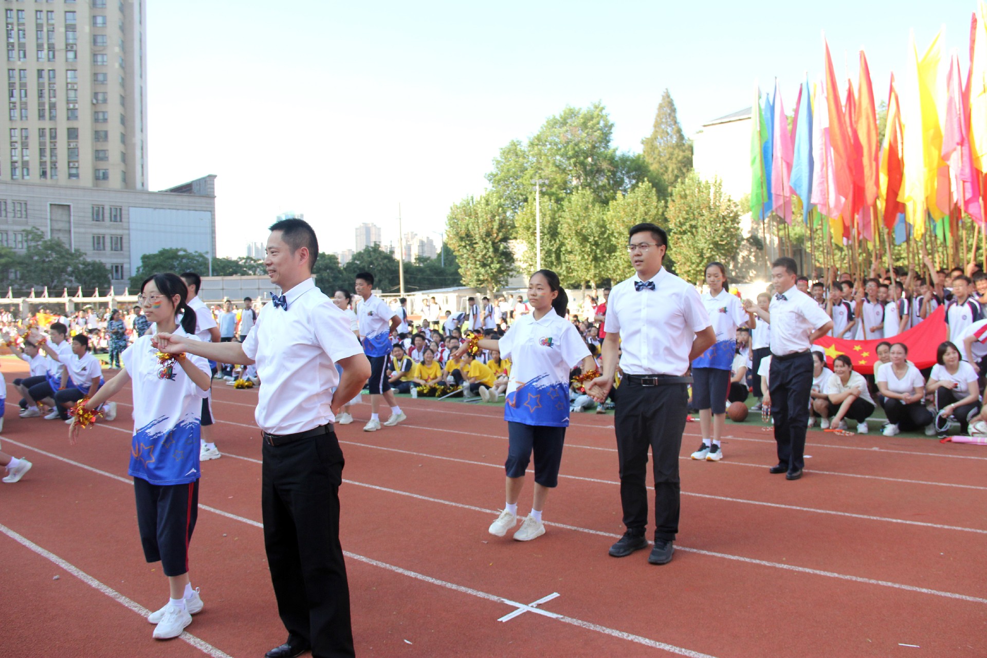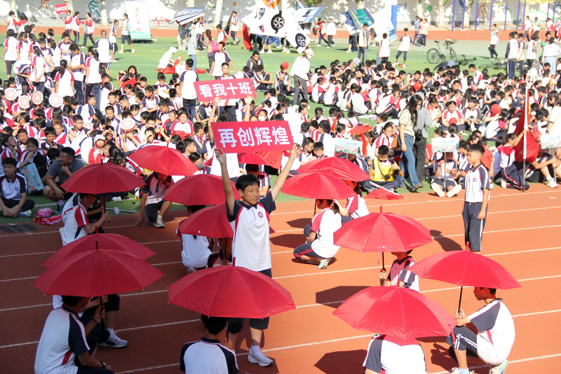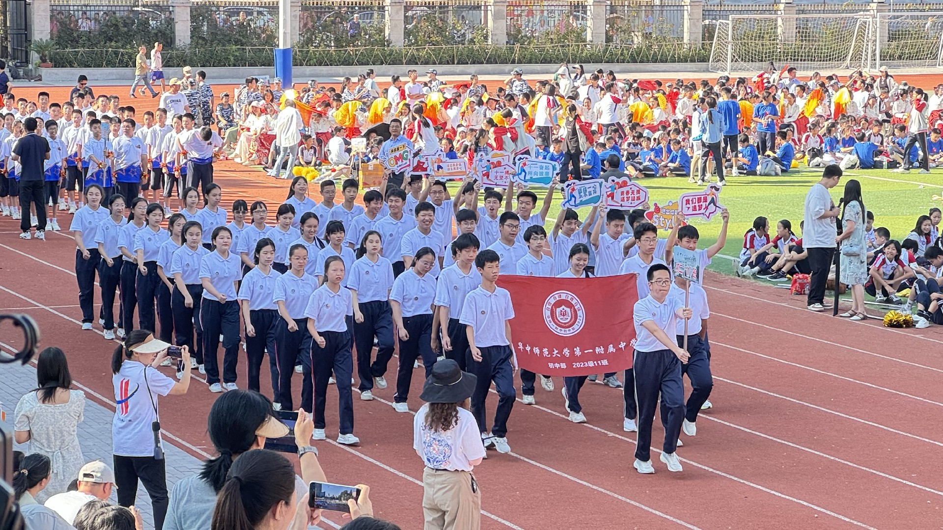 而今,这份精神跨越千山万水,来到了华一初的校园。开幕式上,彩旗飘扬,鼓声震天,各班级方阵踏着青春的节拍,仿佛是一支支即将出征的勇士队伍,满怀激情地步入会场。他们的脸上洋溢着对体育的热爱,眼中闪烁着对胜利的渴望。