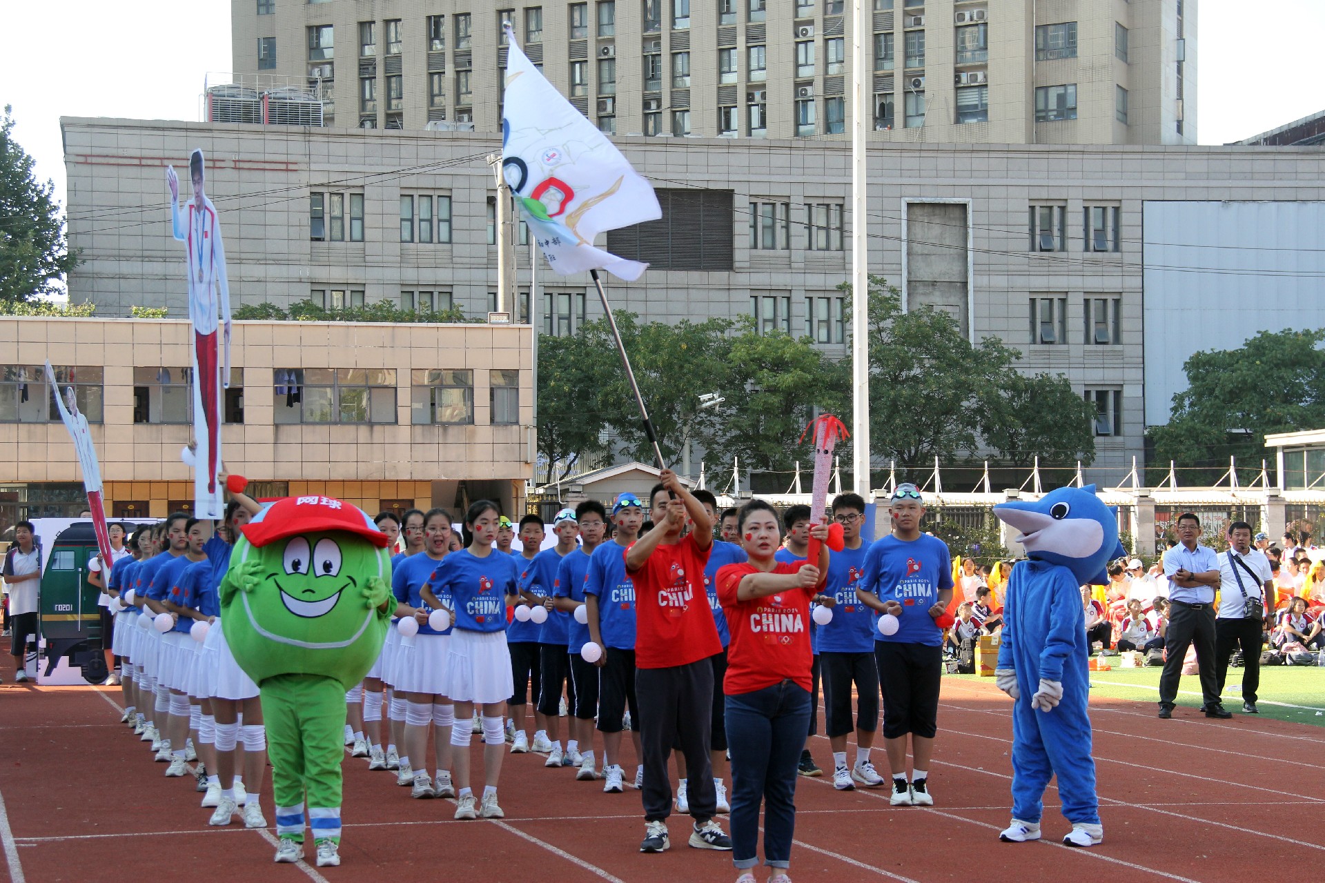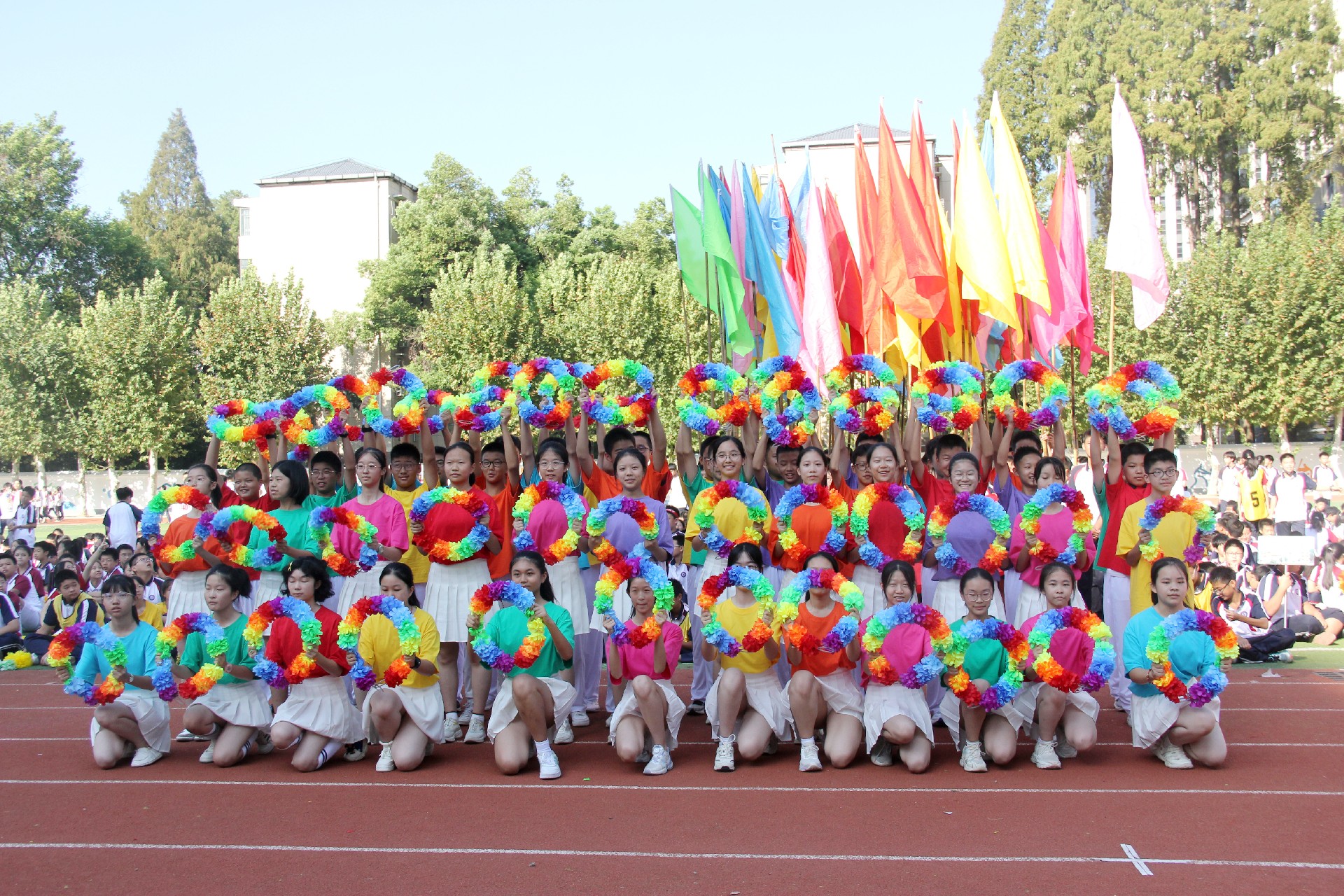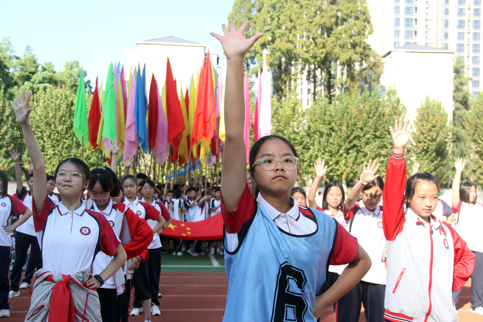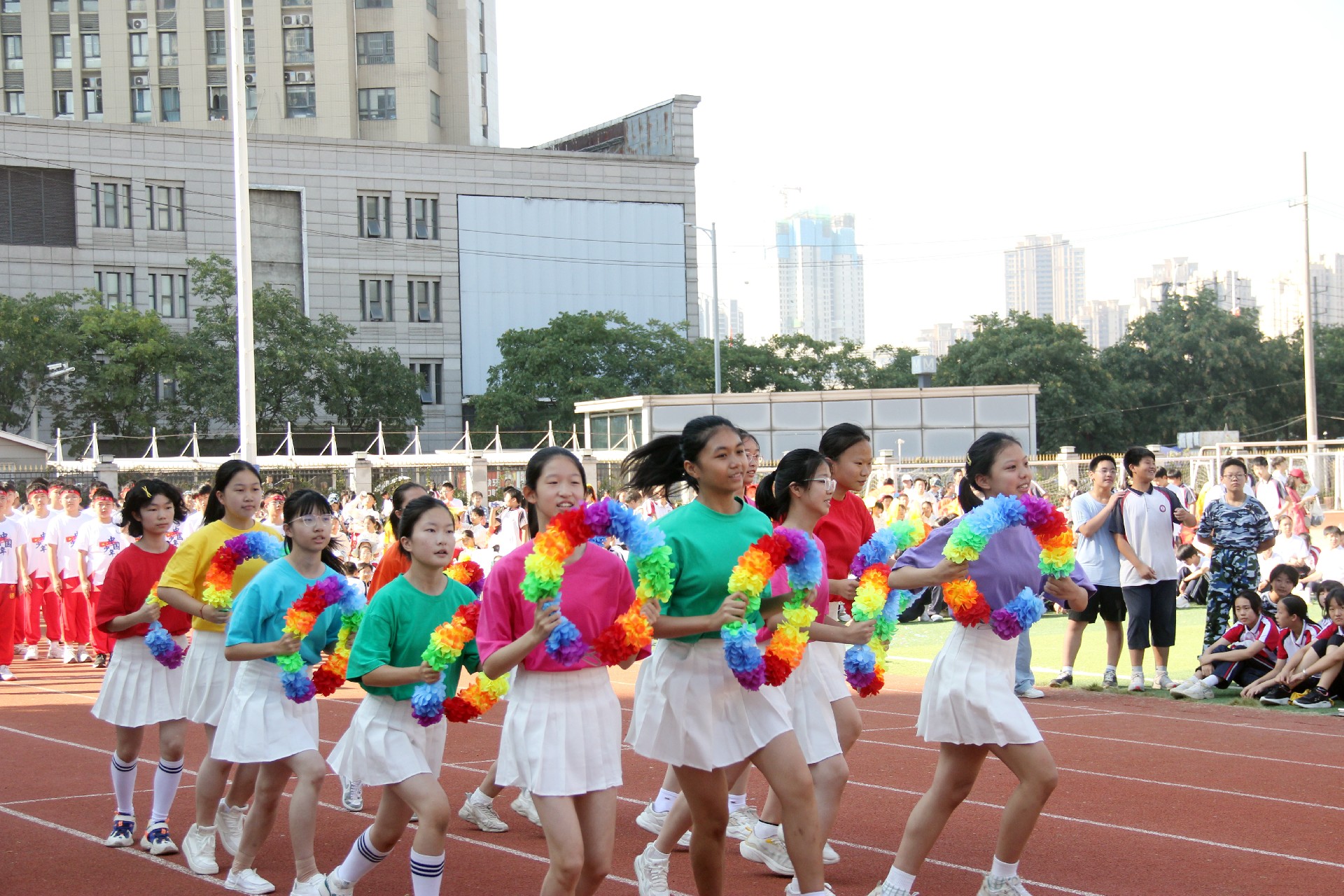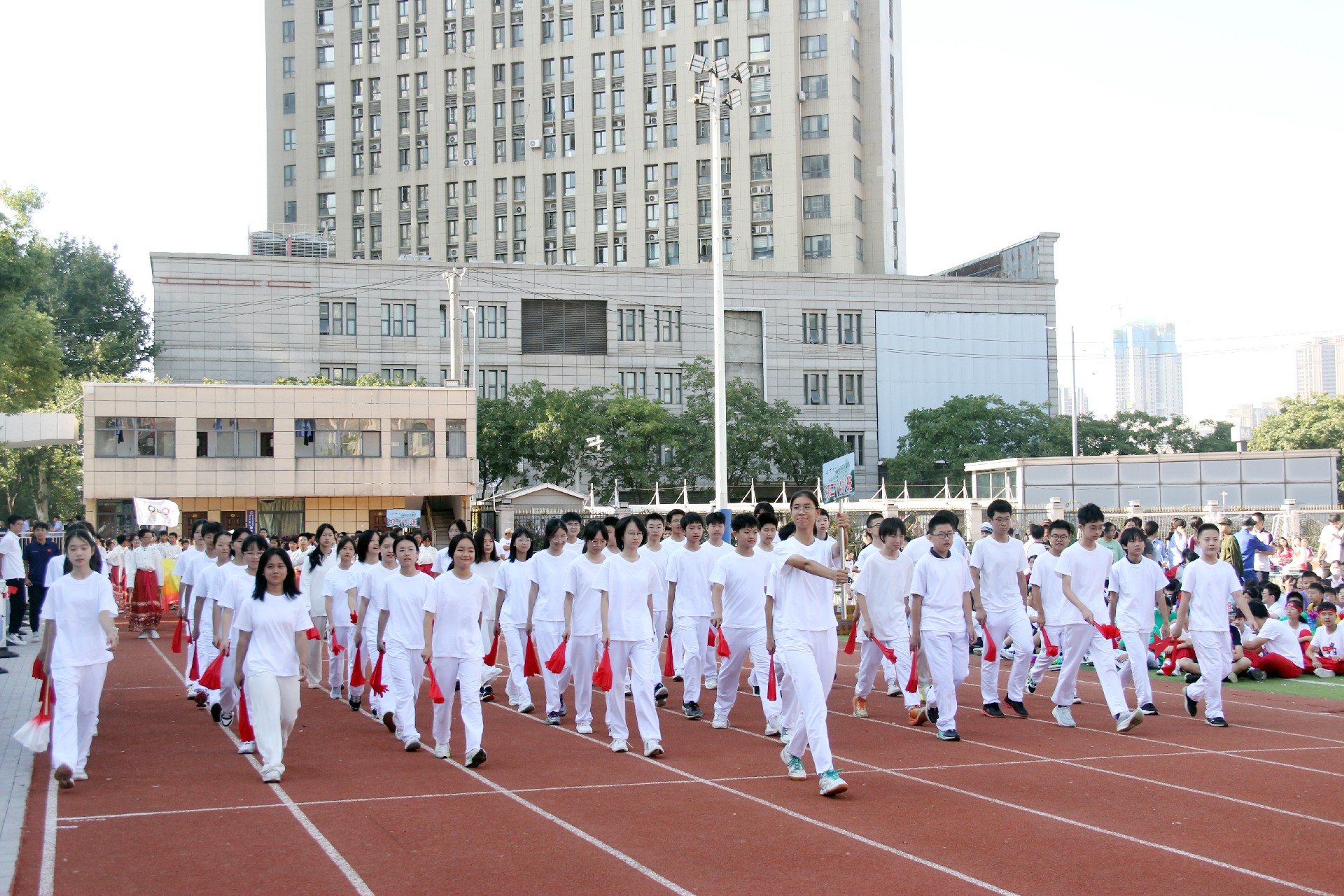 而今,这份精神跨越千山万水,来到了华一初的校园。开幕式上,彩旗飘扬,鼓声震天,各班级方阵踏着青春的节拍,仿佛是一支支即将出征的勇士队伍,满怀激情地步入会场。他们的脸上洋溢着对体育的热爱,眼中闪烁着对胜利的渴望。
