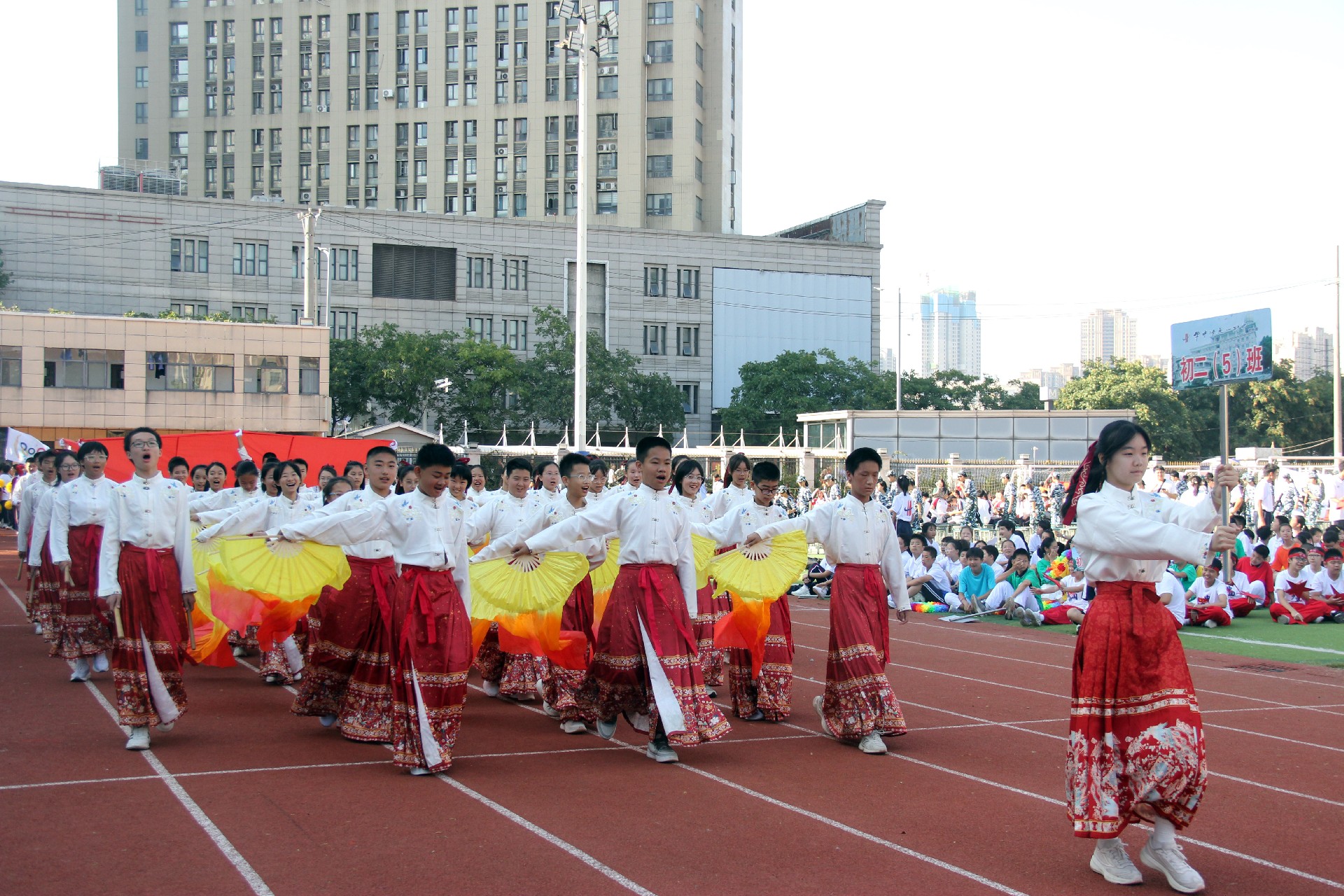 红扇飘舞,剑指东方。别样的风采,昂扬的斗志,迎面走来的是八年级(4)班方阵。他们各个神采飞扬,精神抖擞,迈着矫健的步伐奔向更快、更高、更强的自我。