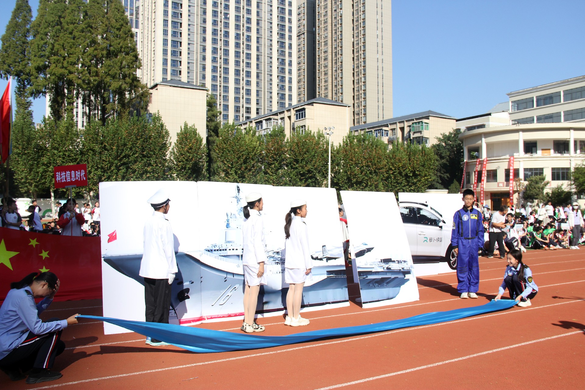 迎面向我们走来的是809班,他们携新中国科技蜕变而来,从蒸汽轰鸣到复兴号飞驰,无人驾驶引领未来,航母深蓝彰显国威。新一代青年立誓:勤学不辍,以科技为翼,报国图强,共筑强国梦。今日赛场展英姿,明日科技创辉煌!