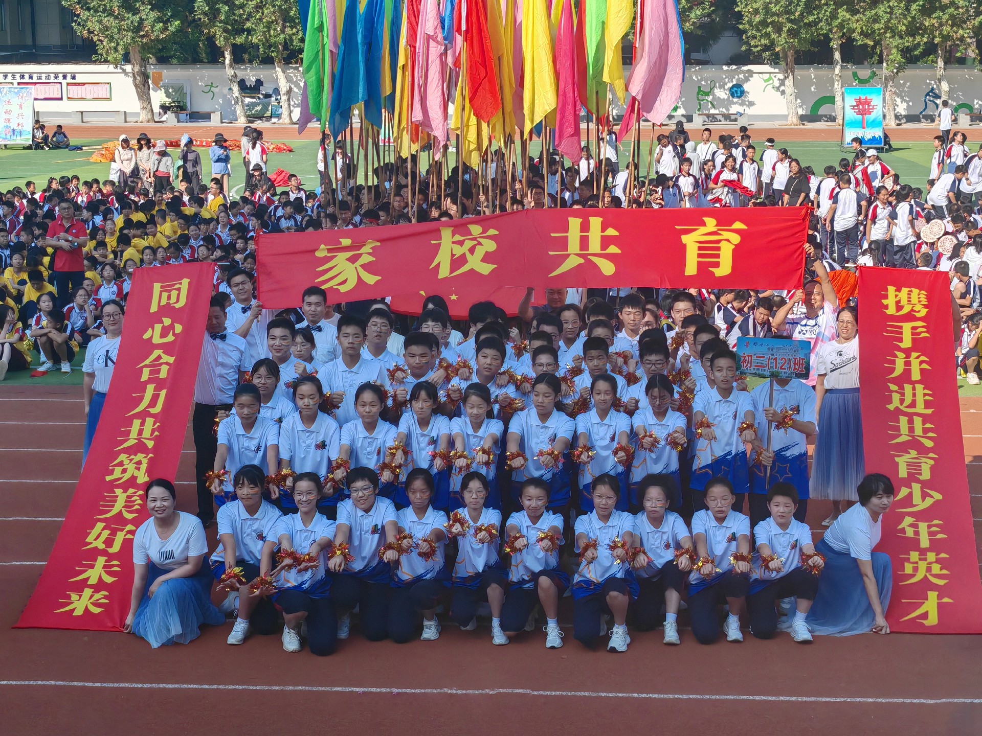 迎面走来的是812班。他们以整齐的队列,昂扬的斗志,展现青春的活力和集体的凝聚力。812班的家长们也倾情参与了本次开幕式演出,家长与师生携手并肩,同育少年英才,以爱为舟,智慧为帆,共筑孩子们的美好未来,让梦想在协同努力下绽放光彩。