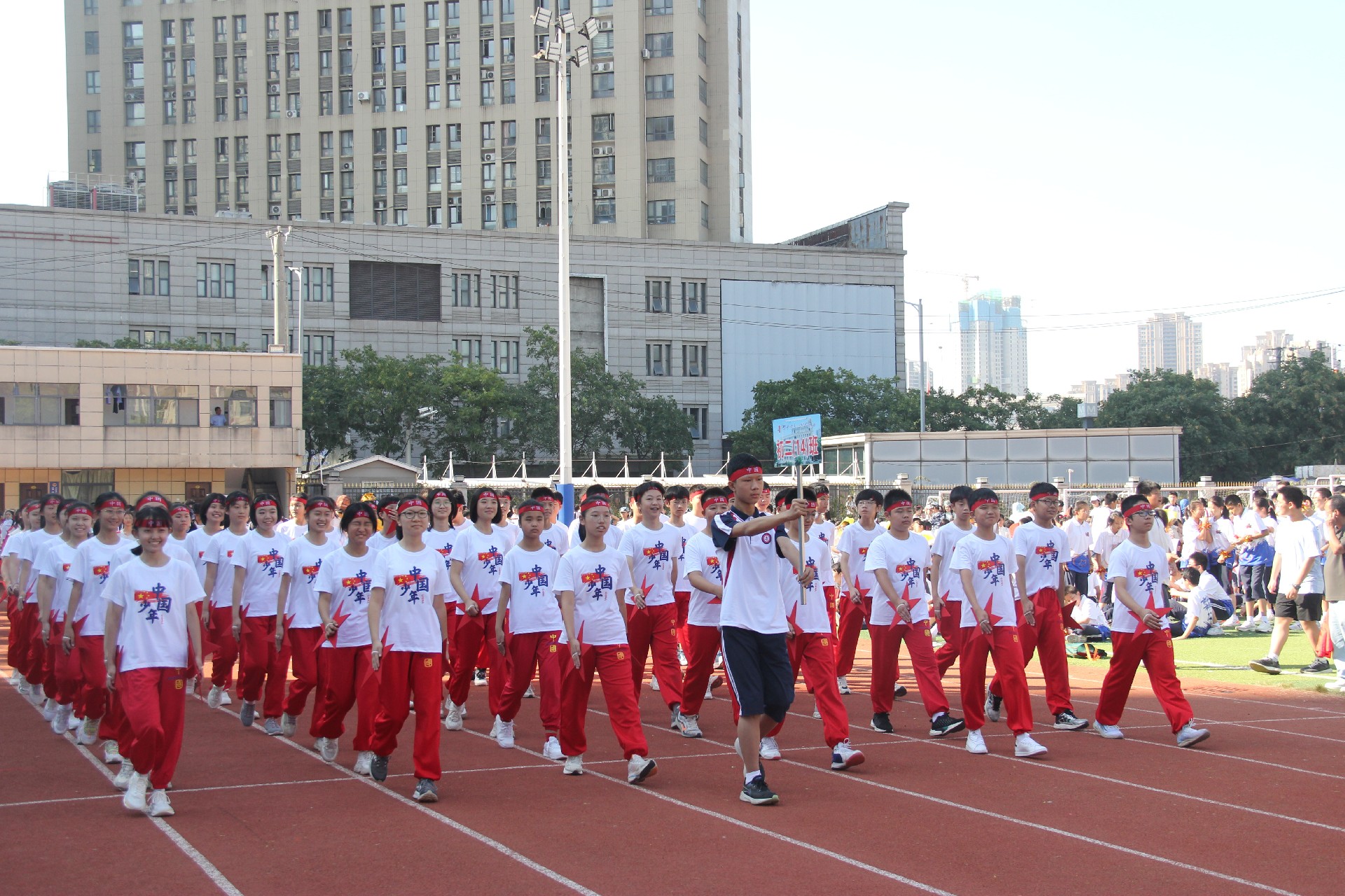 看啊,811班正迈着矫健的步伐向我们走来,每位同学的脸上都洋溢着幸福的笑容,每个人的身上都充满了青春的气息。朝阳如黄金般洒向大地,照耀在每一位同学的身上,熠熠生辉。那份独属于青少年的生机与活力在他们身上体现的淋漓尽致。