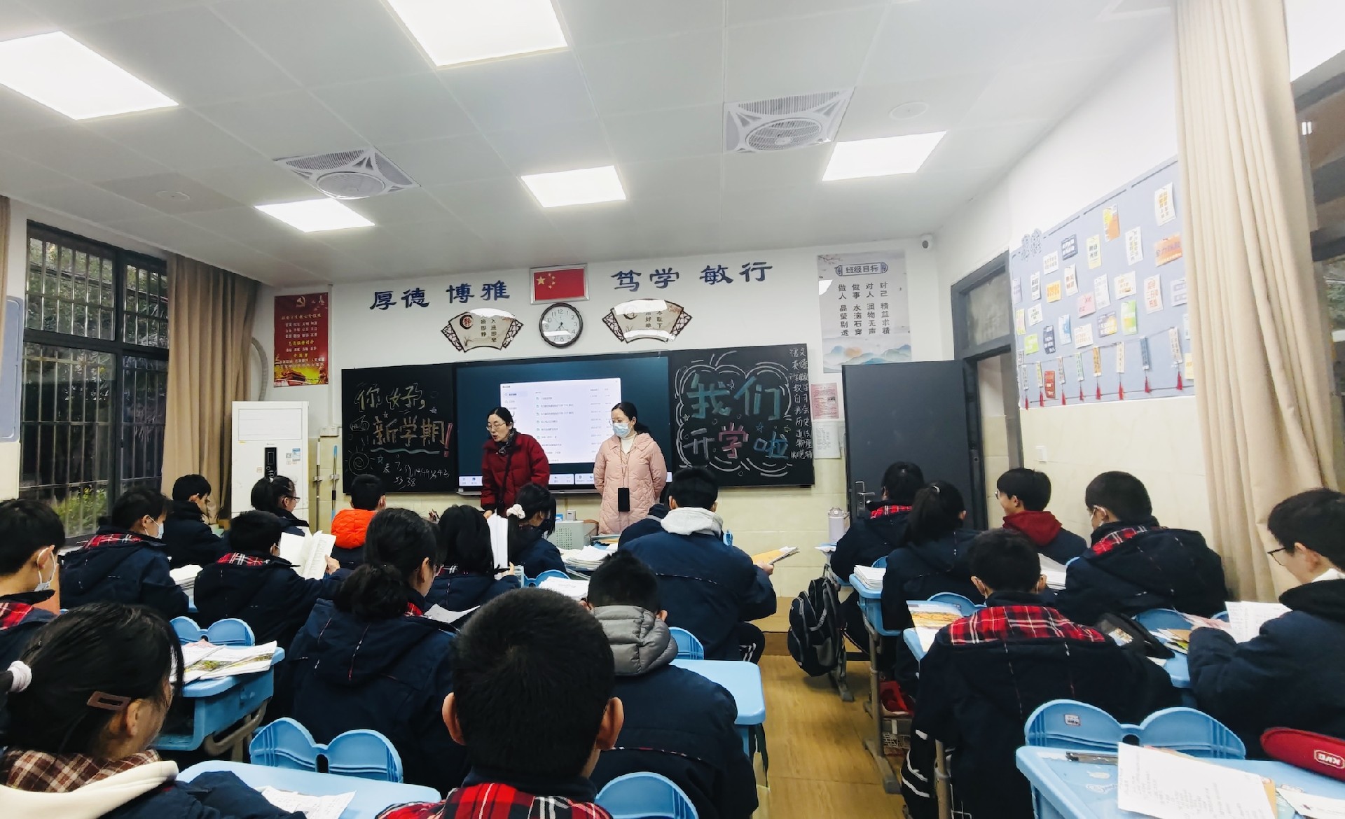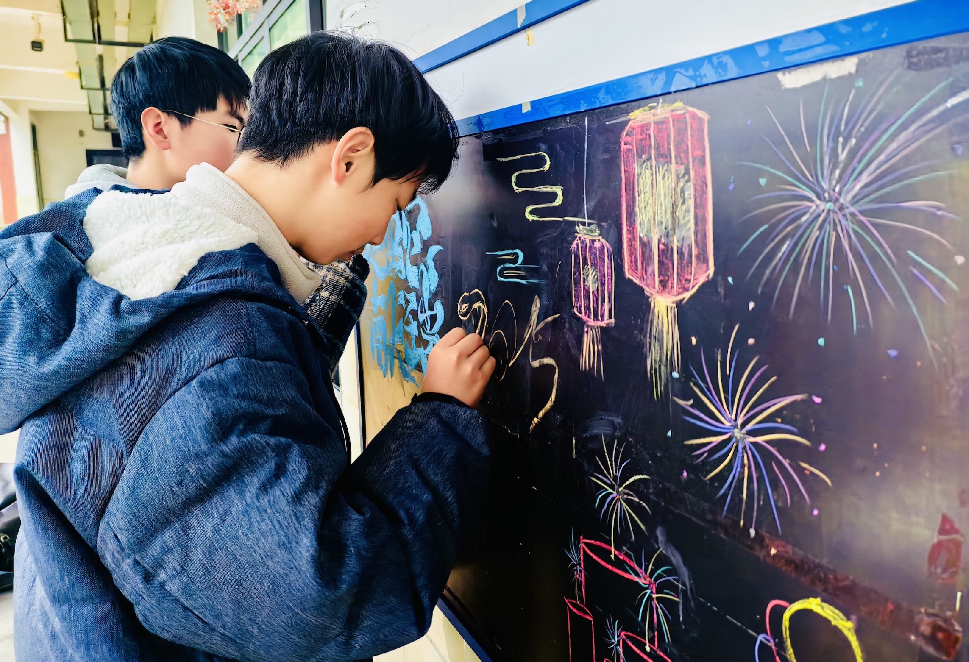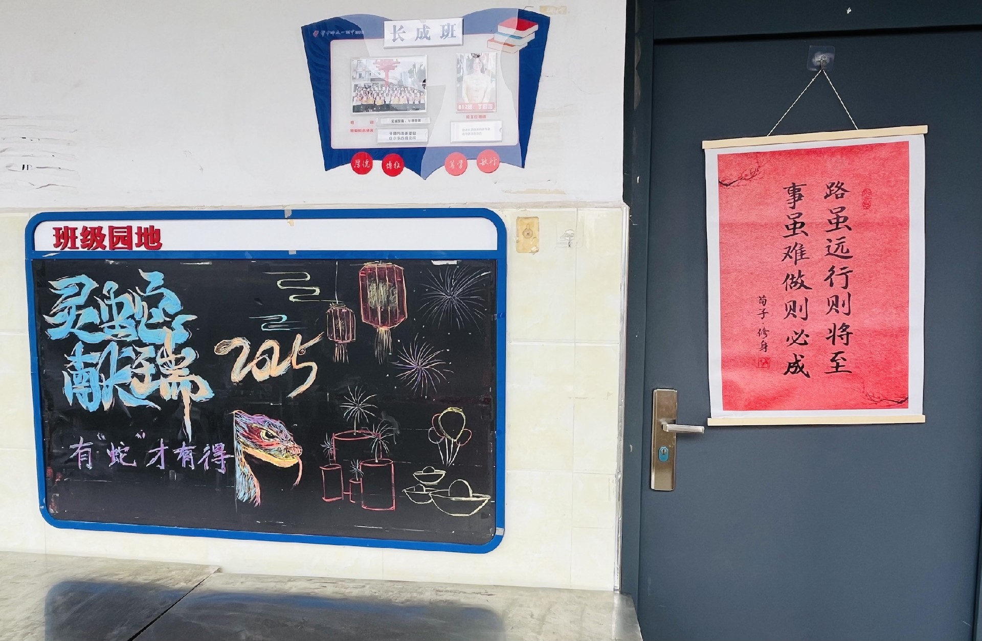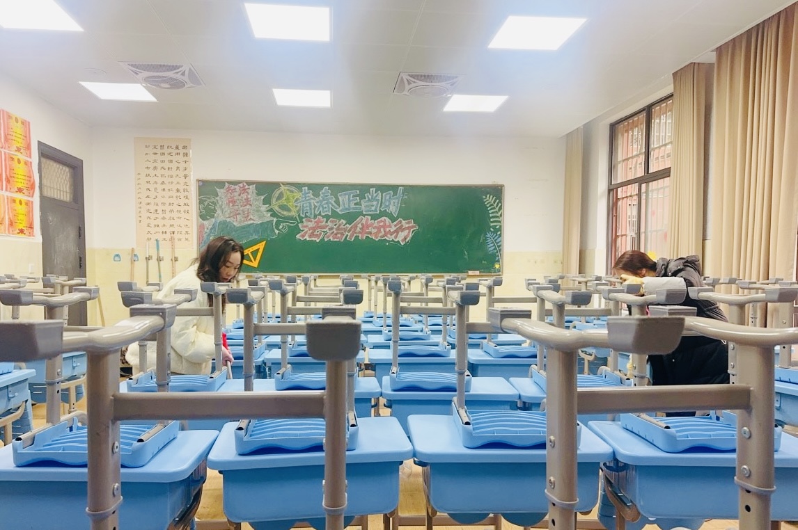 教室是梦想生长的沃土。家长与学子执帚并肩,将方寸天地装点成知识的殿堂。窗明几净处,有竖立整齐的桌椅静待墨香;一笔一画间,有暖心的新年寄语悄然生长。当清晨第一缕阳光拂过崭新的年级宣传板,每个角落都在诉说教育的温度。