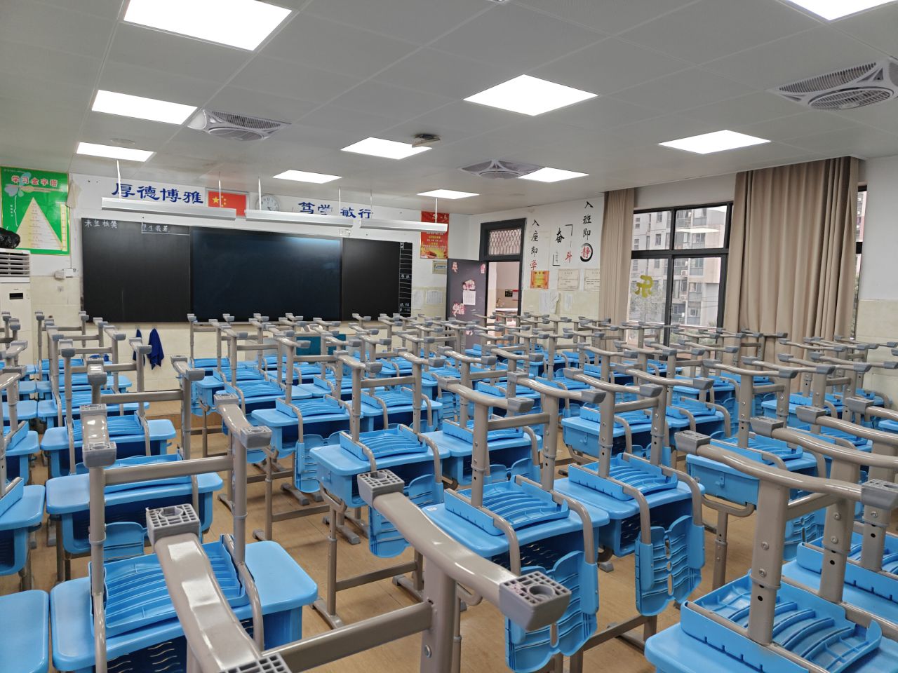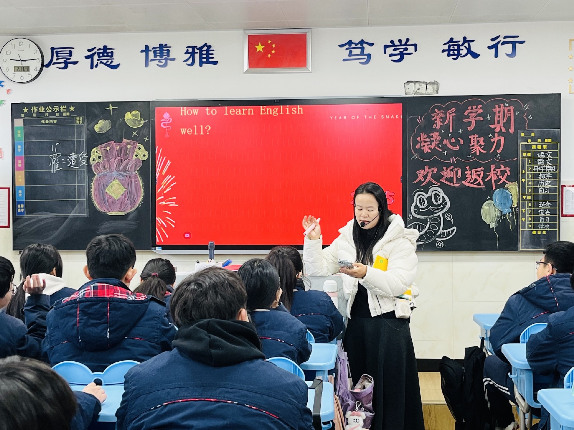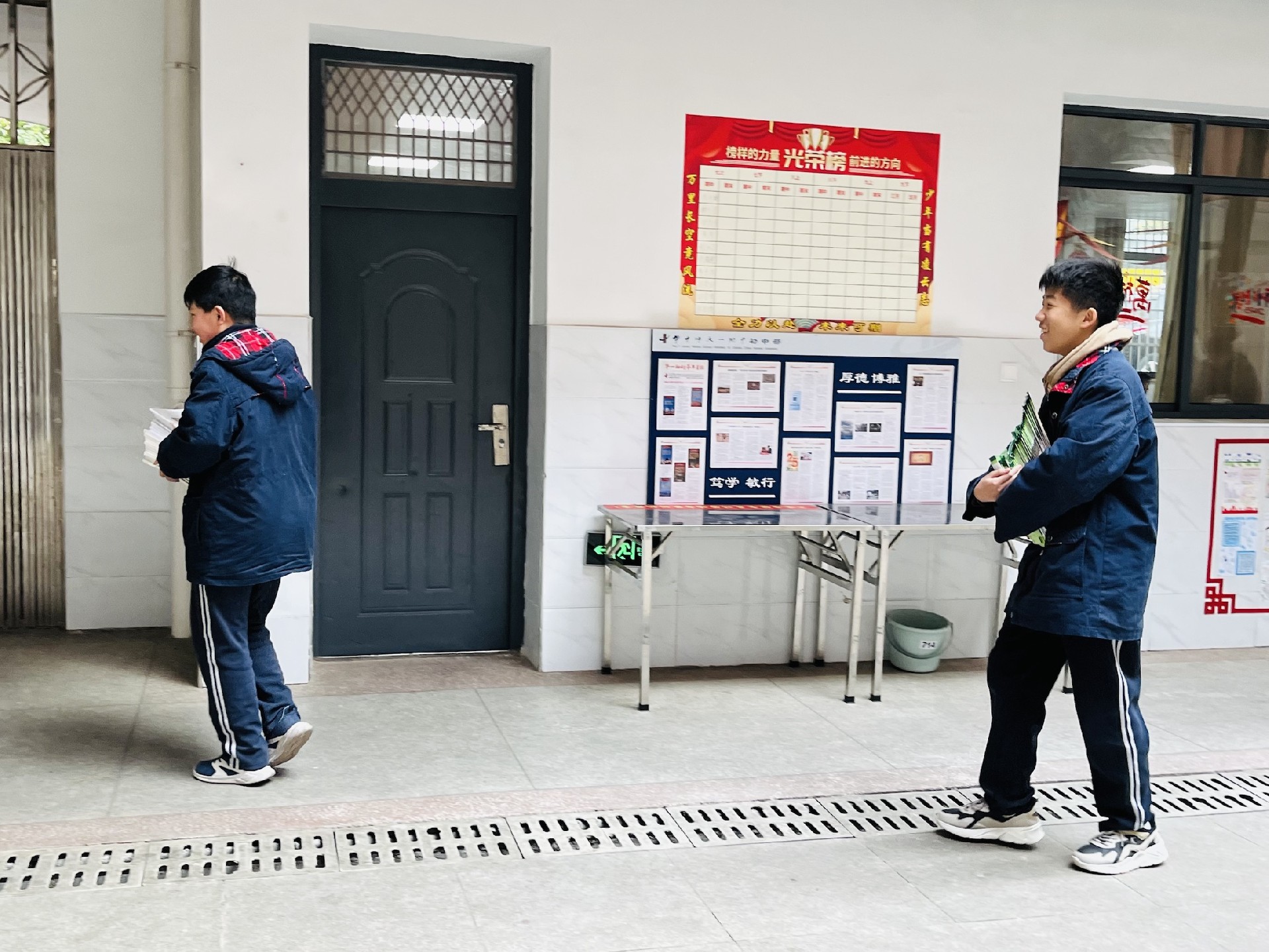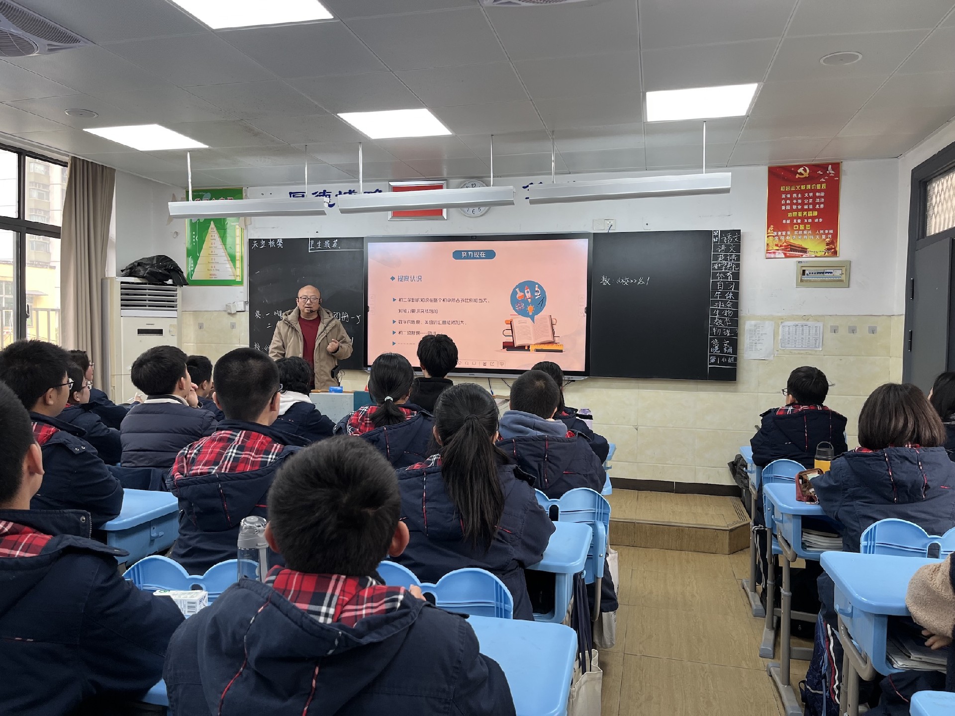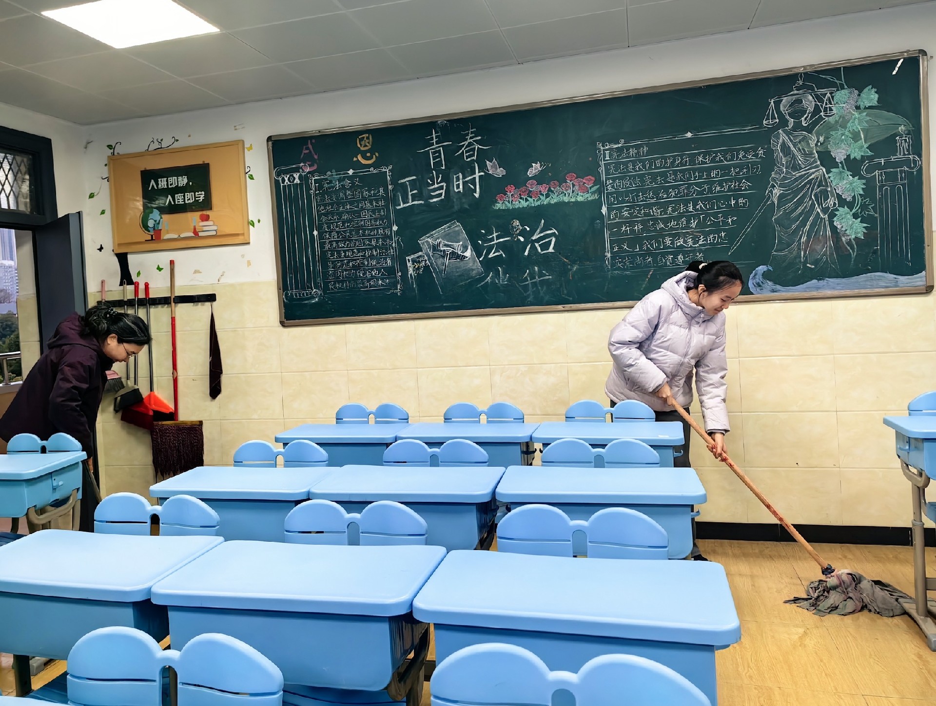 教室是梦想生长的沃土。家长与学子执帚并肩,将方寸天地装点成知识的殿堂。窗明几净处,有竖立整齐的桌椅静待墨香;一笔一画间,有暖心的新年寄语悄然生长。当清晨第一缕阳光拂过崭新的年级宣传板,每个角落都在诉说教育的温度。