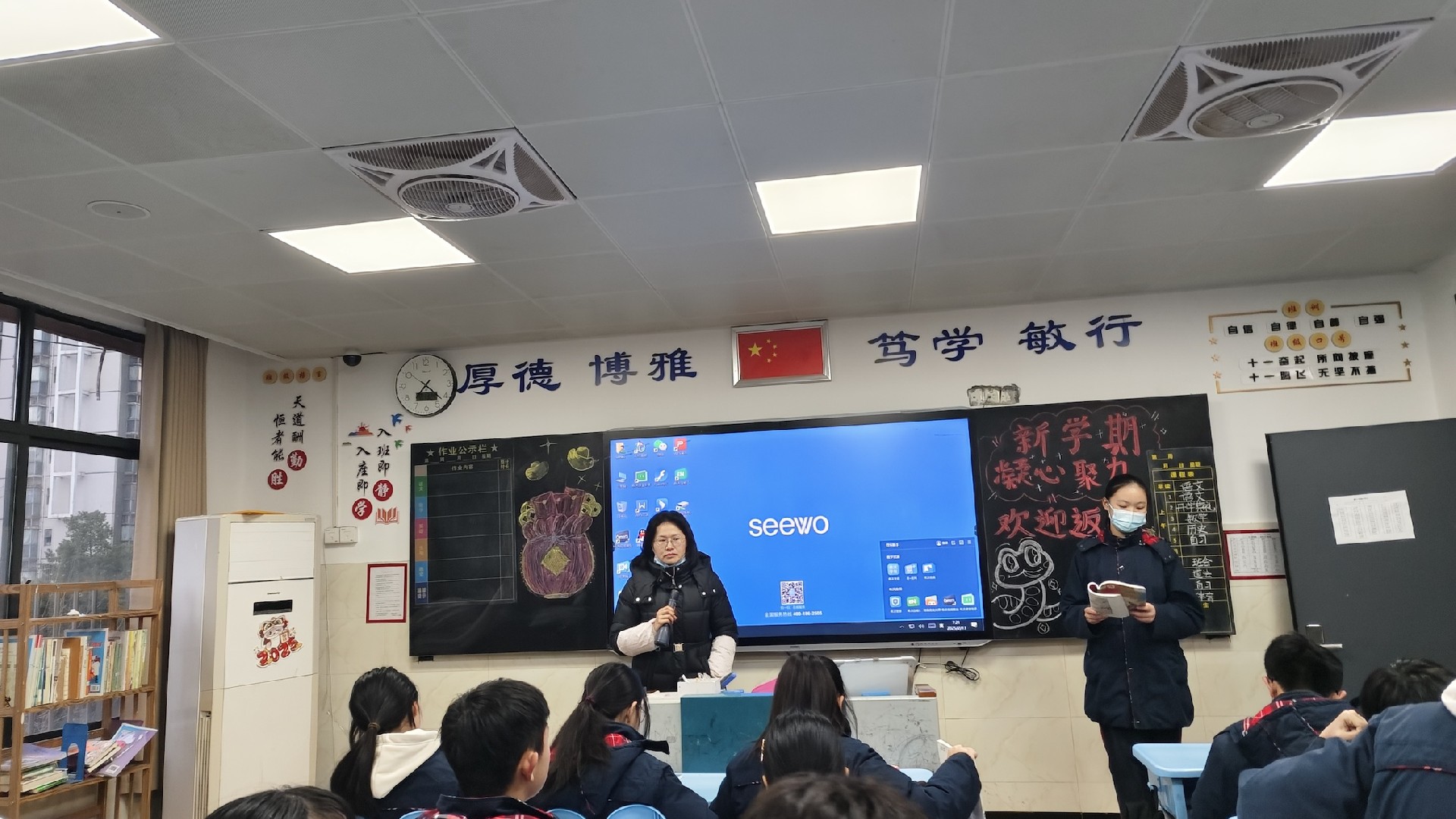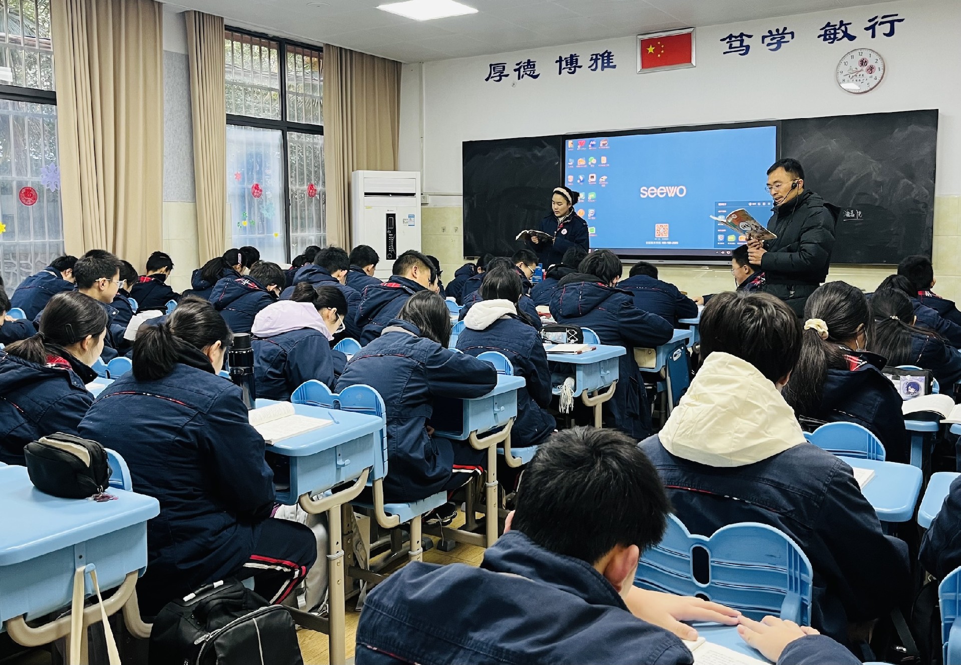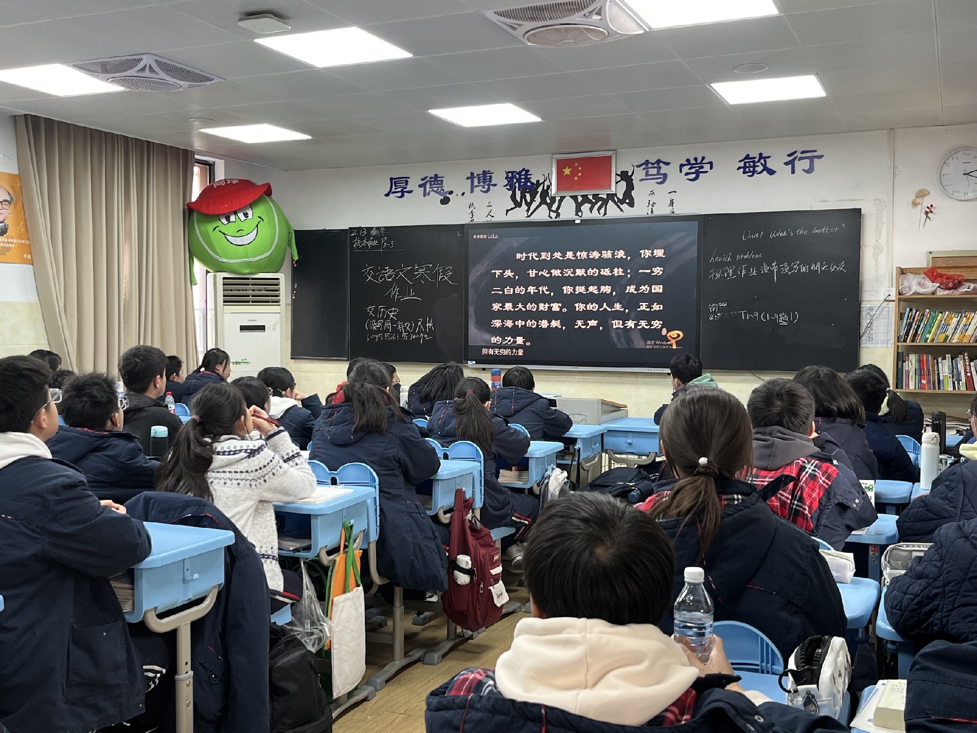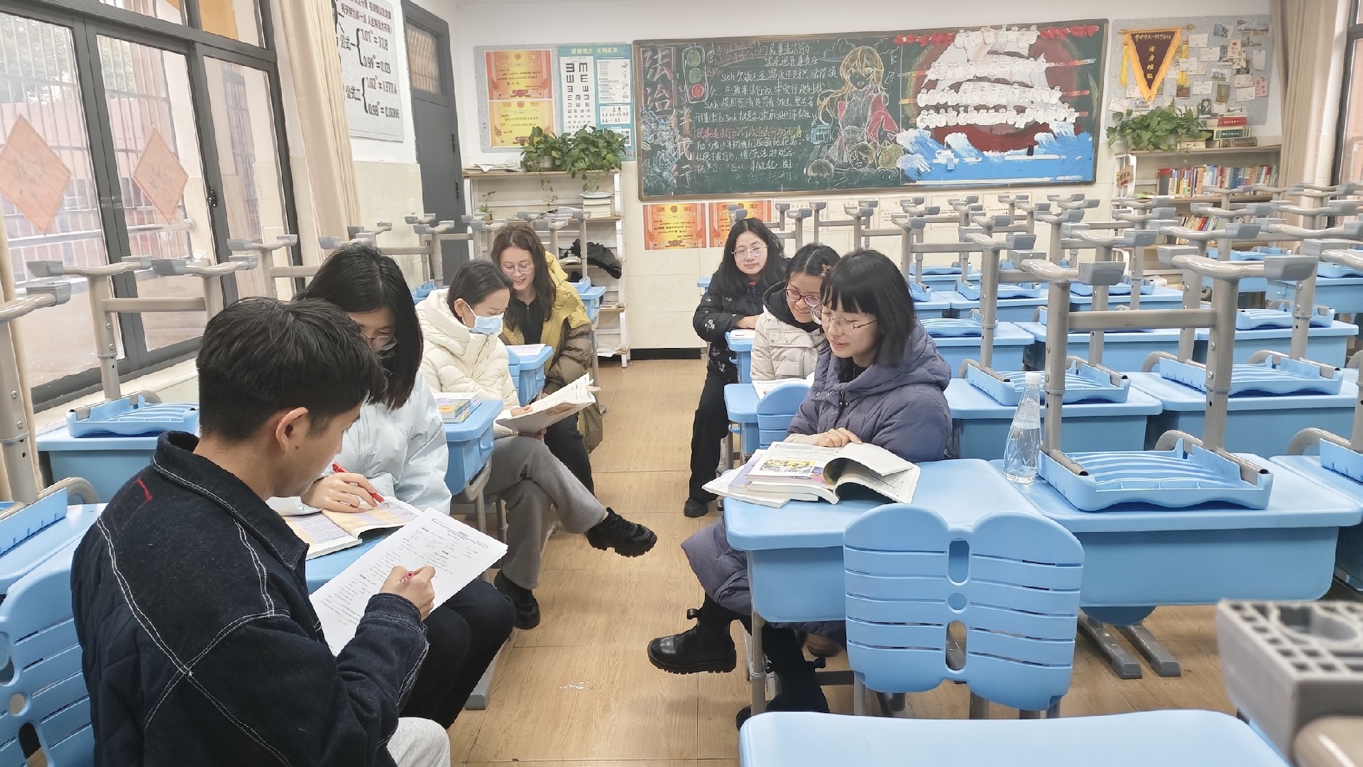 教室是梦想生长的沃土。家长与学子执帚并肩,将方寸天地装点成知识的殿堂。窗明几净处,有竖立整齐的桌椅静待墨香;一笔一画间,有暖心的新年寄语悄然生长。当清晨第一缕阳光拂过崭新的年级宣传板,每个角落都在诉说教育的温度。