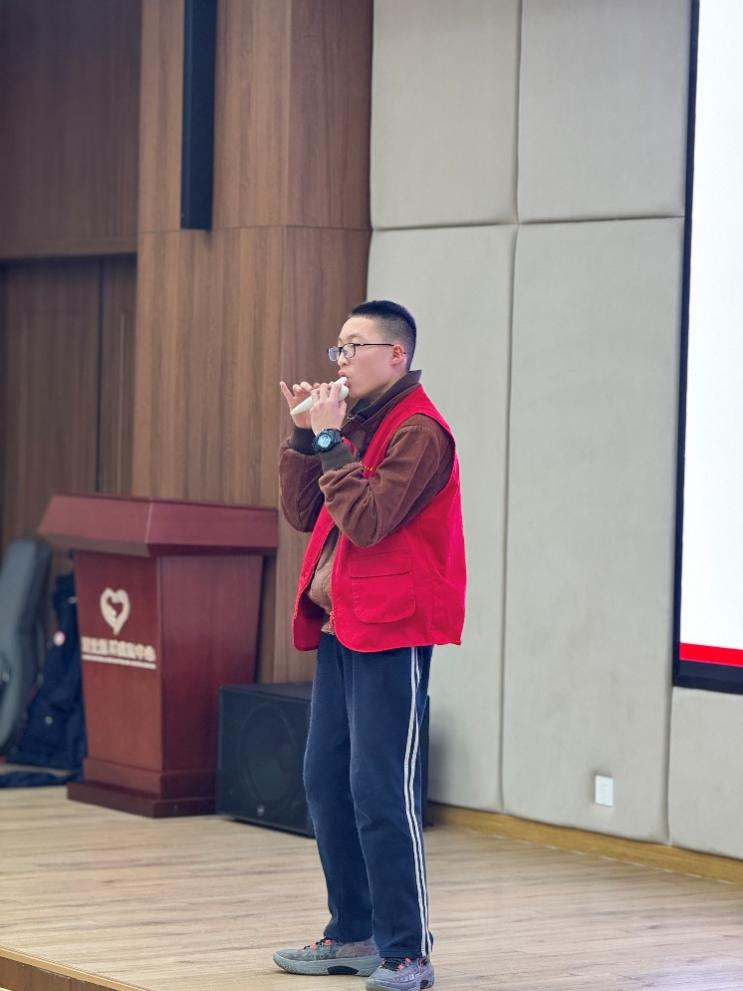 同学们首先给爷爷奶奶们献上了一场精彩纷呈的节目表演。A1组带来的开场舞《最炫民族风》以悦动的旋律瞬间引燃全场,青蛙人偶则以憨萌舞步掀起第二波欢乐浪潮。A2组的诗朗诵《掌心里的秋阳》是一首献给时光深处的守望者的深情告白,同学们用诗意的语言深情演绎了"您陪我长大,我伴您变老"。付茂嘉的钢琴独奏《夜莺在歌唱》如月光轻泻,轻轻拨动着在场每一个人的心弦;张忆芝的独舞《丝路幻影》以敦煌飞天的飘逸姿态,让人穿越到了神秘的敦煌。最令人捧腹的当属 D1 组改编现象级古装剧《甄嬛传》的 "滴血验亲" 情景剧,幽默诙谐的台词和惟妙惟肖的表演引得在场老人开怀大笑。柳烨与汤洛熙的《如果信仰有颜色》将活动推向高潮,两位少年掷地有声的宣言 “此生无悔入华夏,来世还做中国人”诠释了新时代少年对国家和民族深沉的爱。小合唱《起风了》,吉他手的弹奏和歌声完美配合;段慕岩的陶笛独奏《故乡的原风景》曲声悠长,唤醒了爷爷奶奶们对故乡的深切眷恋和对童年的怀念。