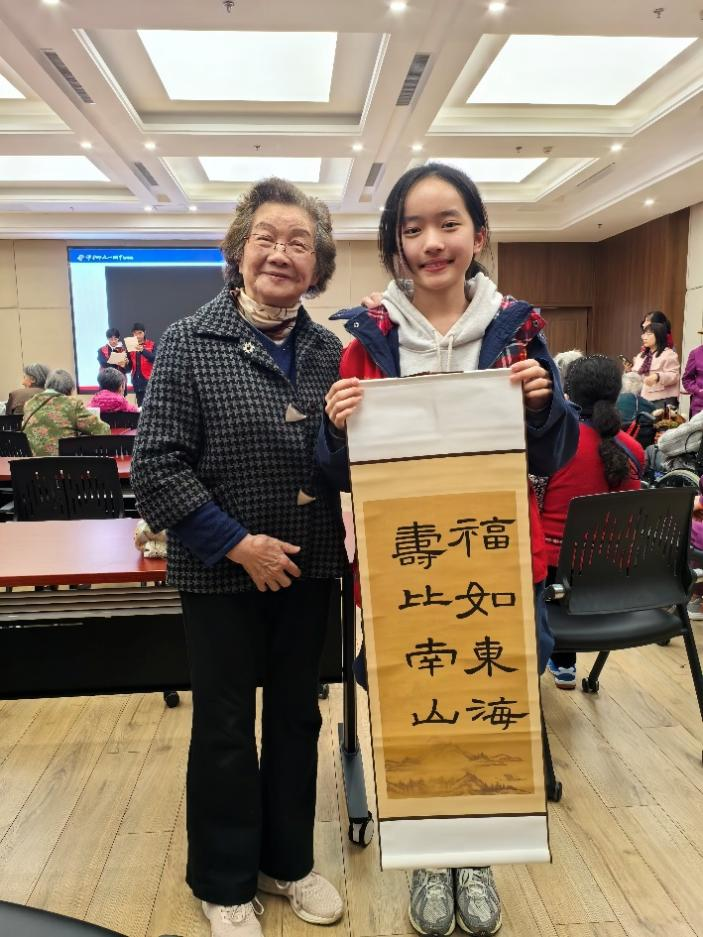 演出的最后,在《送你一朵小红花》的歌声里,同学们拿出精心准备的礼物,牛奶、绿植、鲜花、小手工、贺卡一一送到老人们手中,礼物虽小,却饱含着大家对长辈们的美好祝愿,就像郑沈芮送给奶奶的那副书法作品里写的那样,希望爷爷奶奶们“福如东海,寿比南山”。