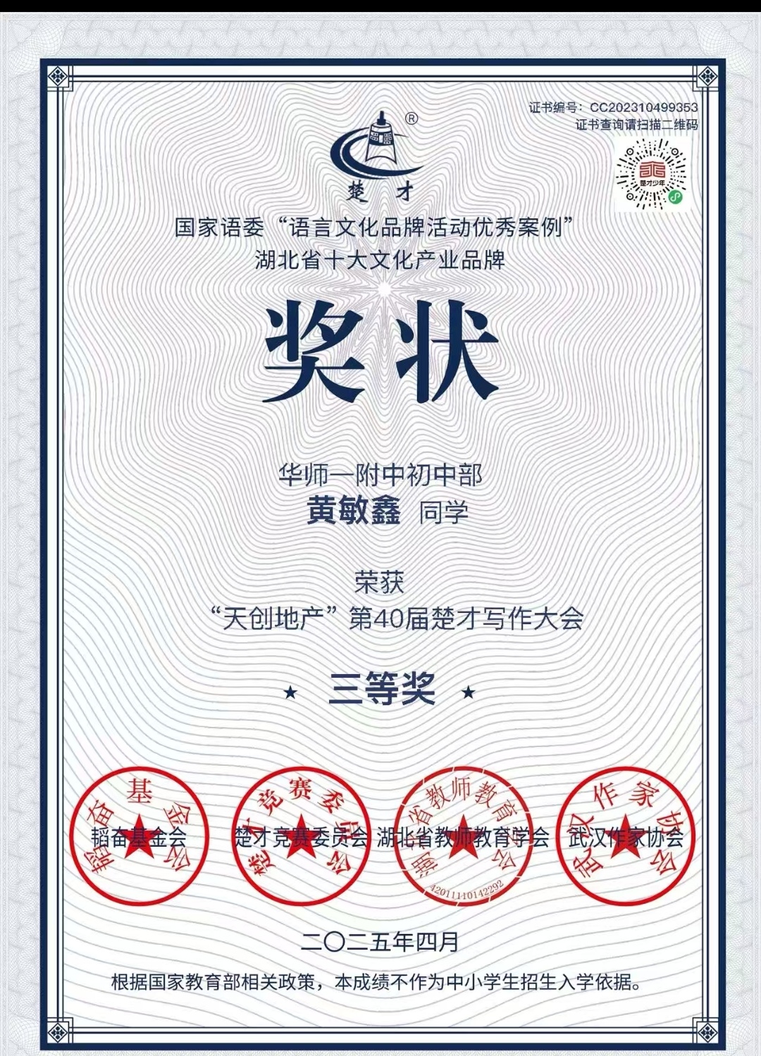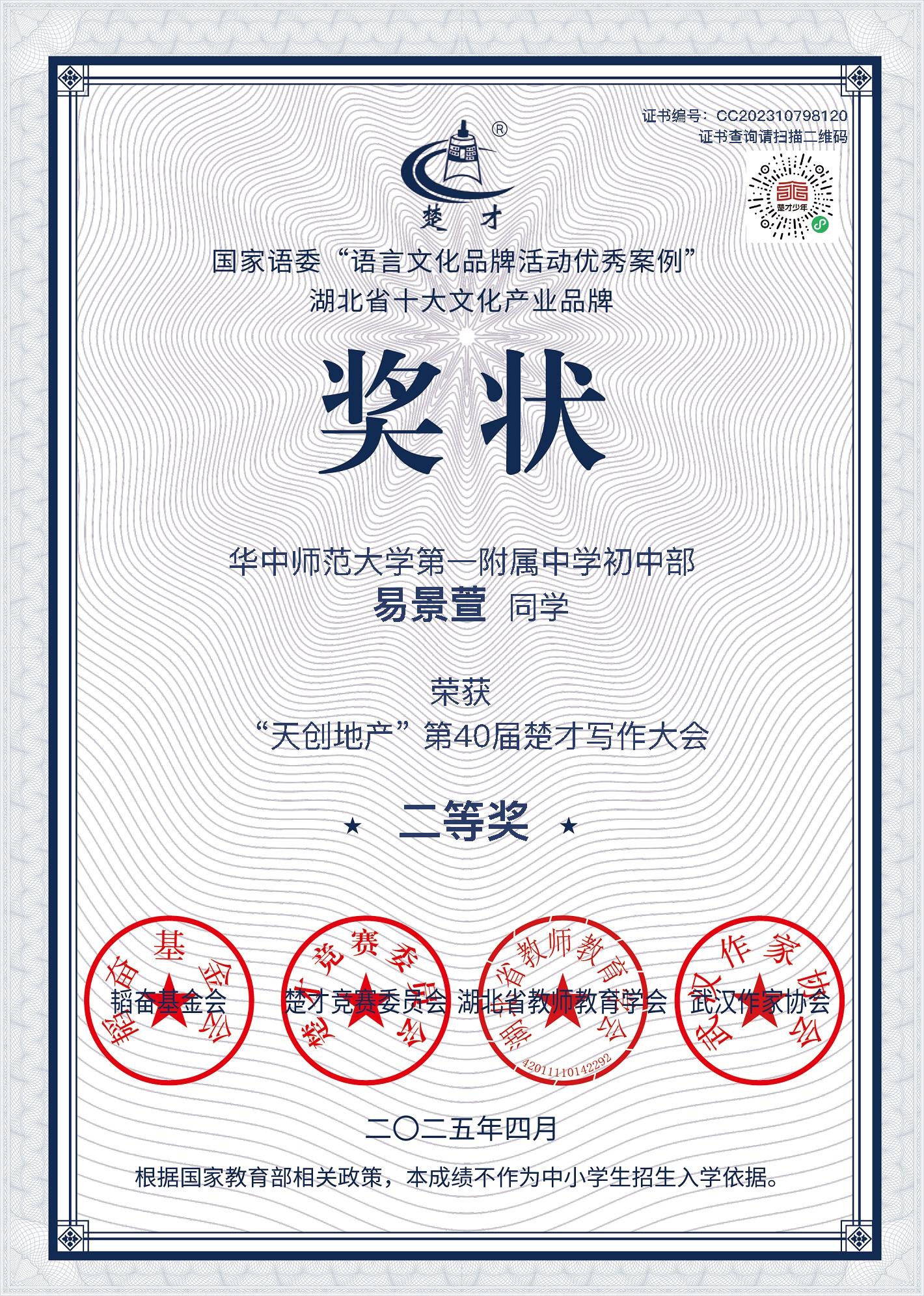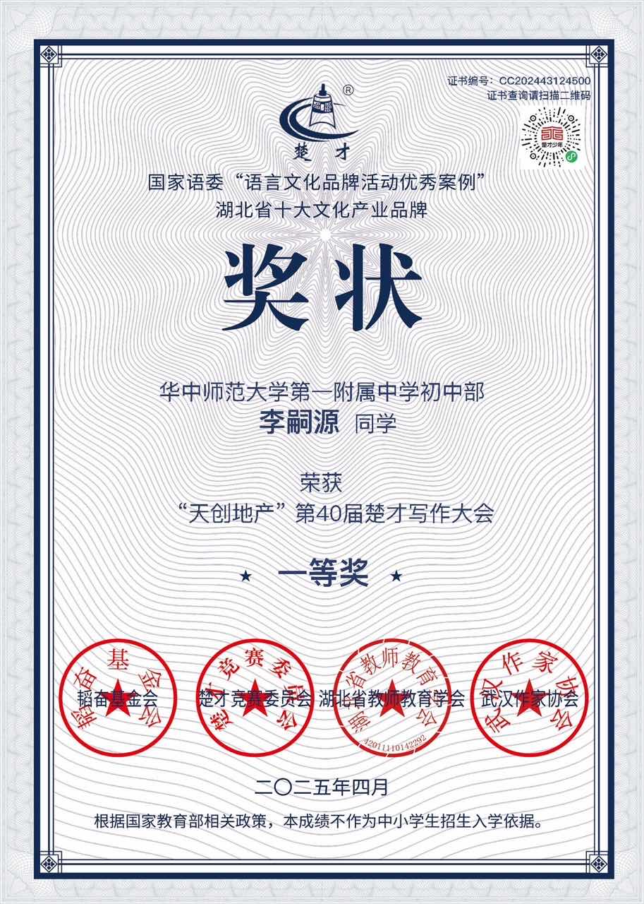 在第40届楚才杯作文竞赛中,我校八年级学子脱颖而出、斩获佳绩,为校争光!其中,一等奖4人,二等奖5人,三等奖5人。楚才之赛,以文会友,以笔载道,同学们用文字搭建起与世界对话的桥梁,将个人感悟与时代脉搏共振。愿这份荣誉化作星辰,照亮他们继续深耕文字的旅途,推动他们书写更精彩的华章。
