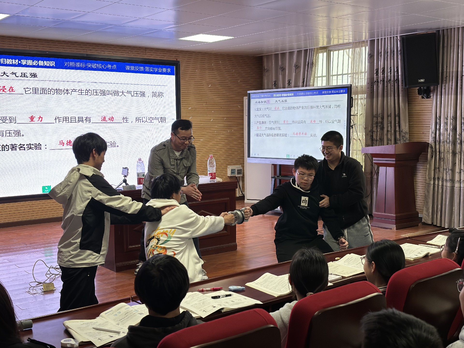 在赤矶中学,九年级物理备课组组长周豪老师为两个班的学生同步讲授“压强”一轮复习中的重点课时——《大气压强、流体压强与流速关系》。课堂借助丰富的物理实验器材,通过一系列精巧设计的实验演示,带领学生在观察、探究、归纳中构建知识体系。课程内容贴近生活、环节设计巧妙,学生积极参与、热情高涨,教学效果显著。