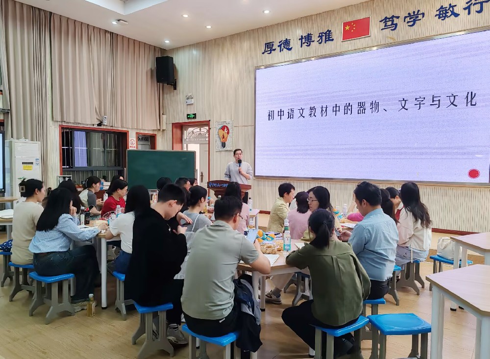 4月9日下午,华中师范大学中文系苏教授受邀来到华一初,为我校语文教研组全体教师带来了一场题为《初中语文教材中的器物、文字与文化》的专题讲座。本次活动旨在提升语文教师的专业素养,探索传统文化与现代语文教学的融合路径。 在近两个小时的讲座中,苏教授以深厚的学术功底和生动的语言,带领在场教师开启了一场汉字文化···