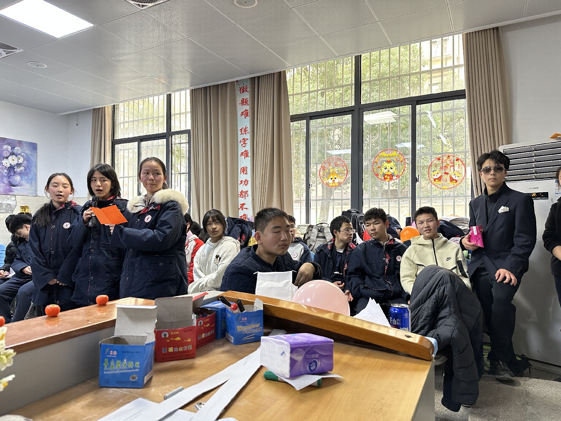 此次联欢会以班级为单位,在初三的 13 个班级中各自精彩上演。同学们齐心协力,将教室稍作布置,虽不华丽,但也满是节日的氛围。彩条轻挂,气球点缀,营造出了简单而欢快的环境。从 901 班到 913 班,每个班级都充分展现出独特的创意与活力。有的班级开展了小型的歌唱比赛,同学们用或清脆或激昂的歌声抒发着青春的情怀;有的班级进行趣味横生的知识问答和小游戏,在欢乐中增长见识、增进情谊;还有的班级组织了温馨的故事分享会,讲述过去一年里班级中的点点滴滴,那些欢笑与泪水、挫折与成长,让大家的心更加紧密相连。没有宏大的舞台,没有专业的表演,但教室里的每一个角落都洋溢着温暖与幸福,掌声、笑声、欢呼声汇聚成了一曲独特的新年乐章。