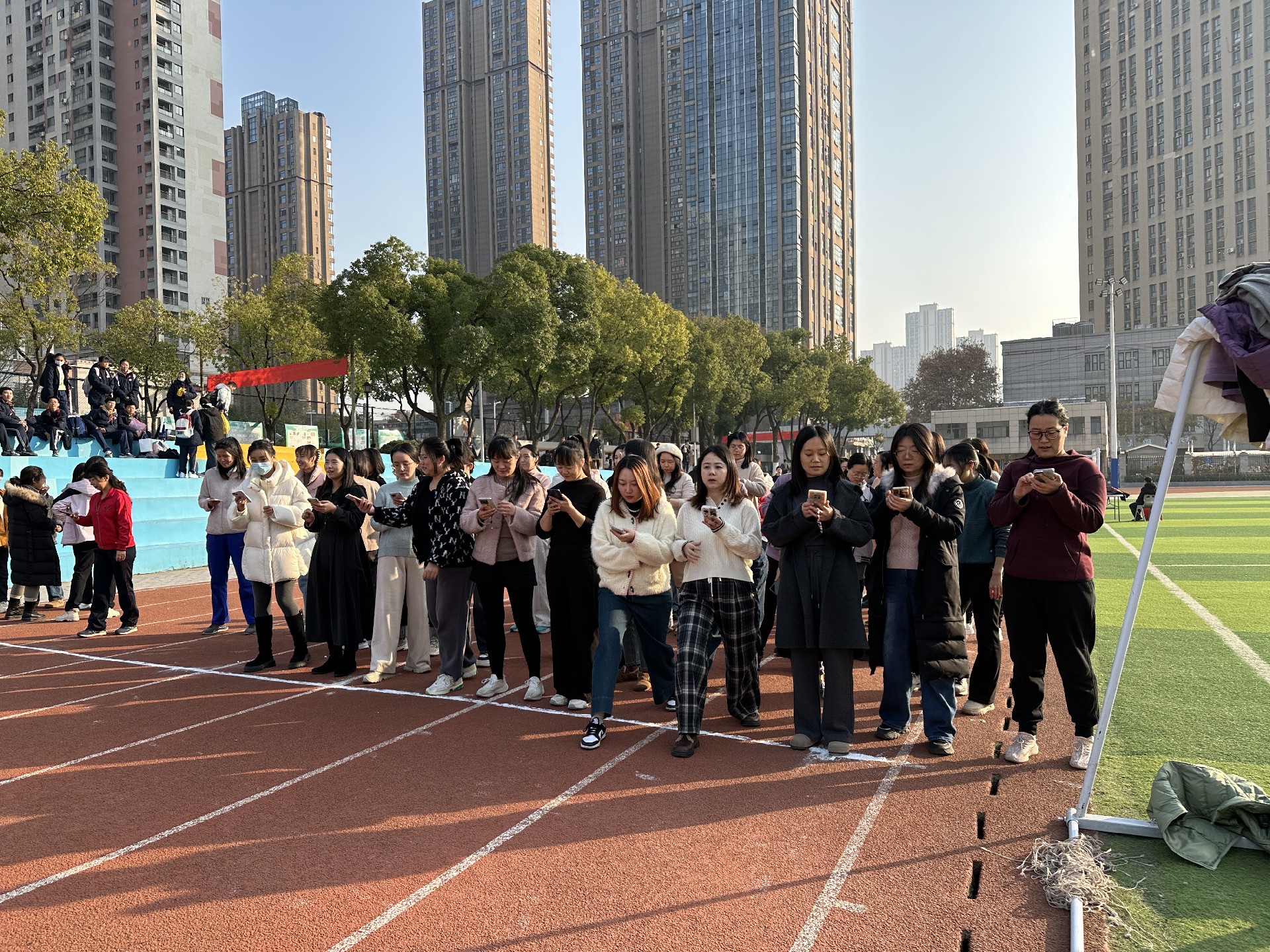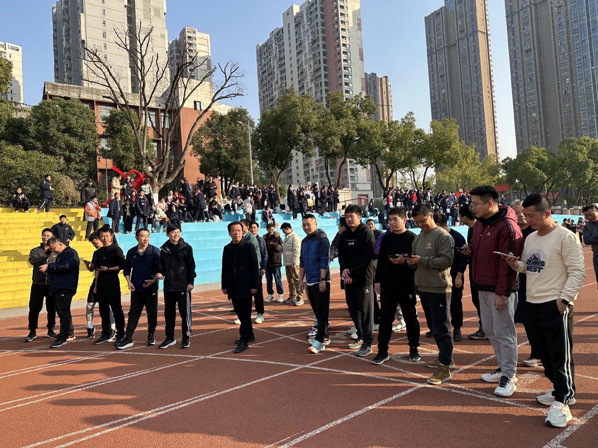 2024年12月31日下午,华师一附中初中部的田径场上一片欢腾,全体教职工齐聚于此,参与“健康奔跑,喜迎元旦”活动,以充满活力的奔跑迎接新年。此次活动意在倡导健康生活,营造元旦欢乐氛围,丰富教职工课余生活,增进教师间交流,增强团队凝聚力。15:00,教职工们在指定地点签到集合,并进行了简单的热身活动,现场洋溢着轻松愉快的氛围。 15:20,开幕式开始,江兴隆校长发表了热情洋溢的讲话,着重强调了健康生活的重要性,并向教职工们送上了美好的新年祝愿,随后宣布活动正式开始。