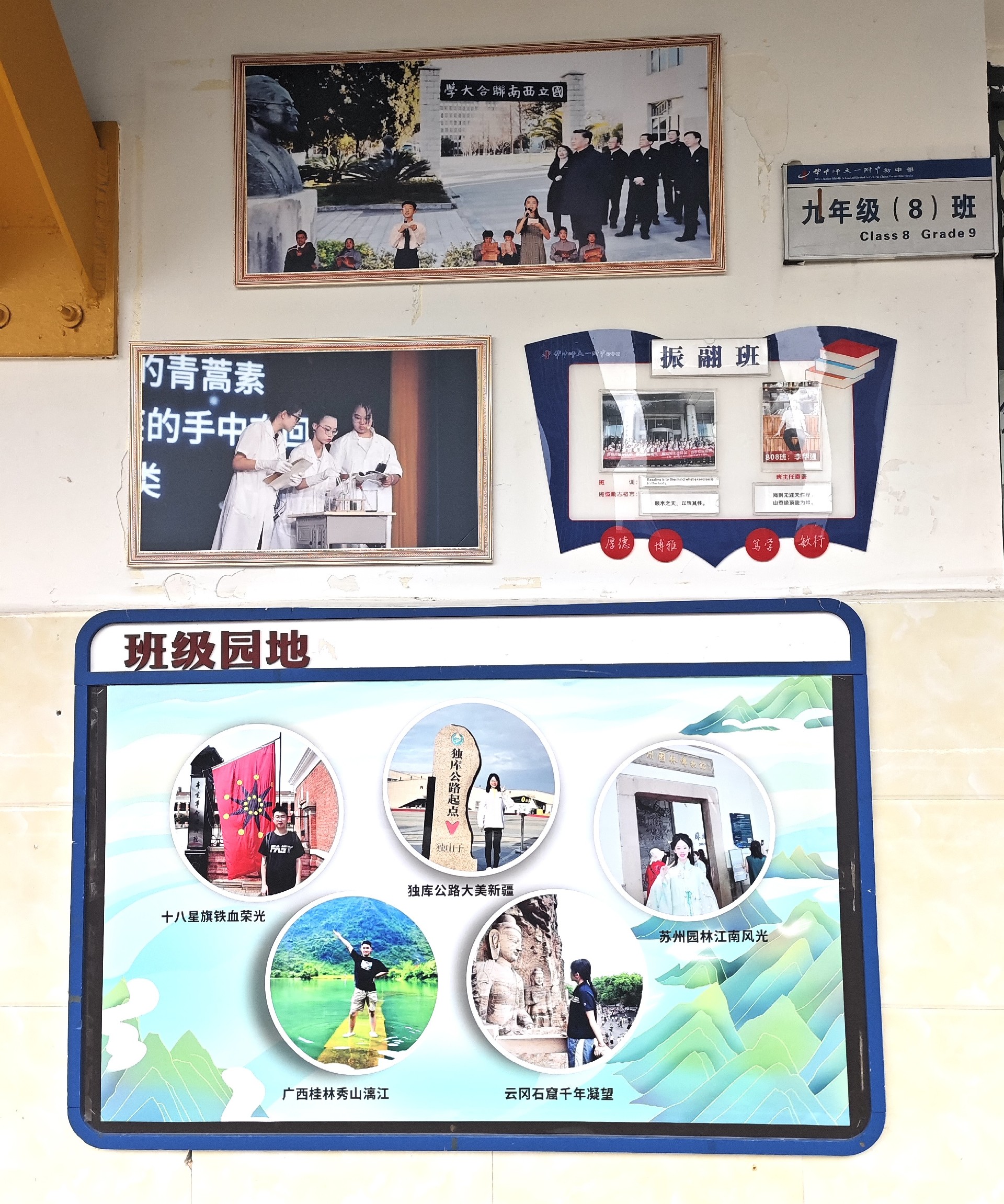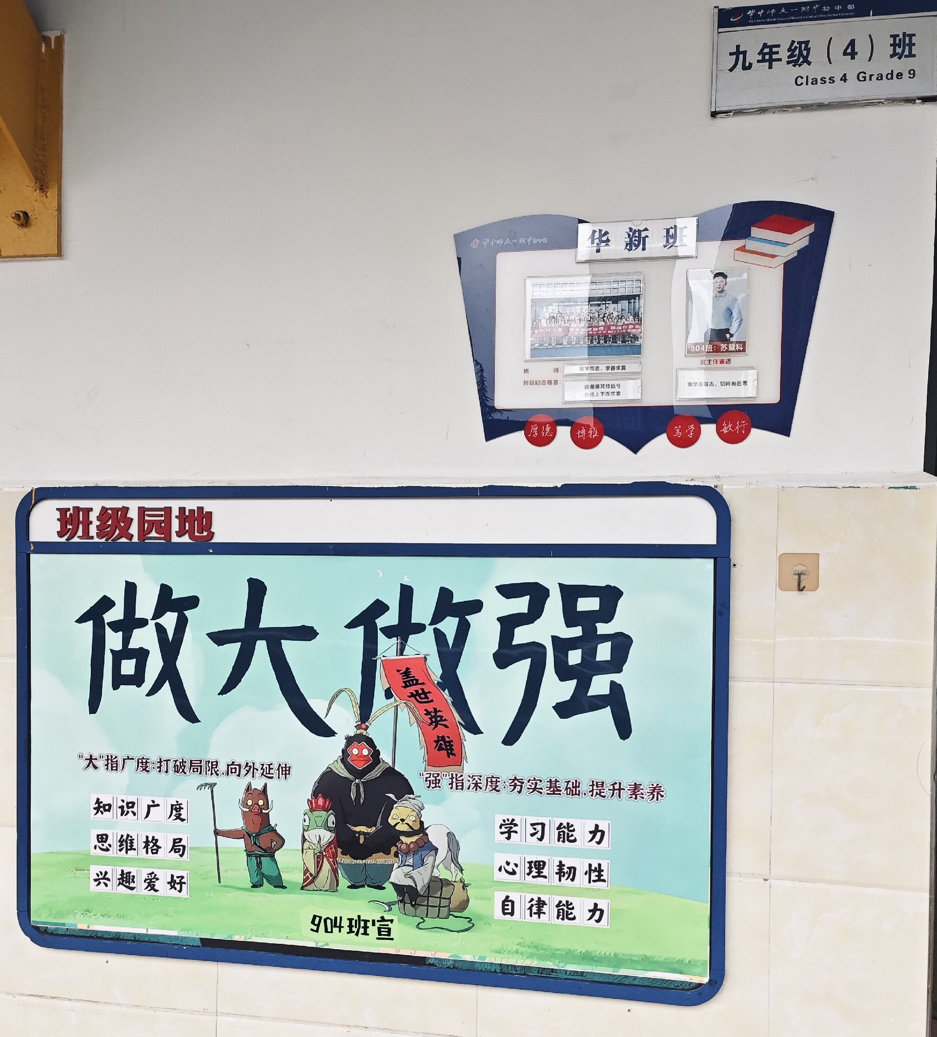 教室内外的变化也在悄然发生。教室内,黑板报换上“逐梦·登峰”的新装,粉笔描出陡峭山崖,却有一串脚印直逼山巅。教室外的班级园地里,既有假期生活的精彩掠影,也展示着以“浪浪山”小妖怪为主题的奋斗宣言——它们不仅承载着美好的夏日回忆,更象征着不畏艰难、埋头努力的决心。