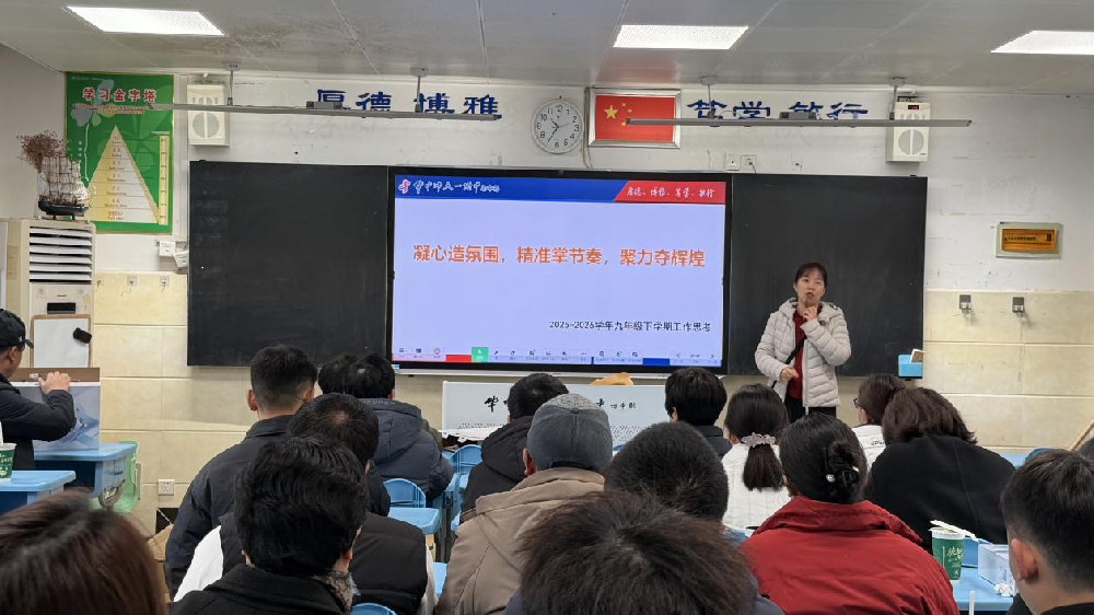 8月28日,九年级全体教师在阶梯教室参加新学期开学工作会议。会议上,彭静主任以“顶住压力,不断超越,勇攀高峰”为主题,为老师们讲解下学期的工作计划与工作重点,鼓励老师们夯实教学常规基础,勇于突破,大大提升老师们的士气。吴绾茹副校长也为九年级教师们带来了新学期的祝福与期盼,提醒老师们关注身体健康,做好家庭与工作的平衡,为九年级教学工作保驾护航。最后,“笑迎机遇和挑战,巧变压力为动力,齐心共创新辉煌”的结语掷地有声,预演着未来的凯旋。