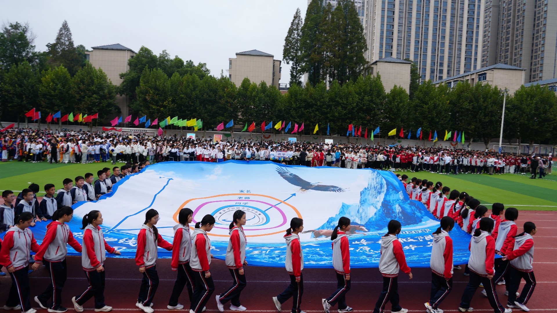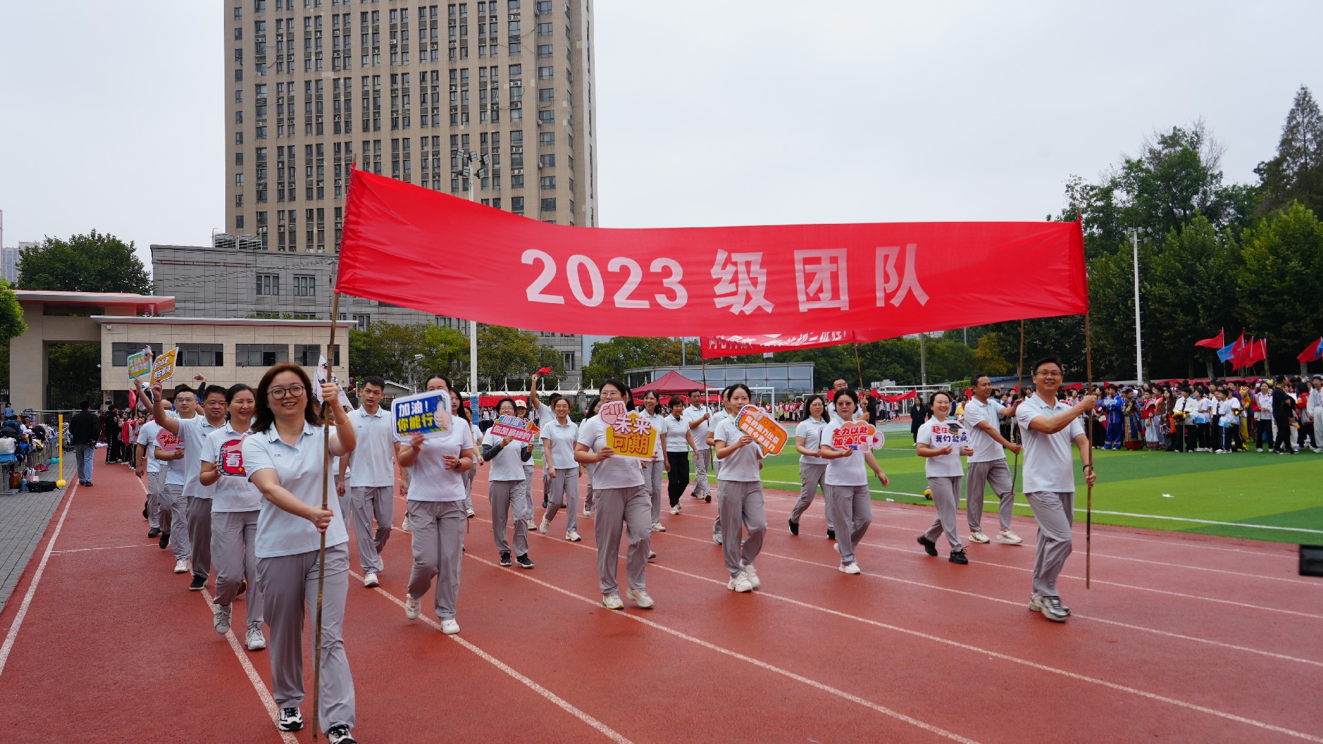 在我校运动会盛大举行之际,九年级方阵以 “家校携手,共赴奋斗征程” 为核心构思,在运动场上展现出独特而动人的风采,成为赛场上一道亮丽的风景线。