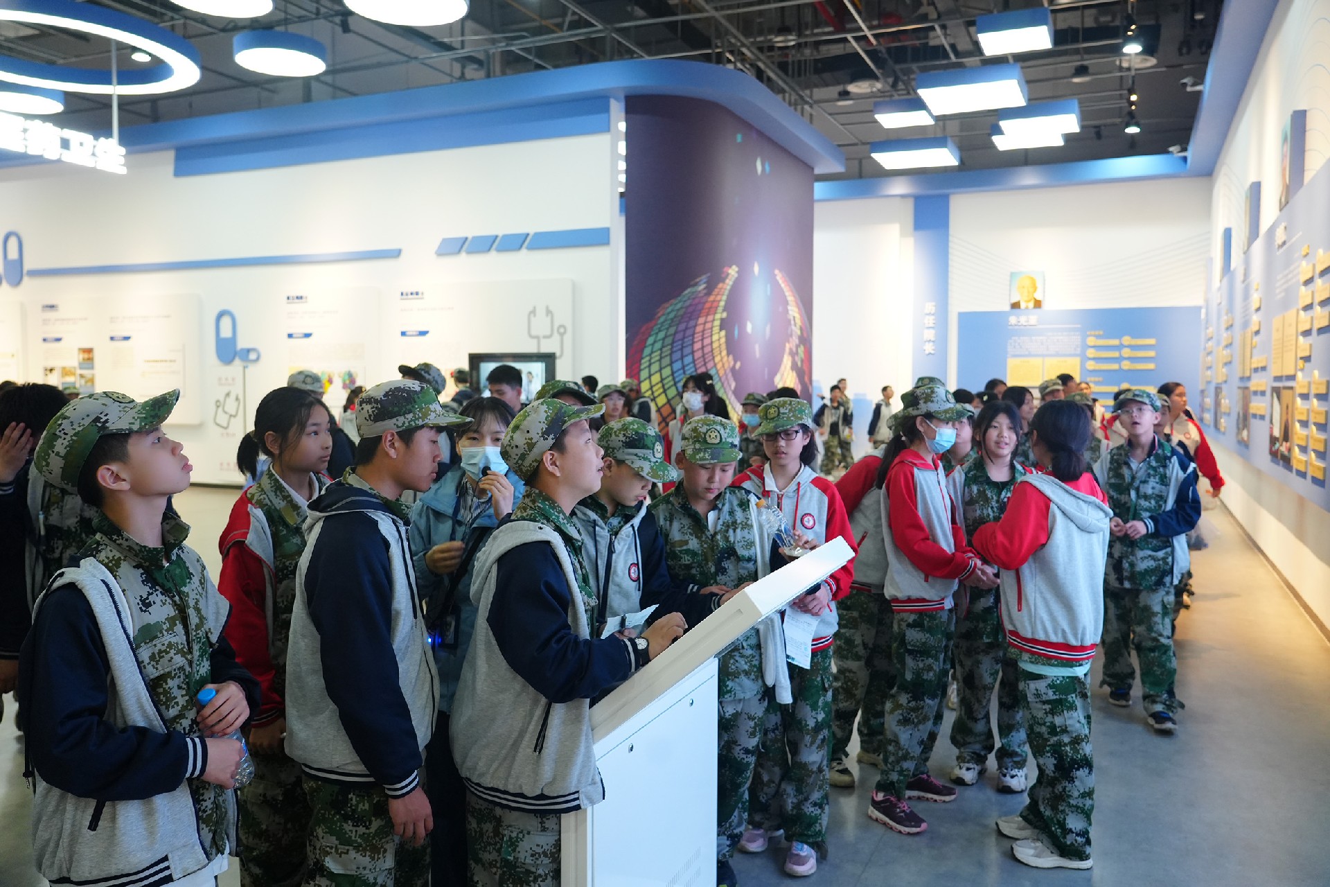 参观过程中,同学们通过亲身体验和学习,探索科技发展进程,领略科技创新魅力,感悟科学家精神。在参观“奋斗者”号万米载人潜水器时,810班周煜茜同学主动为大家介绍起来:“这是我国科技的一项重大突破,它在马里亚纳海沟下潜深度达10909米,我对它的前机械手臂印象尤为深刻,它有着精度1米的生物抓取能力,为我国的深海探测事业做出重大贡献。”