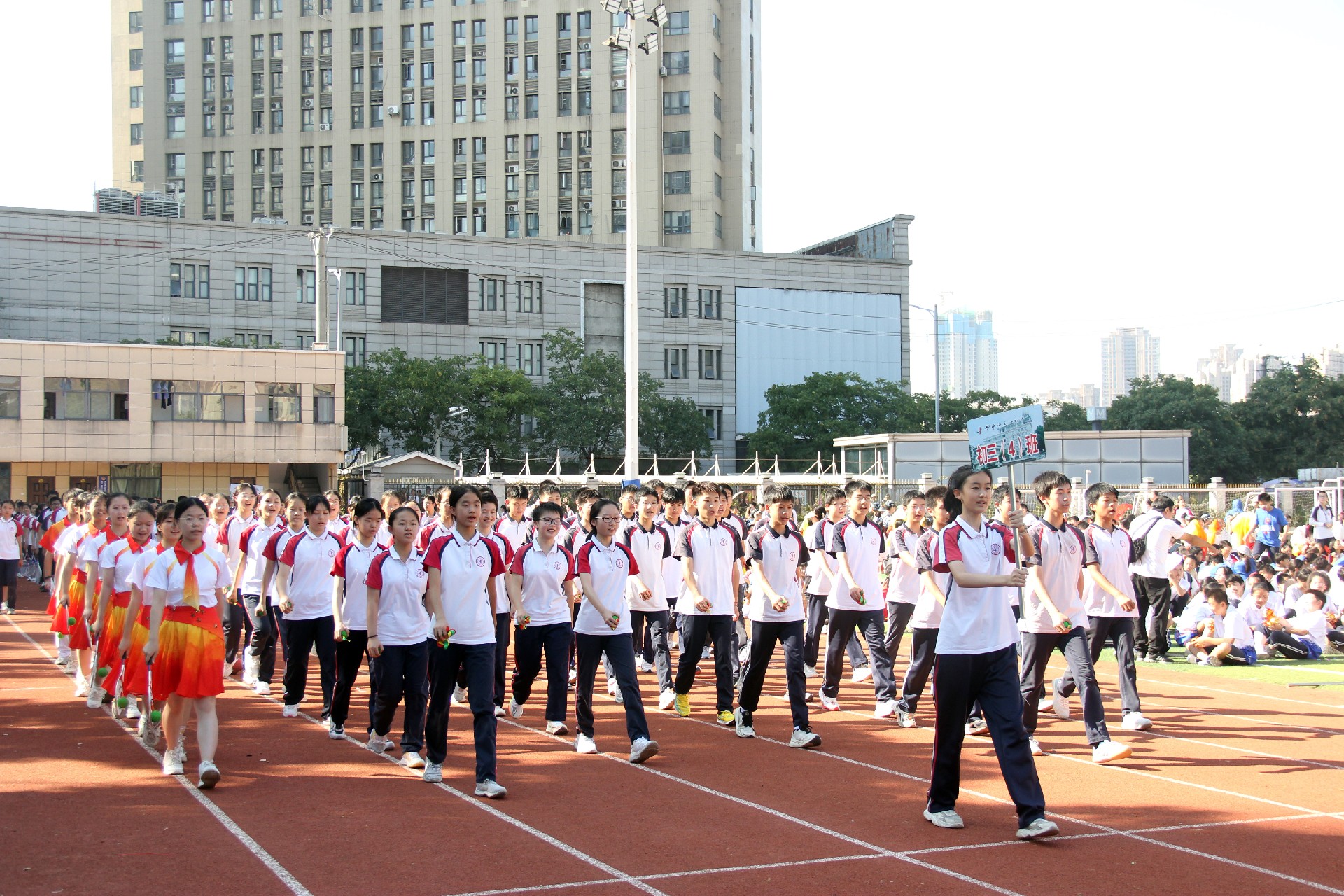 开幕式上,彩旗飘扬,鼓声震天,各代表方阵踏着青春的节拍,满怀激情地步入会场。七年级女子匕首操表演和华中师大舞龙舞狮队表演点燃了运动会现场的热烈气氛。42个班级代表方阵和裁判员代表方阵依次入场。