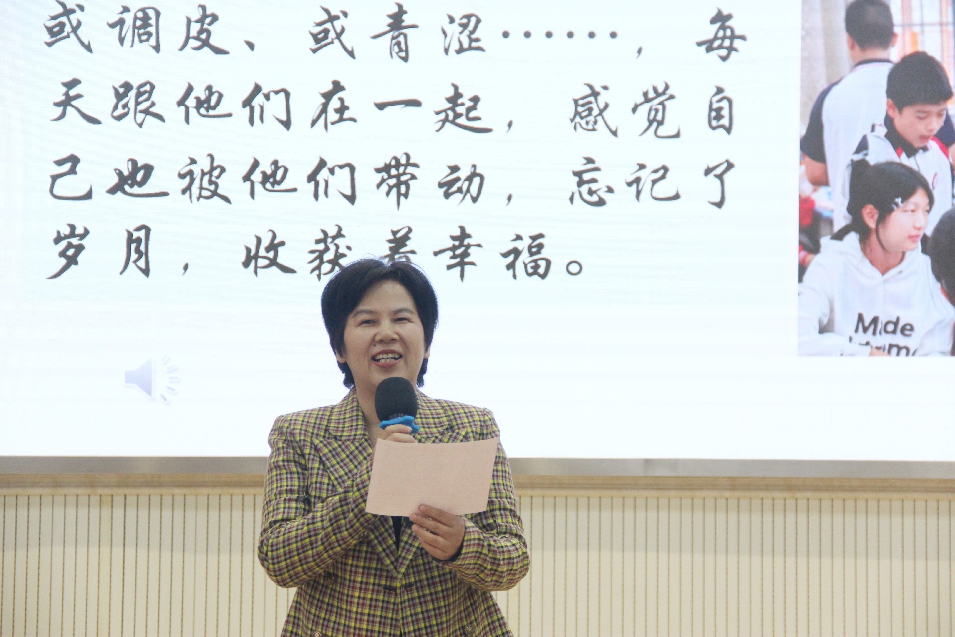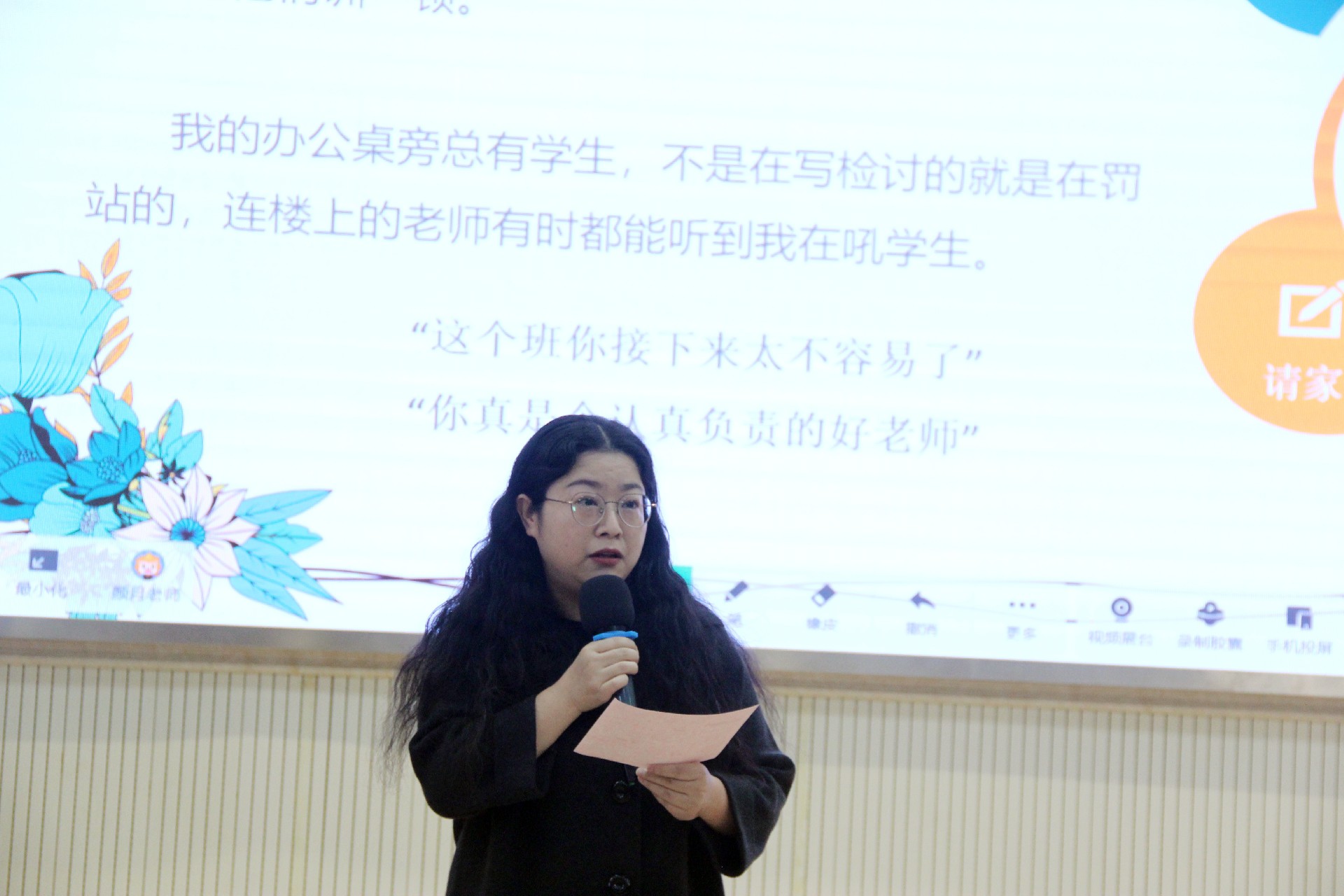 好老师启智润心,帮助学生扣好人生第一粒扣子;好老师因材施教,以爱和尊重守护每个孩子成长。805班许嘉淇、814班熊晨曦、703班梅语彤、 712班张瑞涵四位学生代表上台讲述自己心中“好老师”的样子,分享他们与老师之间的精彩故事。