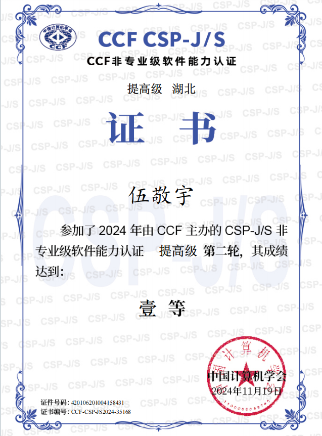 CSP-J(入门级)和CSP-S(提高级)的比赛重点考察学生解决问题时的分析理解能力、数学抽象能力与编程语言应用能力,旨在培养学生的编程技巧、激发学生的想象力与创造力。我校学生勇于挑战,在参加入门级比赛的基础上,还参加了提高级(高中组)比赛,伍敬宇、肖煜航、申洵宇、张梓涵、游映强、党熙雯、吴佳莹等取得提高级全国一等奖(湖北)的好成绩。