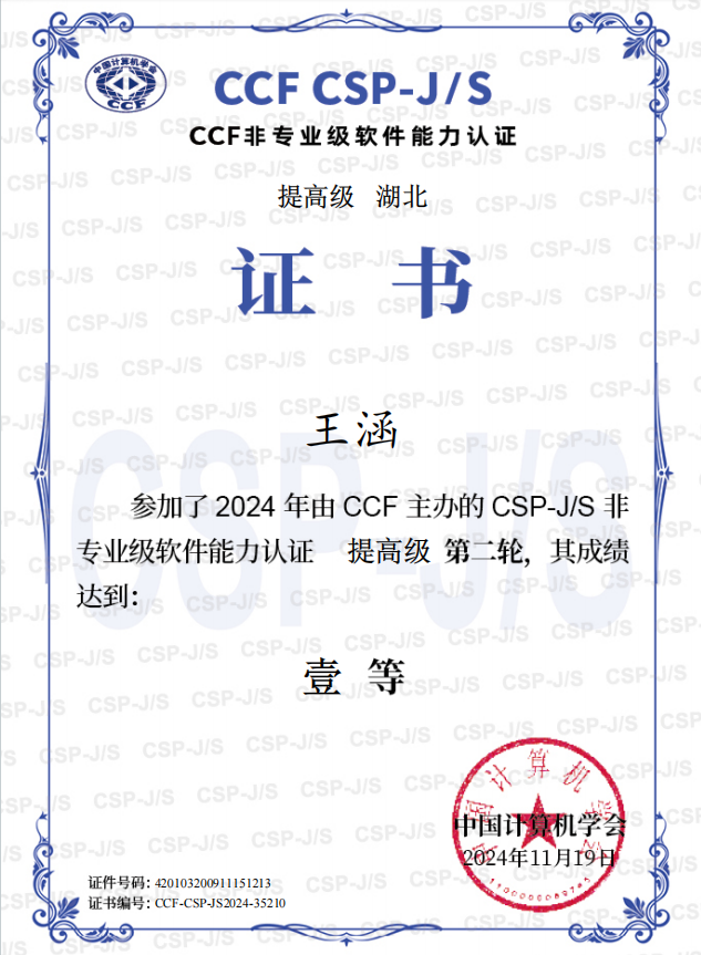在由CCF主办的2024年CSP-J/S非专业级别软件能力认证比赛中,我校再次取得历史性突破,共有30余名同学获奖。其中,903班的王涵同学荣获入门级(最高分)和提高级两个全国一等奖(湖北),王泽宇、彭熙坤、游映强、喻添翼、方靖轩、陈熙妍、罗睿扬、吴佳莹等同学也分别获得入门级全国一等奖!特别值得一提的是,王涵同学还获得蓝桥杯国一等奖,NOC全国二等奖,信息素养大赛全国二等奖好成绩,这些成绩不仅彰显了个人实力,也为学校赢得了荣誉。