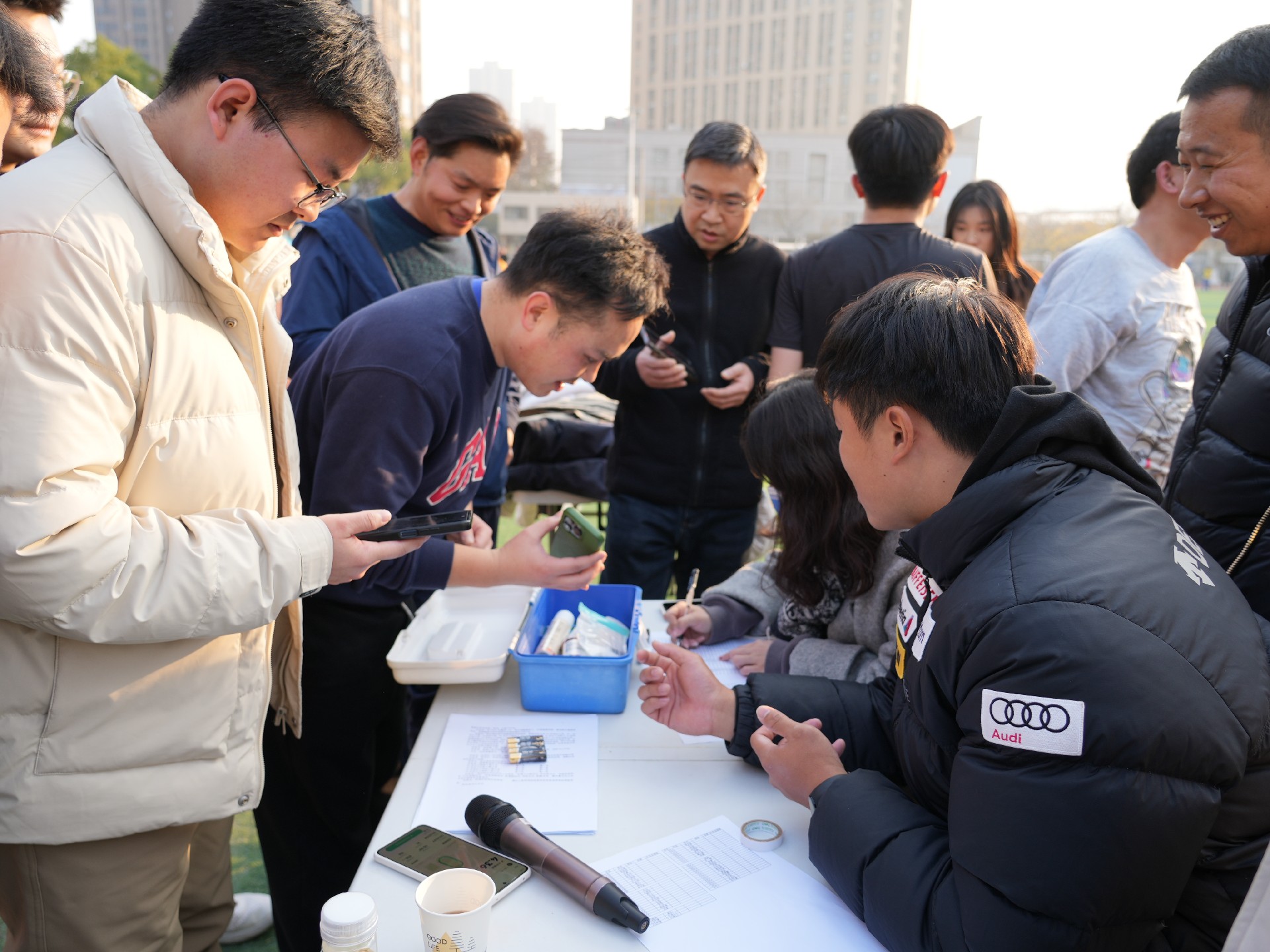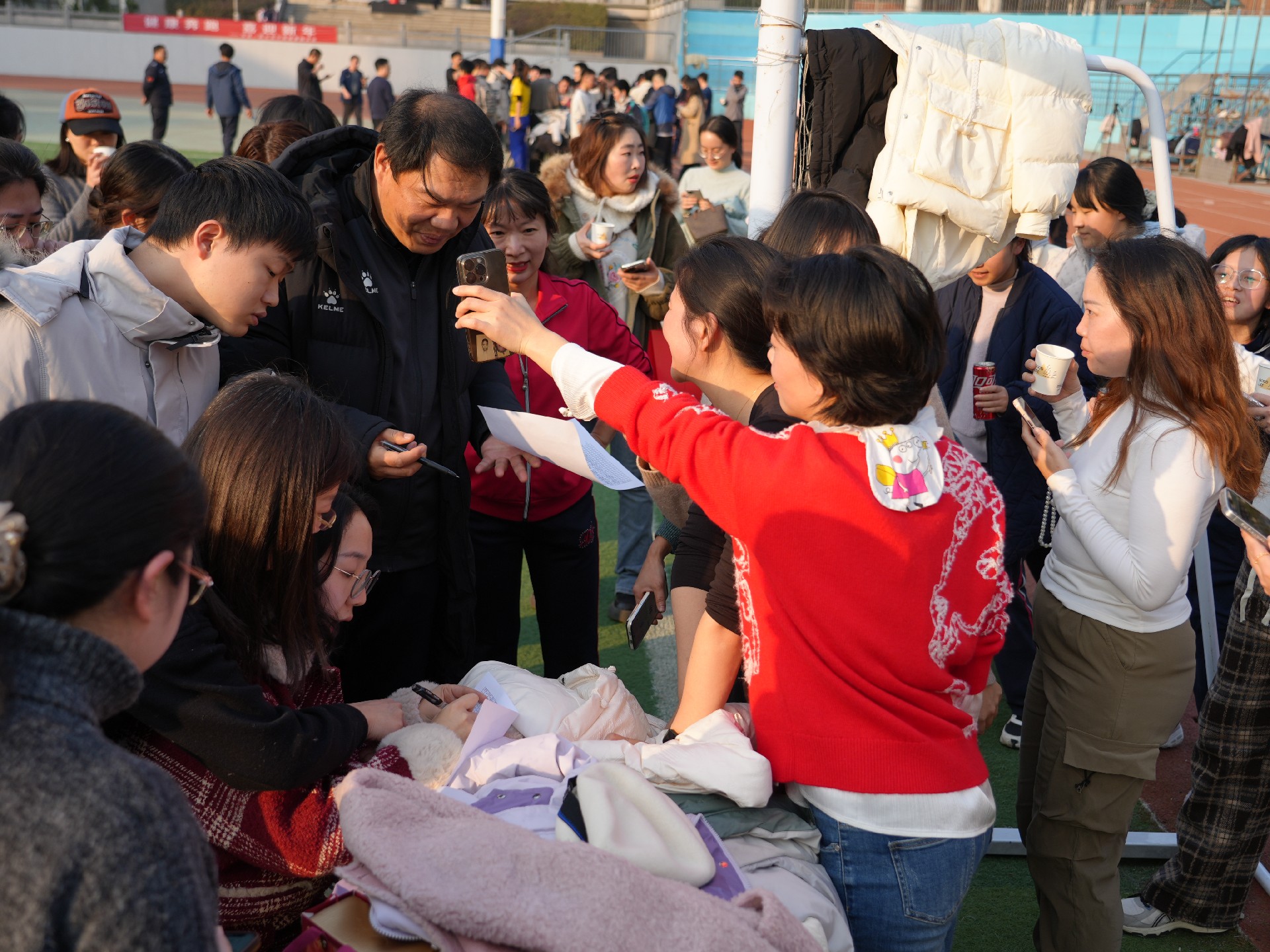 工作人员积极为老师们统计跑步成绩。