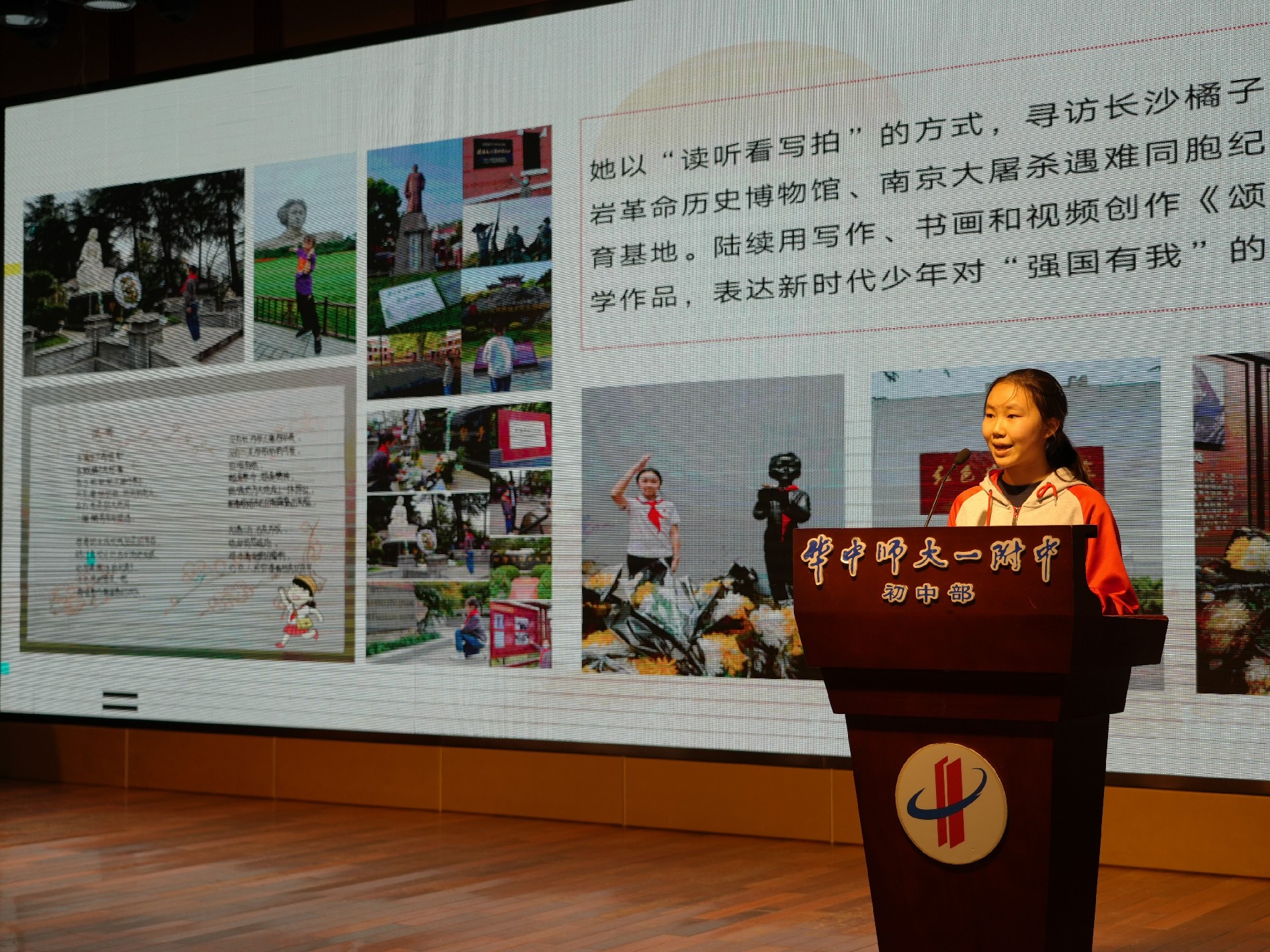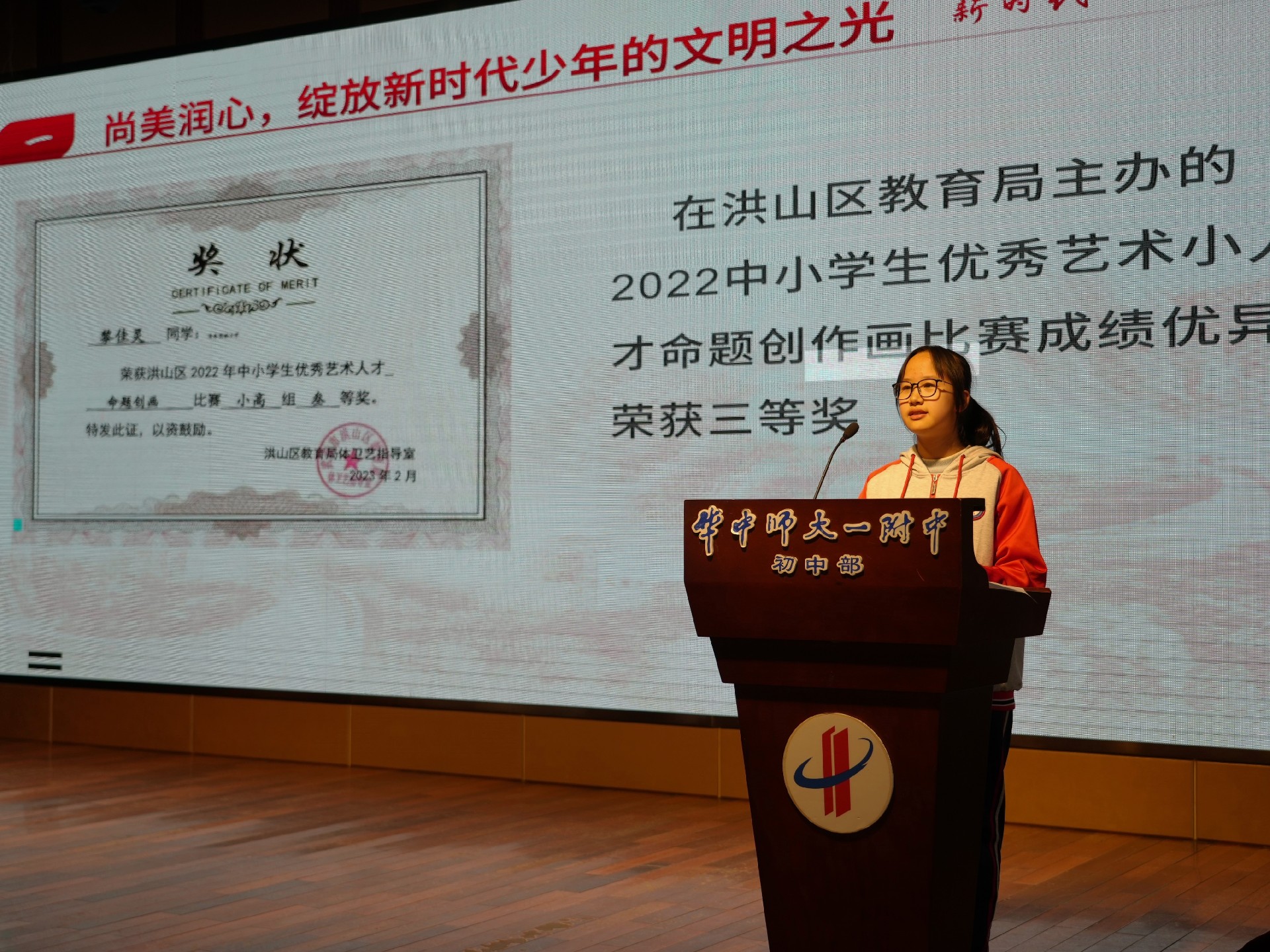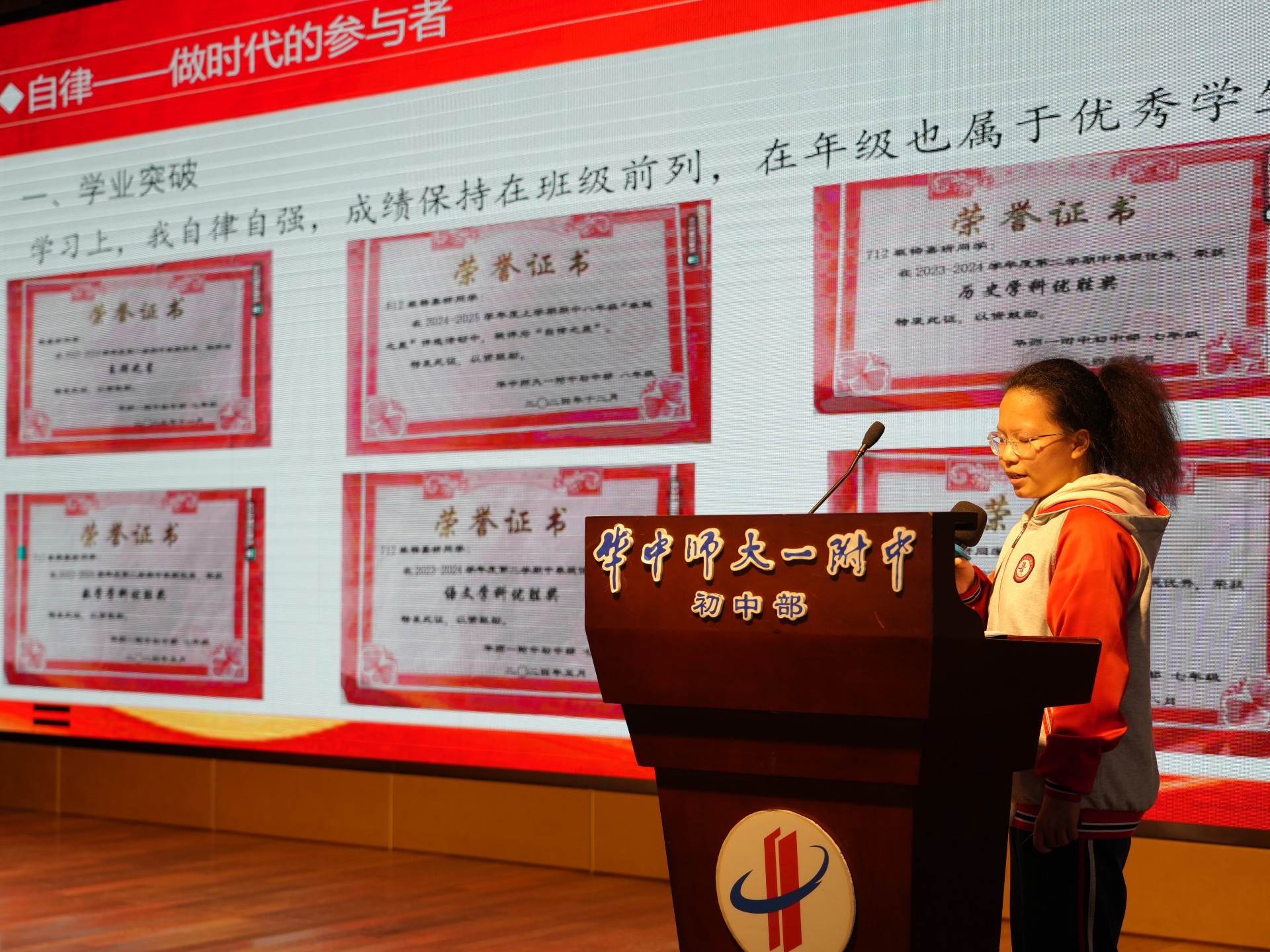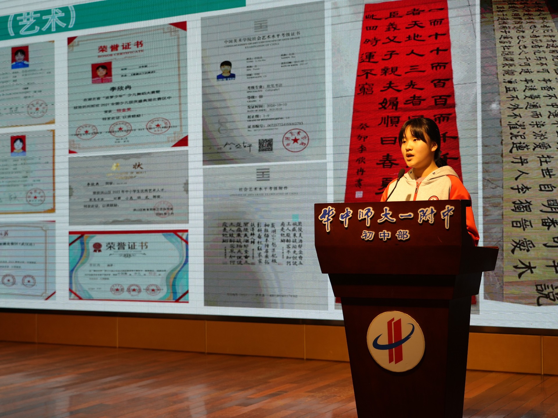 接下来进行的是新时代好少年评选环节。经过班级推荐、年级评选、学校审核等环节,脱颖而出,在现场展示风采。他们中有的热心公益9余载、有的专研科技、有的勤奋学习成绩优异,有的乐于助人、有的多才多艺、全面发展……他们用行动诠释着新时代好少年的责任与担当,展现了华一学子积极向上的精神风貌。