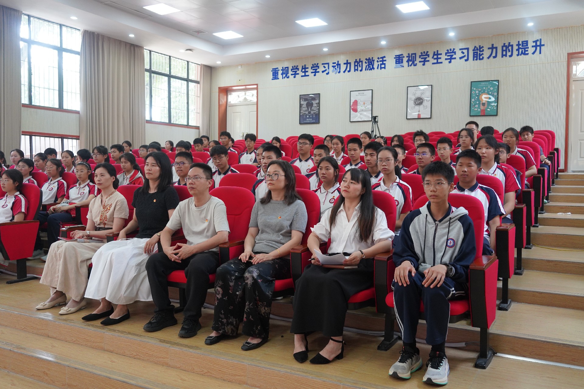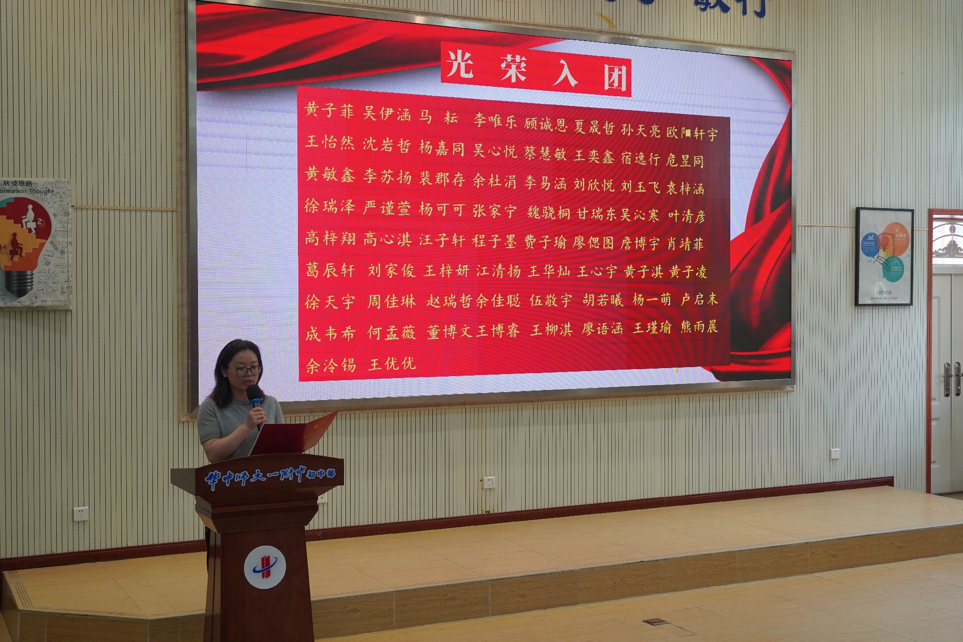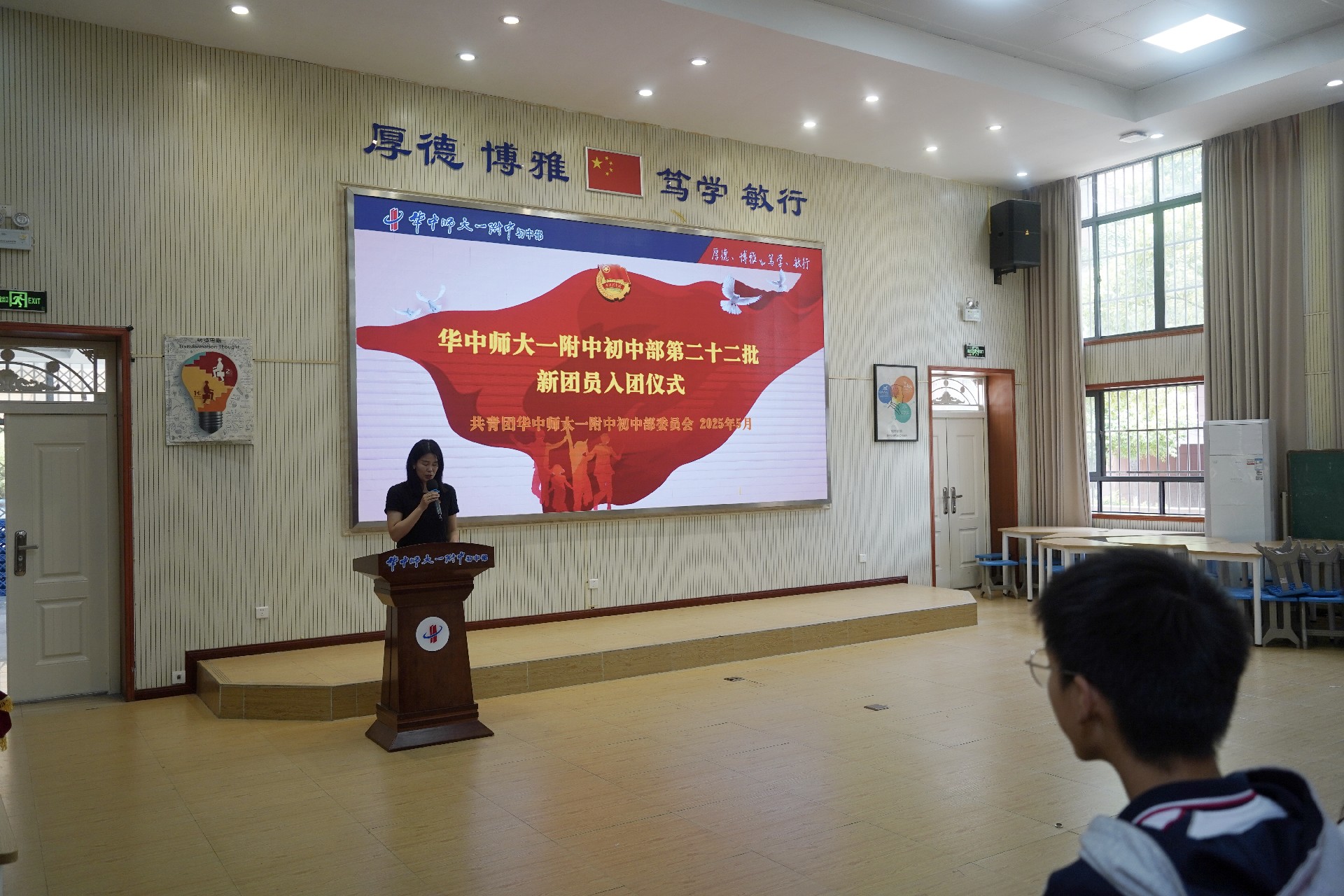 2025年5月26日中午,华中师大一附中初中部第22批新团员入团仪式在阶梯教室庄重举行。学校党支部书记李先艳、学工副校长叶文娇、团委书记王丹丹、八九年级德育主任丁园圆、陈进出席仪式,新团员们齐聚一堂,共同见证这一光荣时刻。