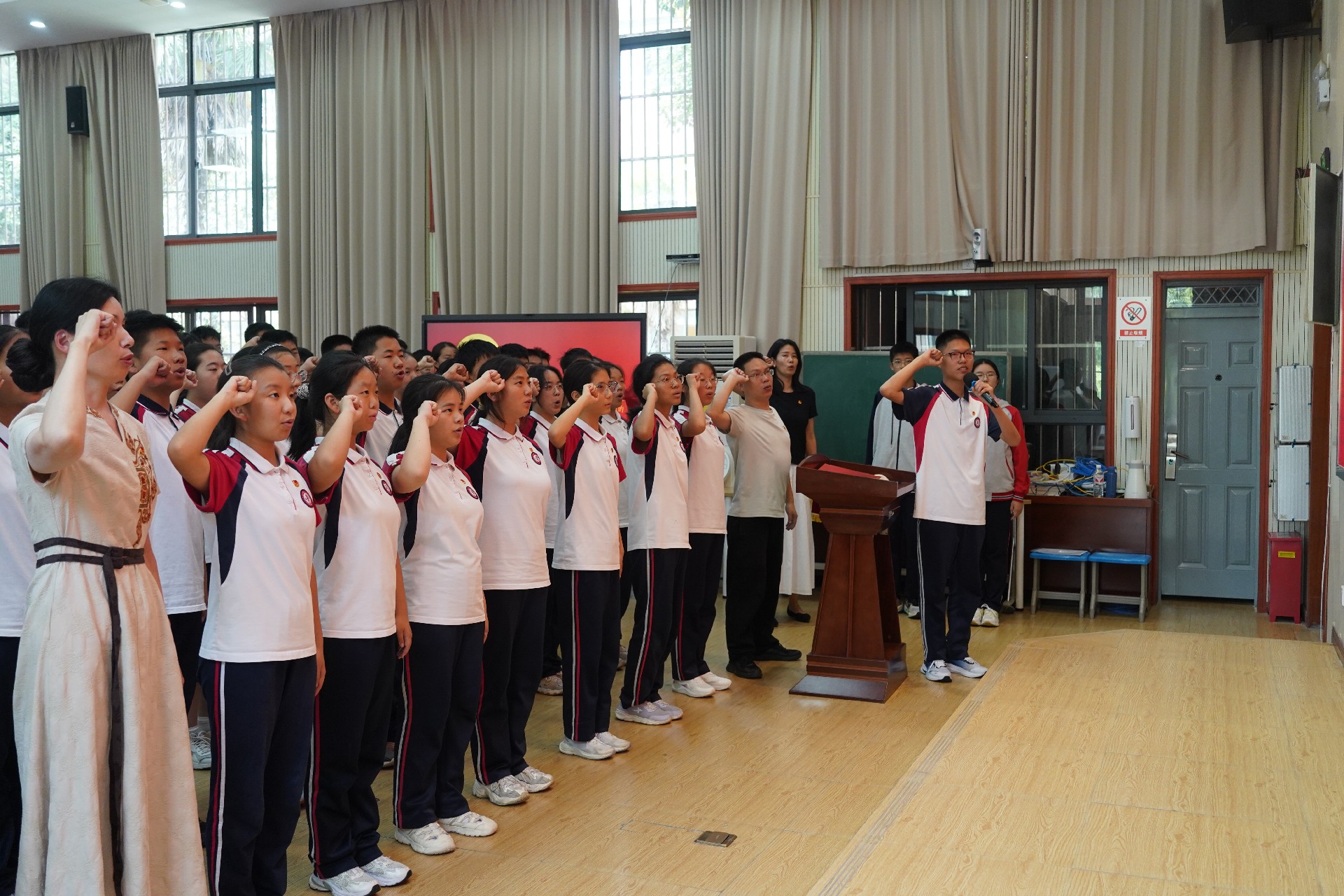 丁老师宣读入团积极分子名单,每一个名字的念出,都伴随着同学们的自豪与骄傲。最激动人心的时刻当属新团员佩戴团徽。同学们郑重地将团徽佩戴在胸前,那一刻,自豪与激动在他们脸上洋溢。在熠熠生辉的团徽下,新团员们在803班沈岩哲的带领下庄严宣誓。一句句誓言掷地有声,饱含着青春的力量与坚定的信念,他们许下的不仅是对自己的承诺,更是对团组织、对祖国的庄严允诺。