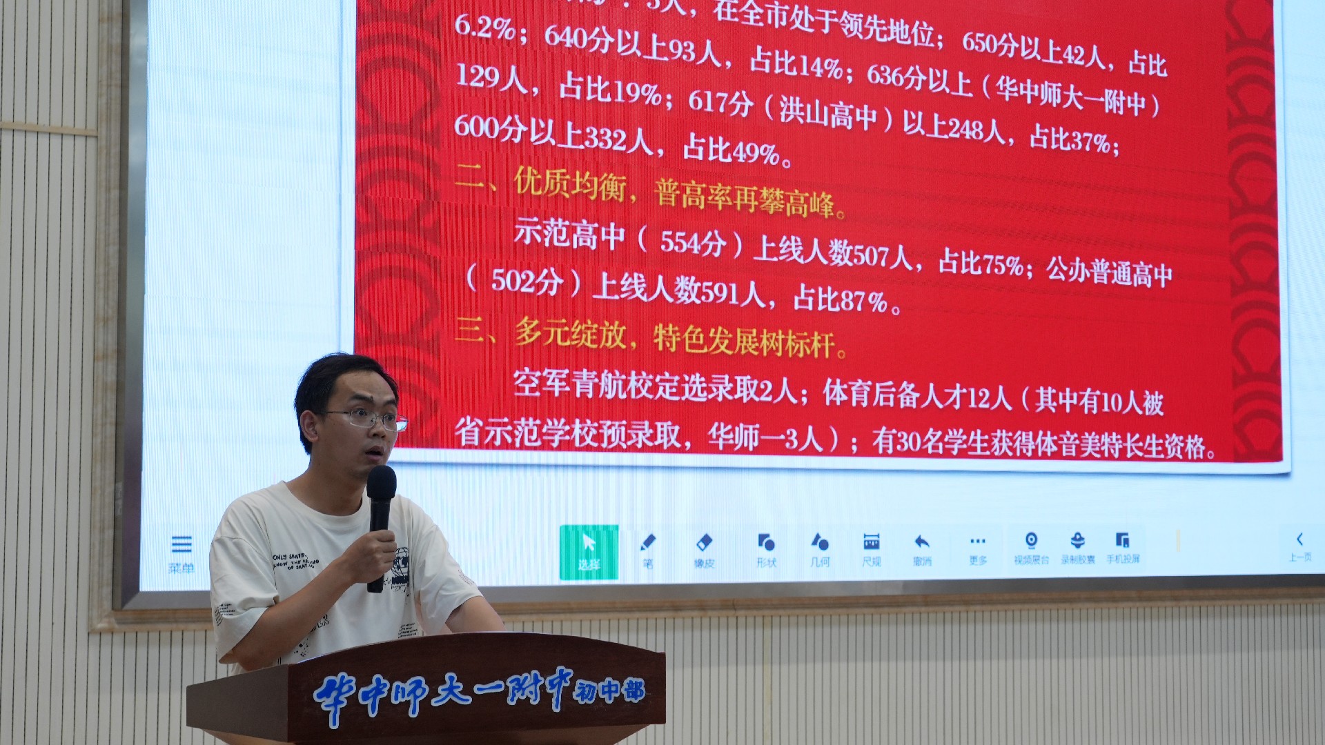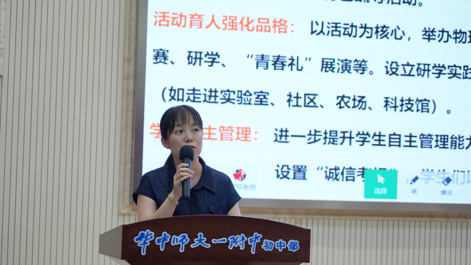 大会议程第一项是年级主任工作述职。九年级主任邓旭、八年级主任彭静、七年级主任曾庆善依次登台,聚焦年级特色,盘点育人硕果。夯实根基、以文化人、锐意求新……三位年级主任以详实的案例展示了年级育人工作的温度与深度,深刻总结了年级工作的宝贵经验与有效做法,字里行间洋溢着对未来发展的坚定信心与昂扬斗志。