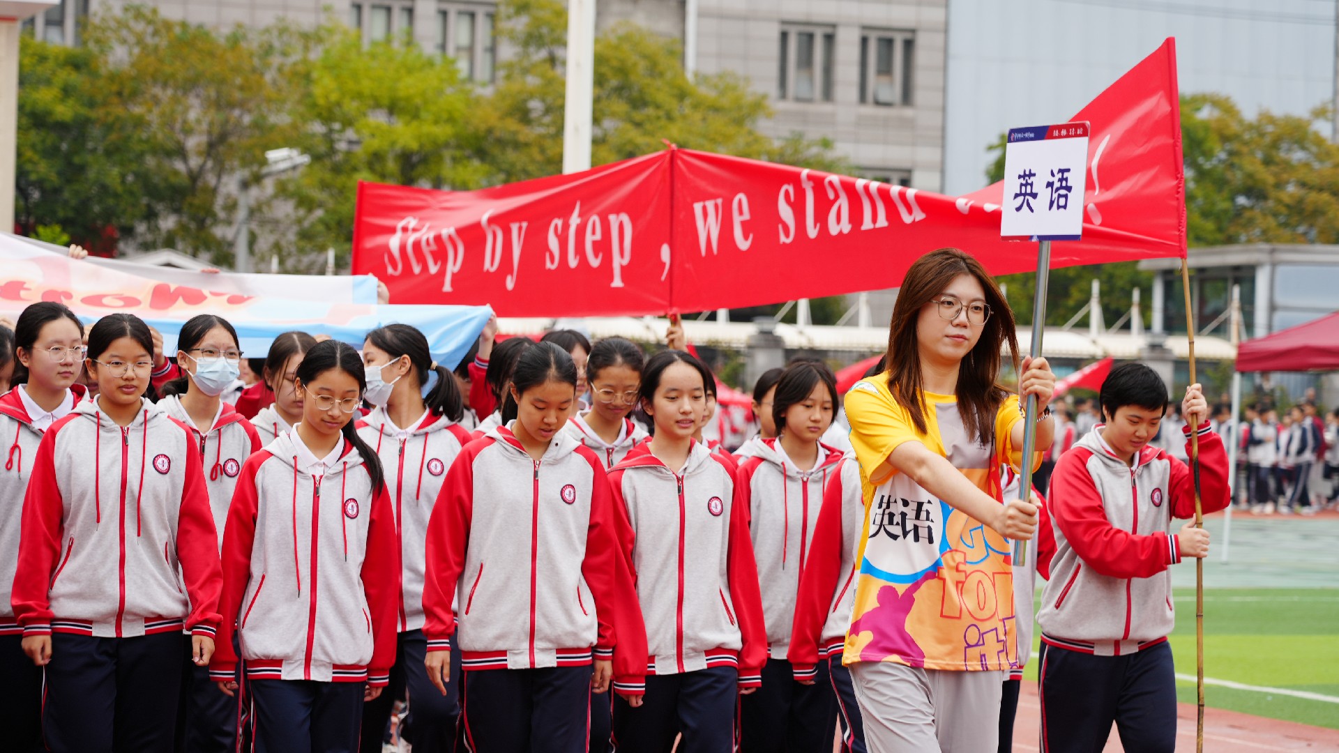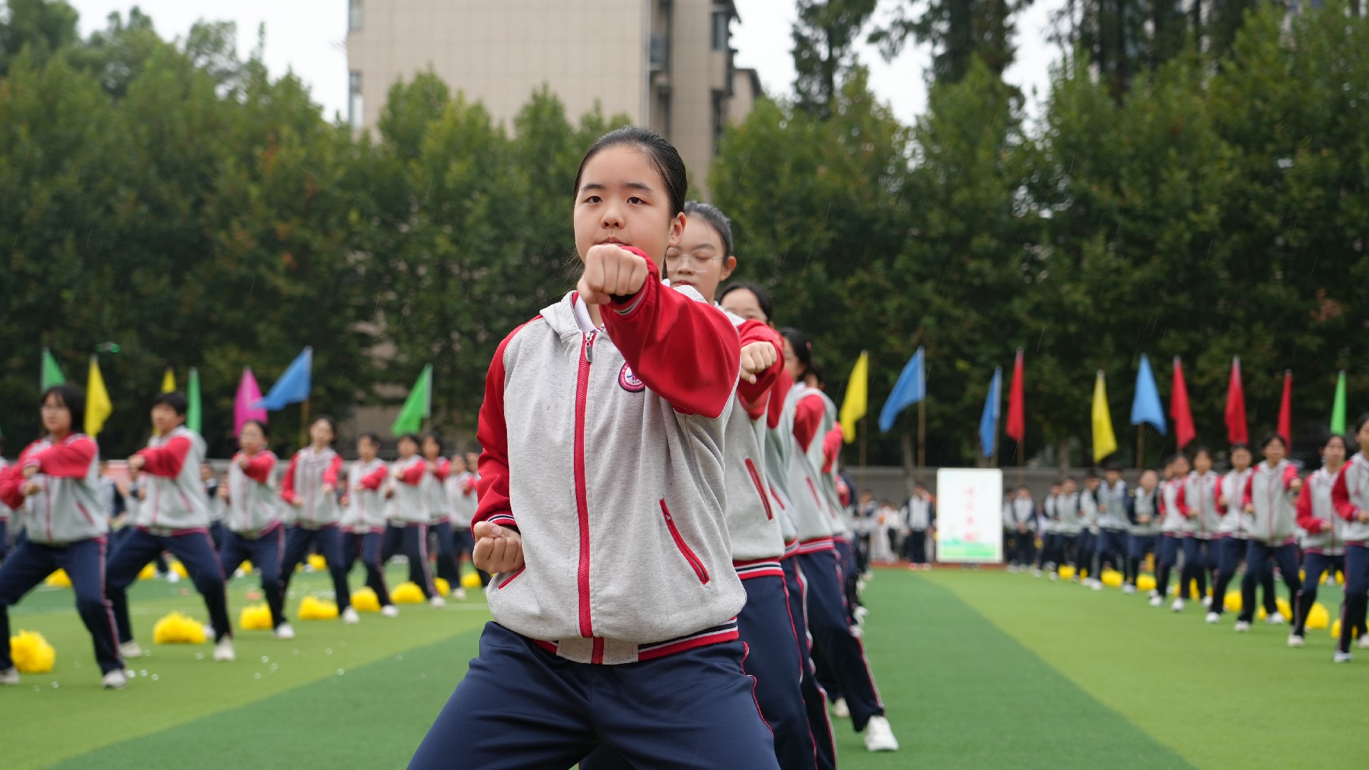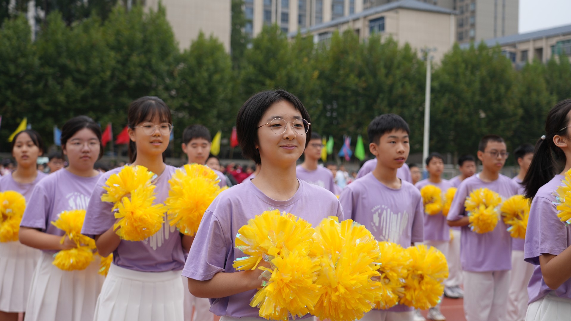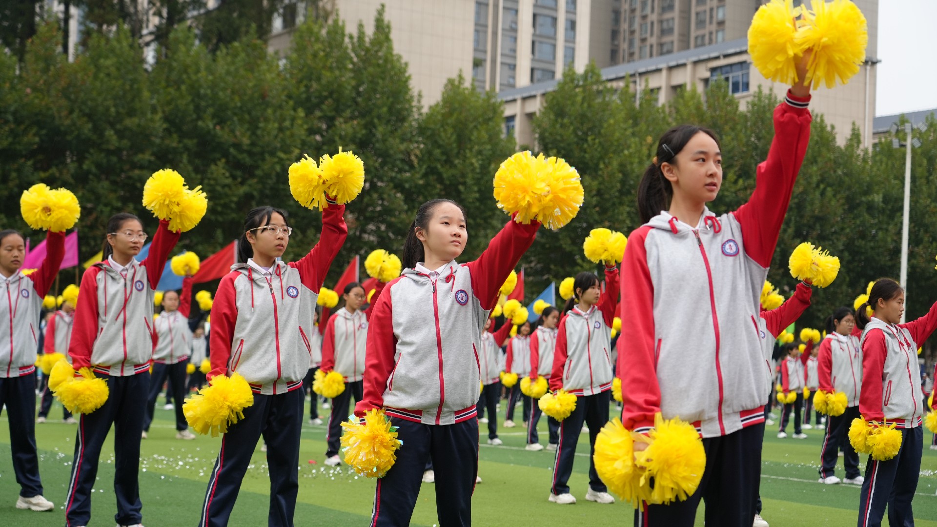 三个年级的方阵多元展示青春活力,九年级彩旗方队率先自信登场。五彩旗帜猎猎飞扬,阳光少年步伐坚定,此刻,我们雄心壮志向未来。七年级女子匕首操方队英姿飒爽,来自15个班的姑娘们,动作利落、口号嘹亮,一招一式,掷地有声。八年级啦啦操方队舞动青春,击掌、跃动、站桩、挥拳……演绎出阳光动人的青春诗乐章与壮丽多姿的华夏山河图。