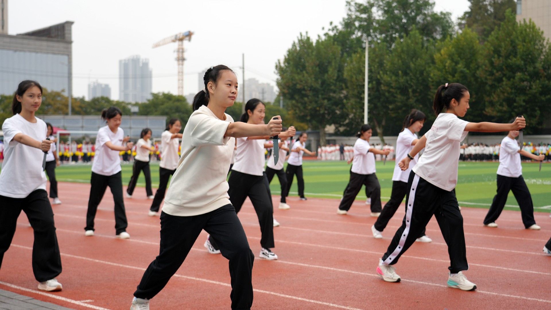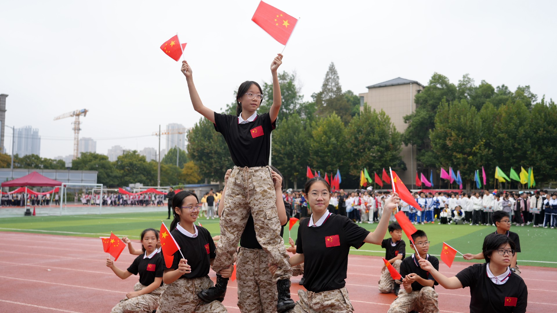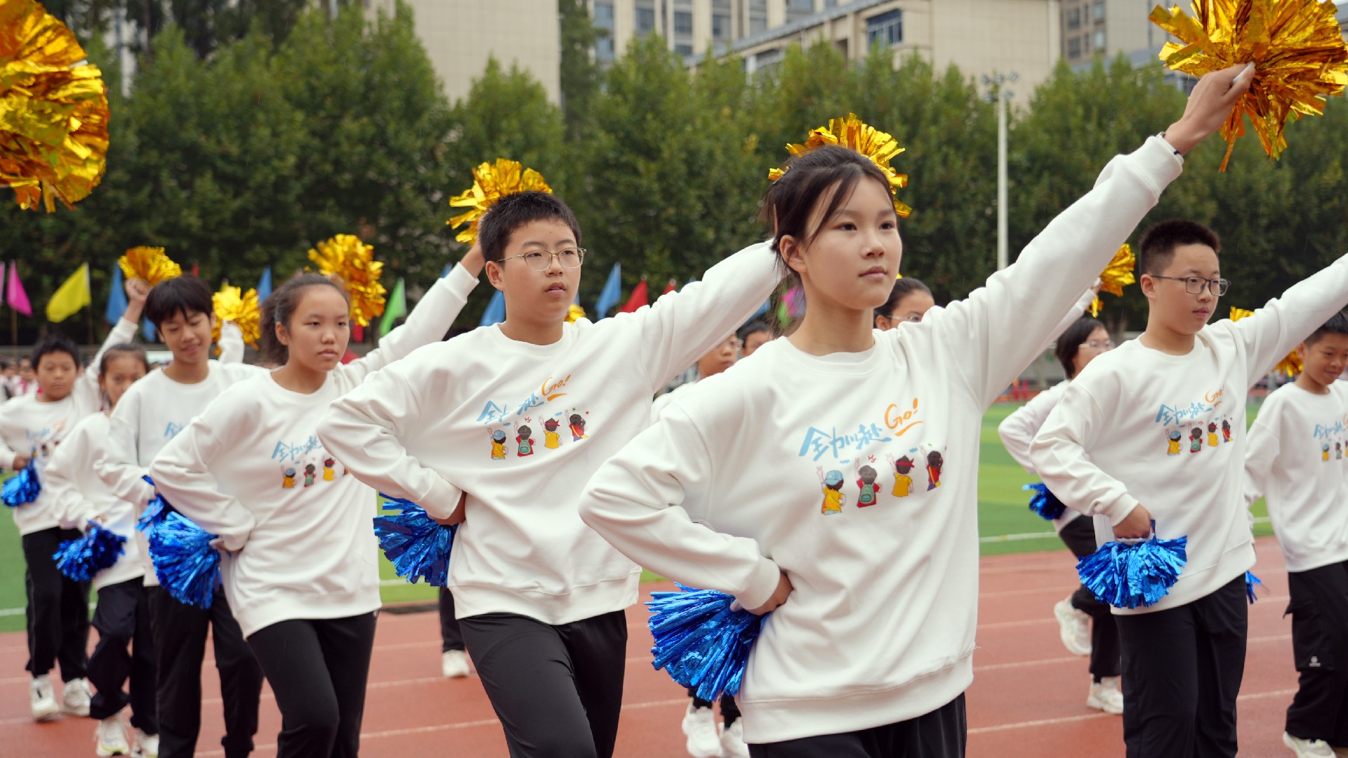 三个年级的方阵多元展示青春活力,九年级彩旗方队率先自信登场。五彩旗帜猎猎飞扬,阳光少年步伐坚定,此刻,我们雄心壮志向未来。七年级女子匕首操方队英姿飒爽,来自15个班的姑娘们,动作利落、口号嘹亮,一招一式,掷地有声。八年级啦啦操方队舞动青春,击掌、跃动、站桩、挥拳……演绎出阳光动人的青春诗乐章与壮丽多姿的华夏山河图。