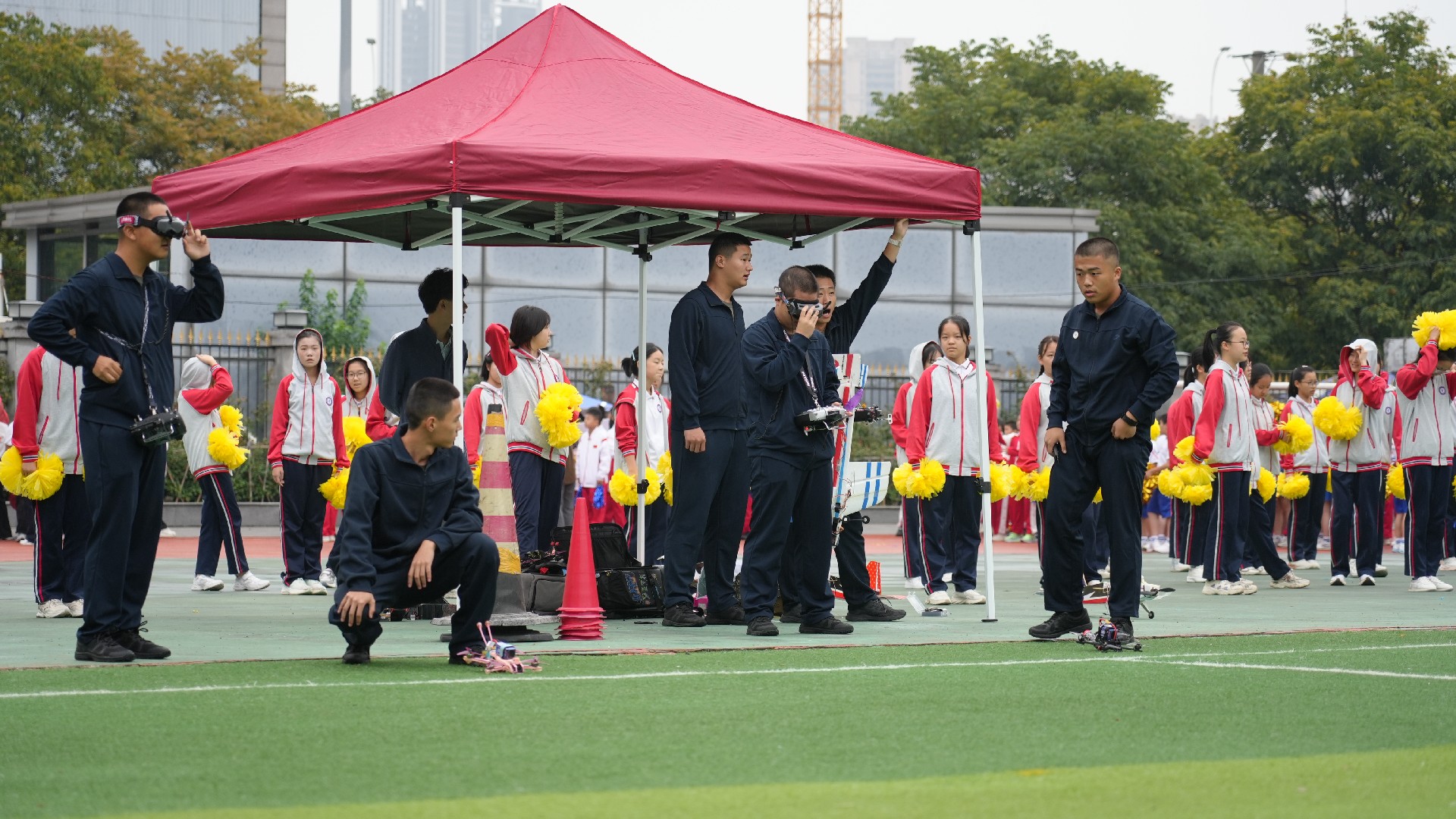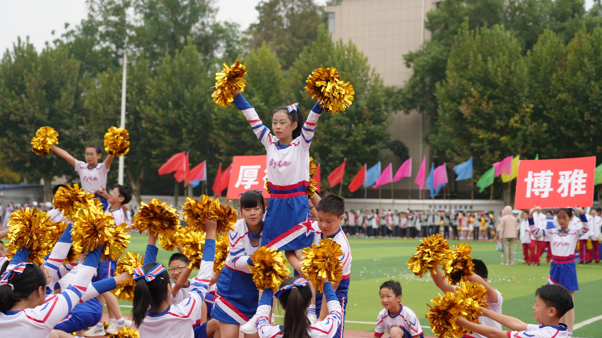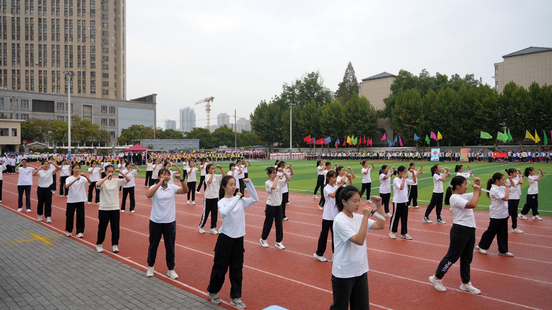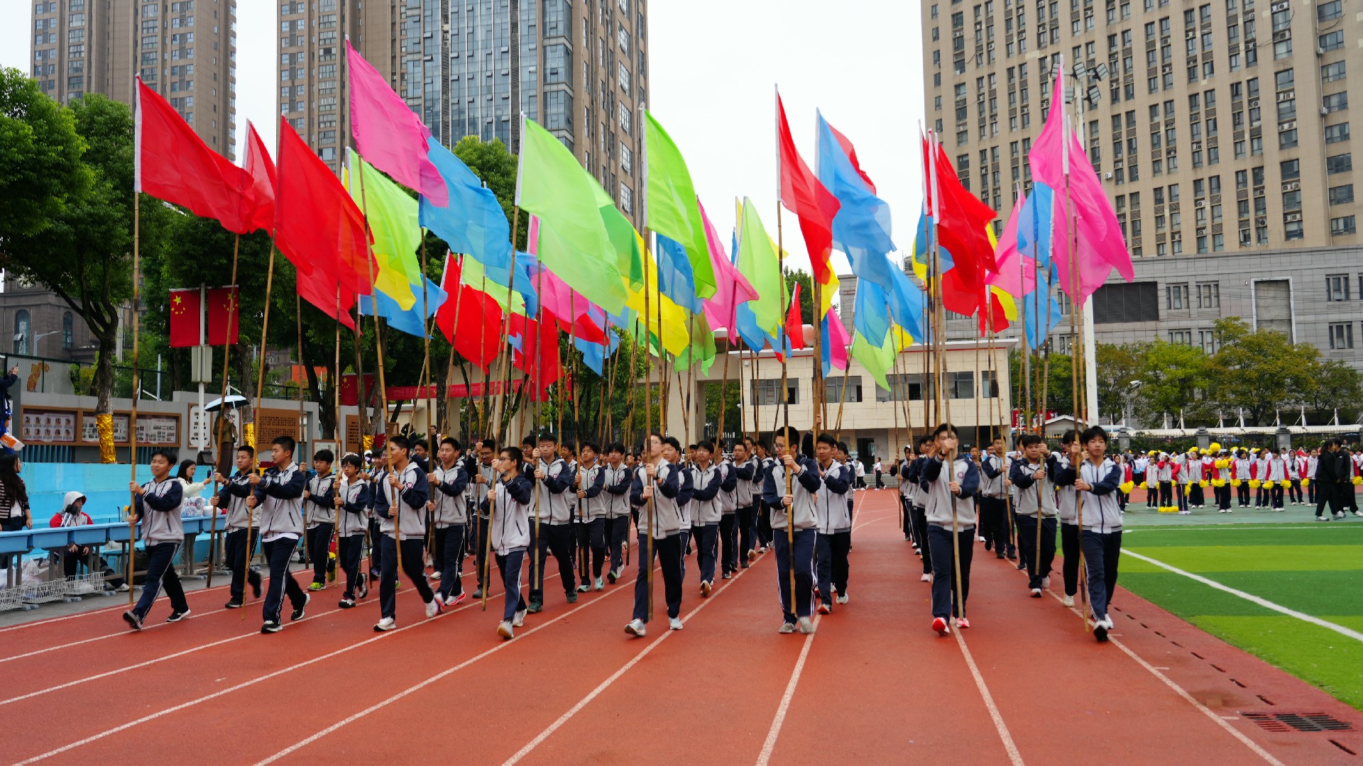 三个年级的方阵多元展示青春活力,九年级彩旗方队率先自信登场。五彩旗帜猎猎飞扬,阳光少年步伐坚定,此刻,我们雄心壮志向未来。七年级女子匕首操方队英姿飒爽,来自15个班的姑娘们,动作利落、口号嘹亮,一招一式,掷地有声。八年级啦啦操方队舞动青春,击掌、跃动、站桩、挥拳……演绎出阳光动人的青春诗乐章与壮丽多姿的华夏山河图。
