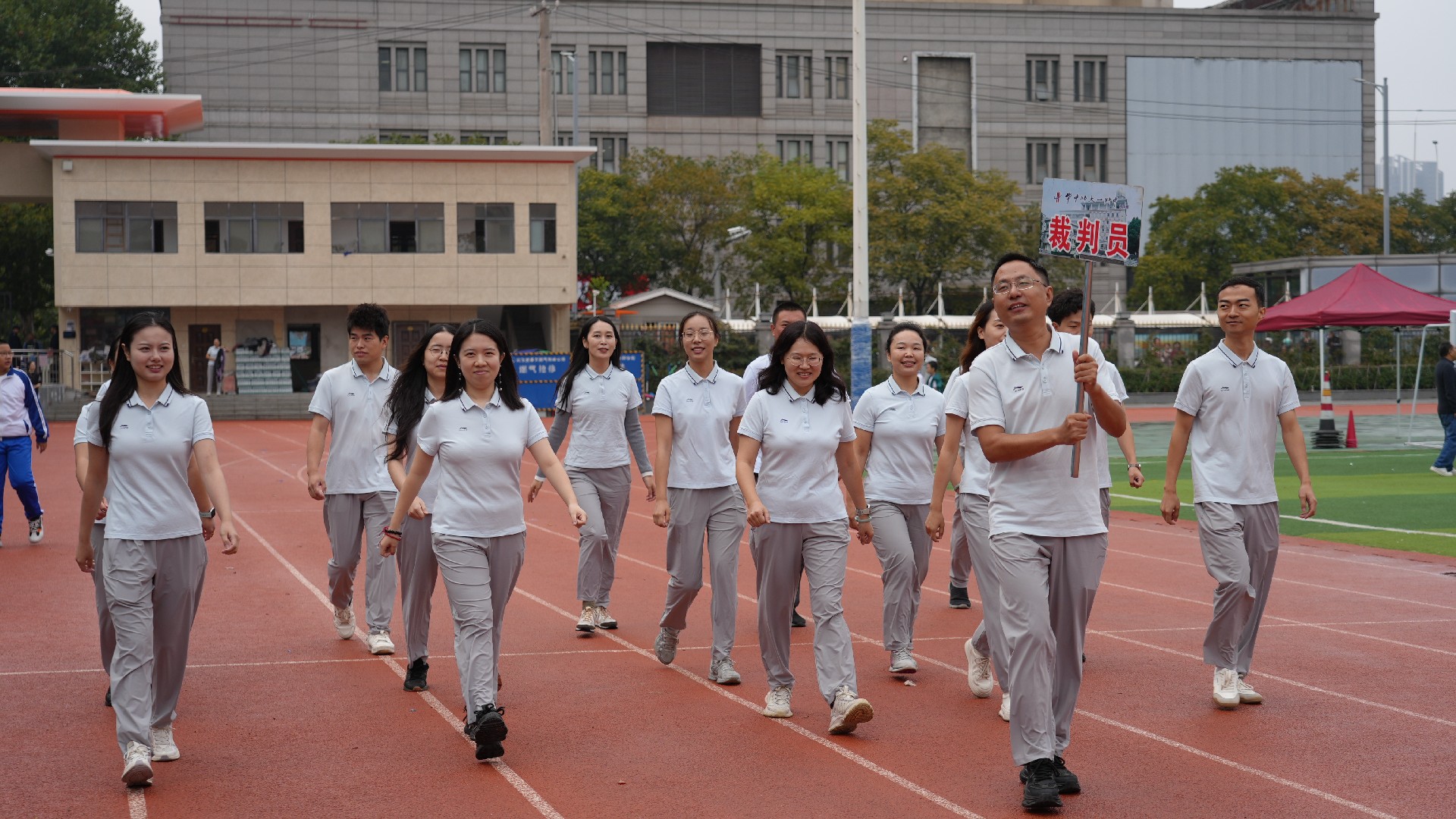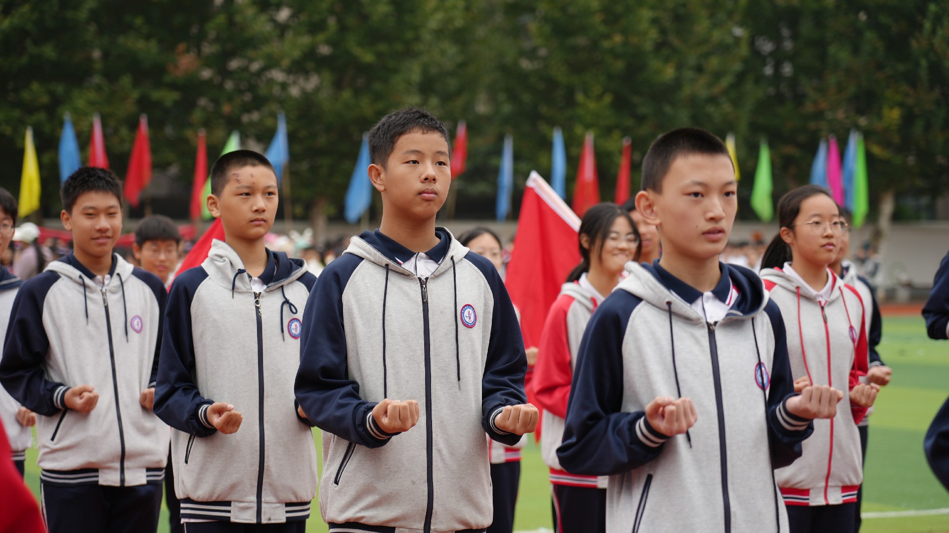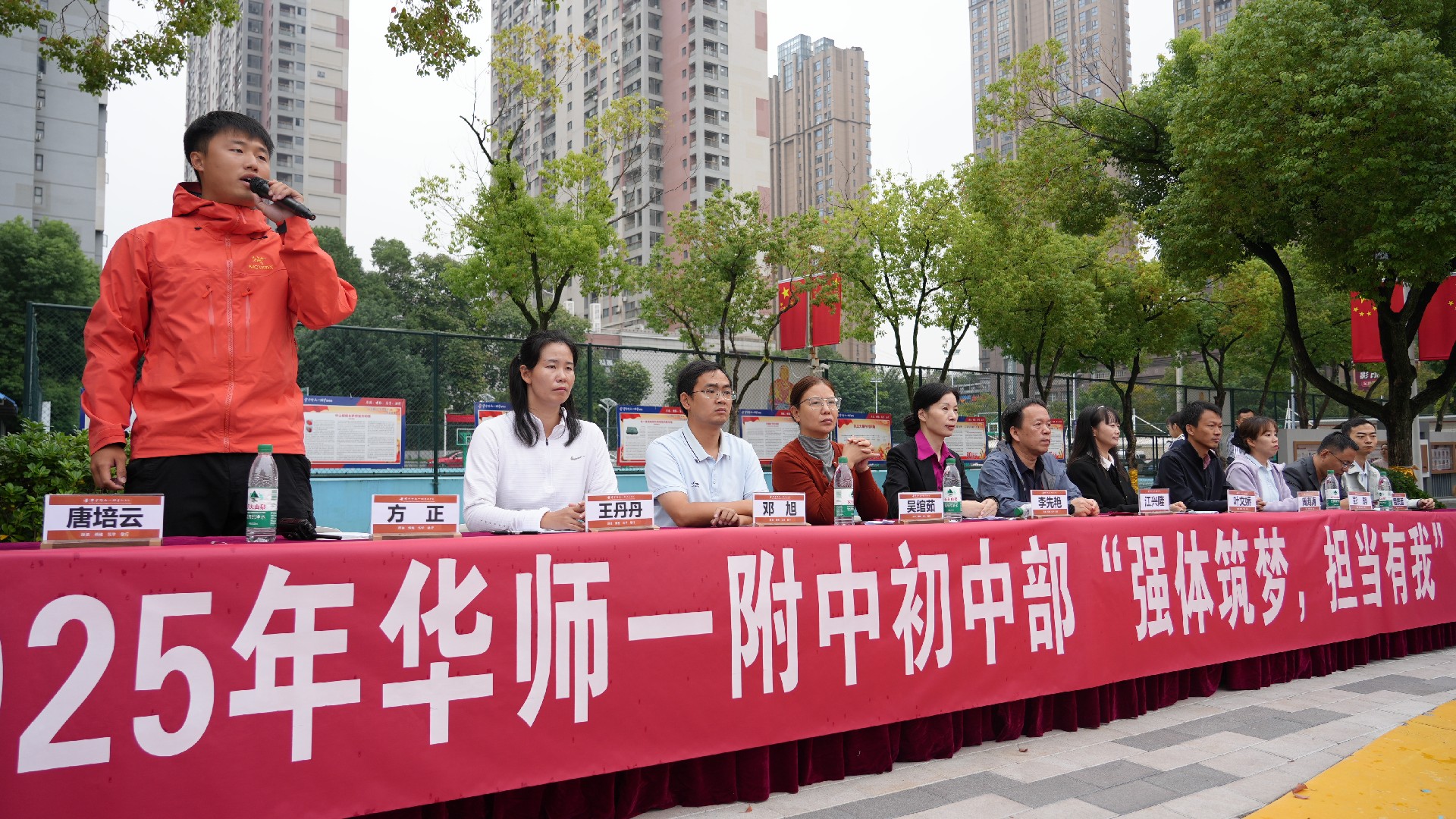 运动员代表811班赵王睿璿、裁判员代表田军海老师庄严宣誓。在全体师生的热切期待中,总裁判长方正郑重宣布:“华师一附中初中部2025年秋季田径运动会,正式开始!”