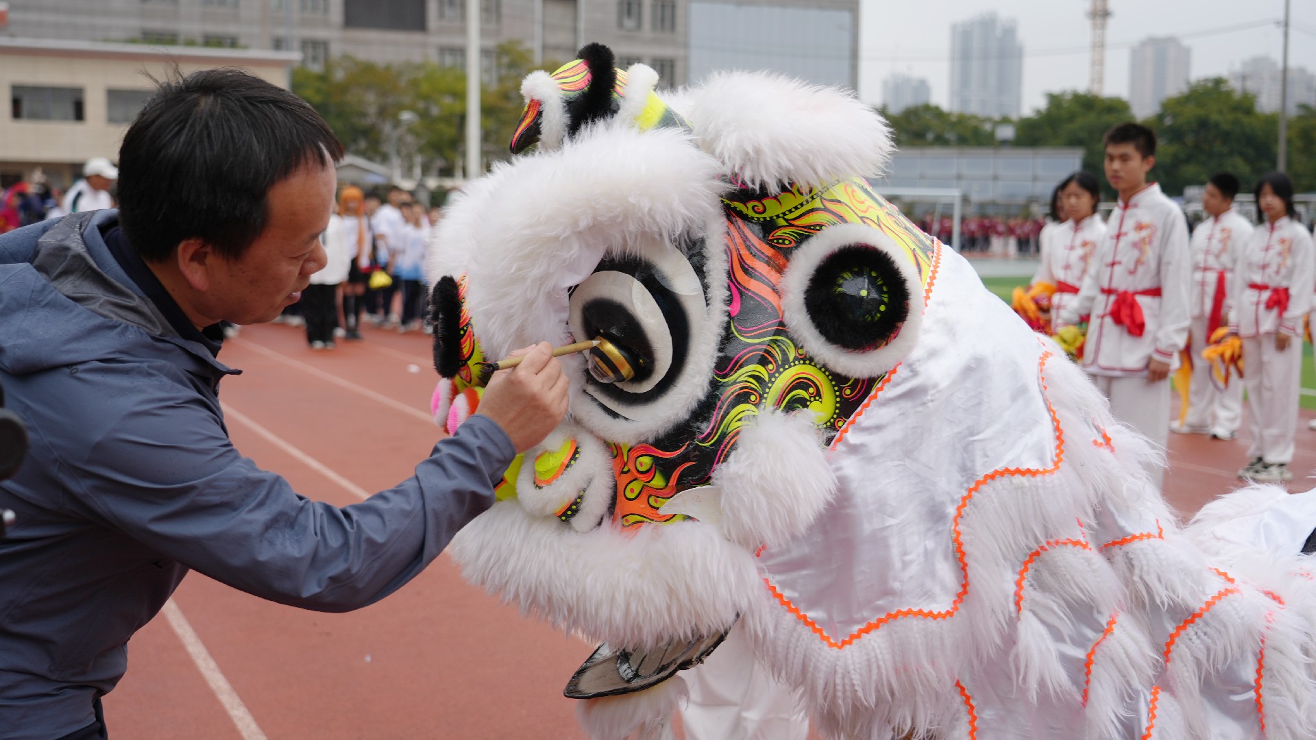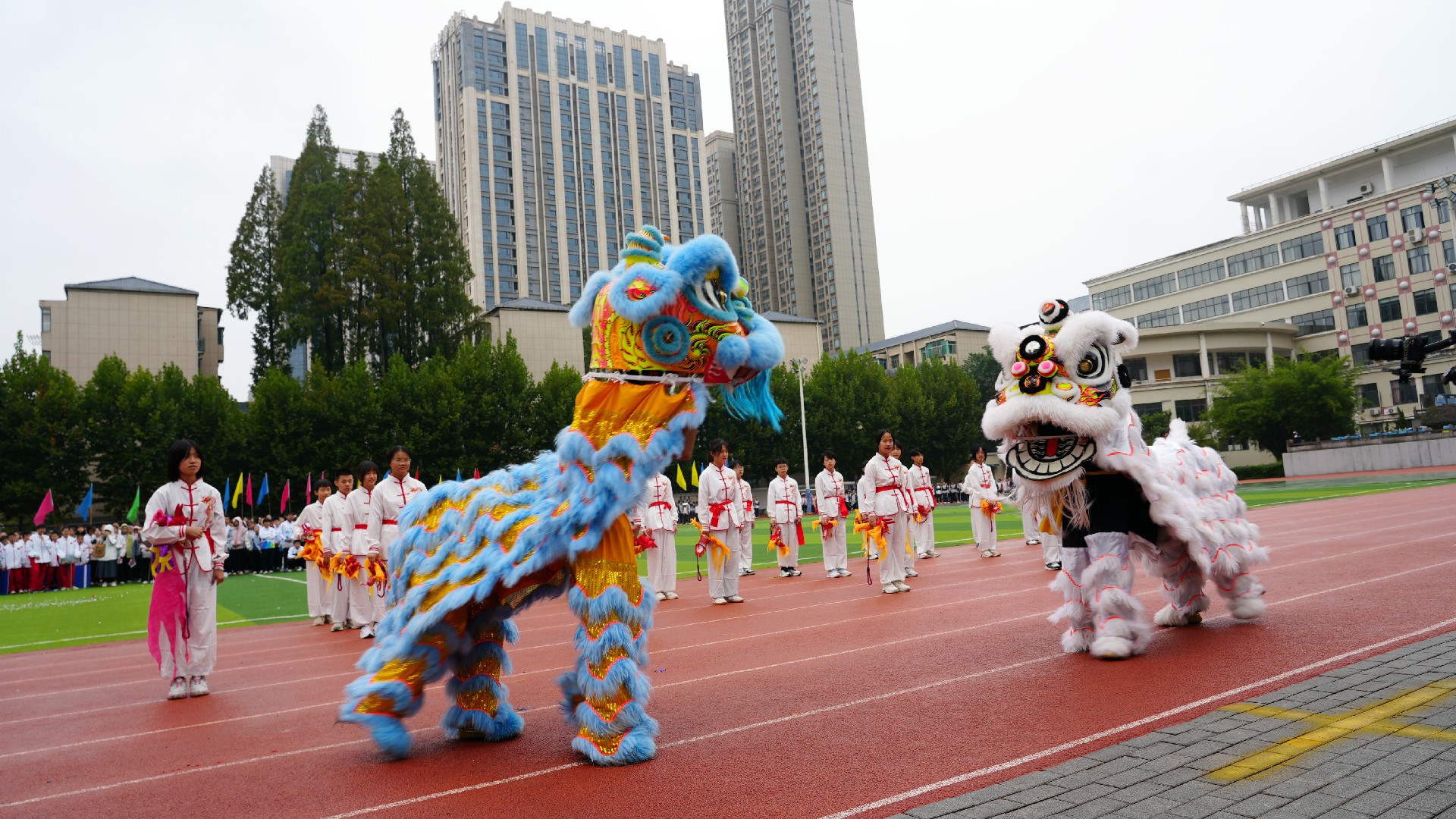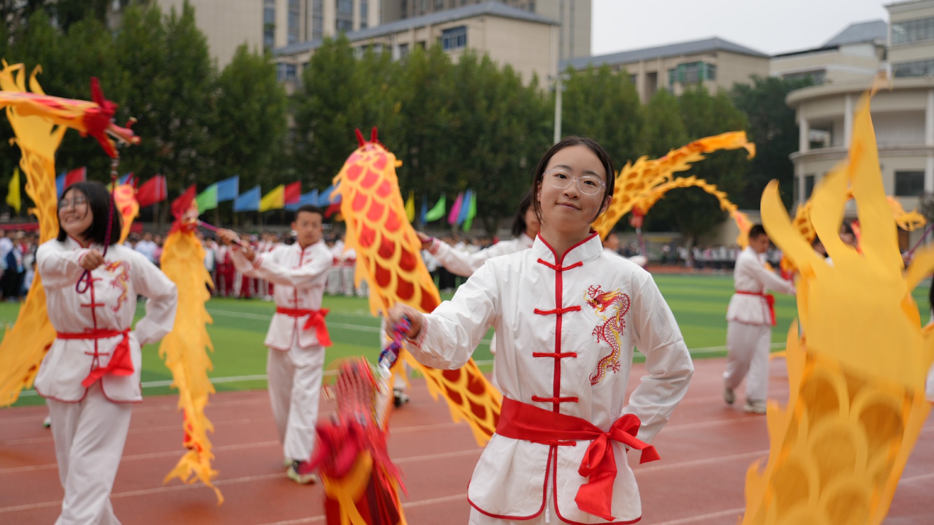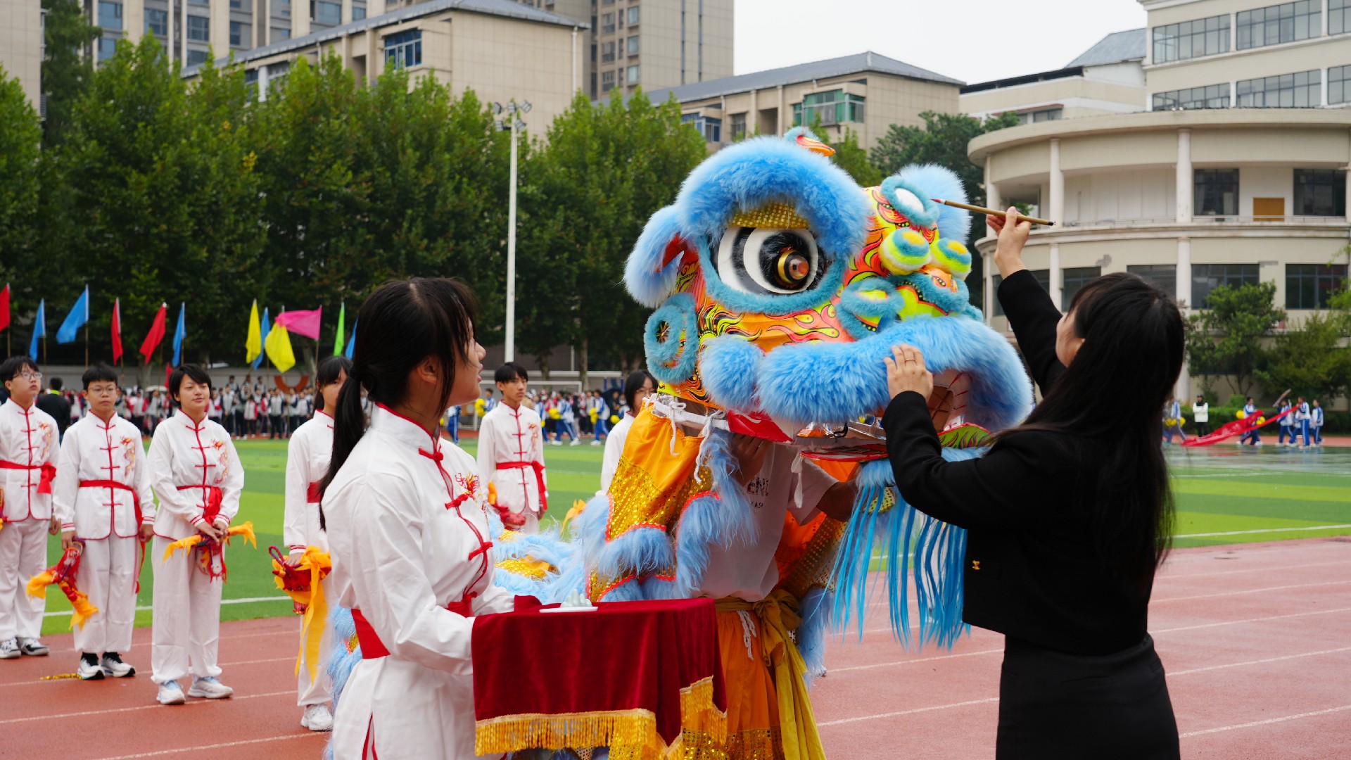 各班级的方阵表演精彩纷呈。非遗韵味,经典传承。当传统艺术遇上少年朝气,便碰撞出别样的光彩,807班舞龙舞狮队伍惊艳全场,金狮腾跃间抖落满身锐气,彩龙盘旋时卷动青春力量。一场“画龙点睛”仪式,将祝福与传承意义融为一体。与此同时,扇舞的翩跹、太极的刚柔,乃至于京剧脸谱和现代啦啦操的创意碰撞,让传统文化在青春舞台上焕新颜。