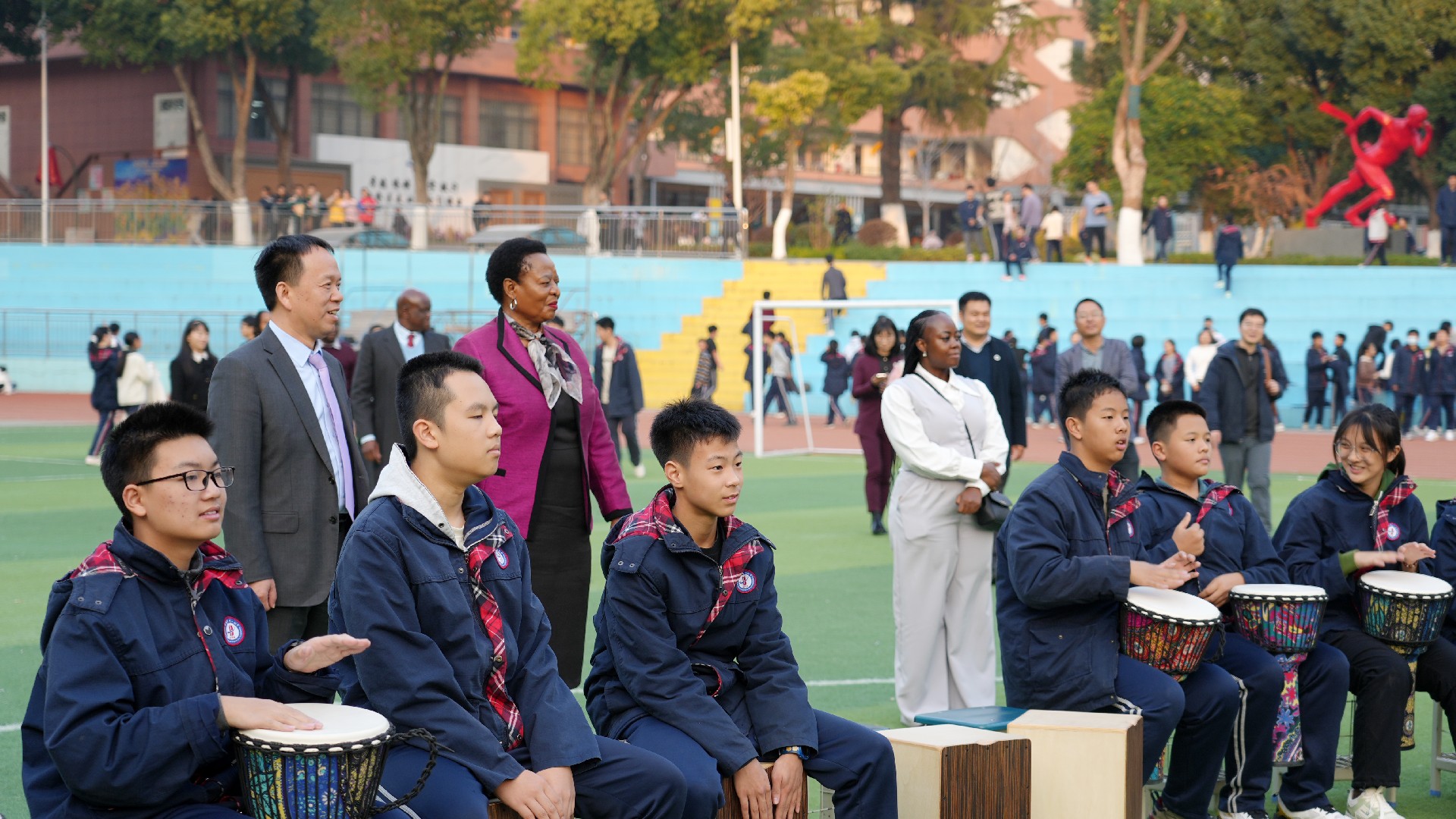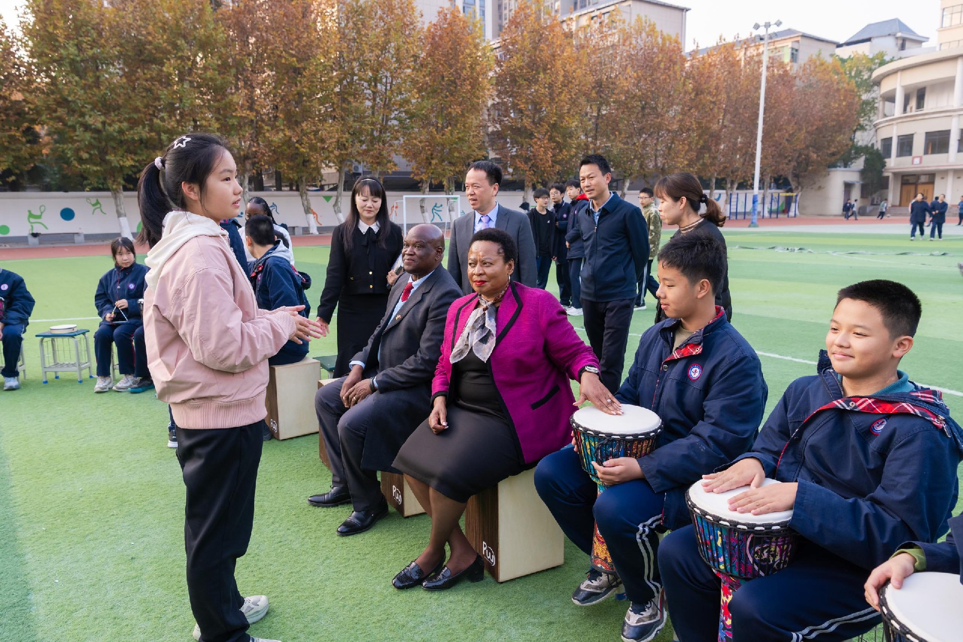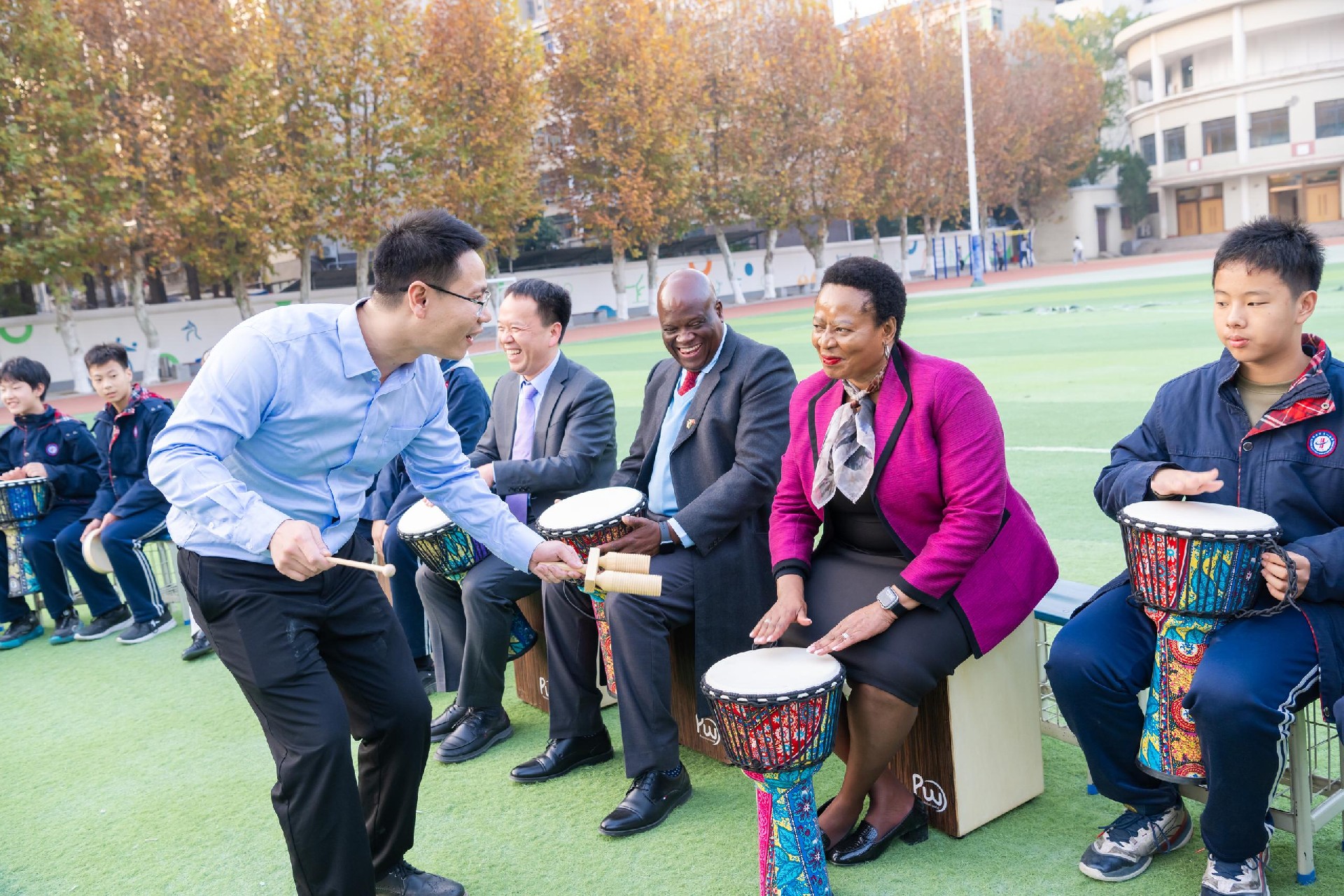 在学校操场,学生鼓圈社团活动正在热烈进行。姆豪莱副部长一行受邀观摩并欣然加入,与同学们在节奏与欢笑中感受校园生活的活力。