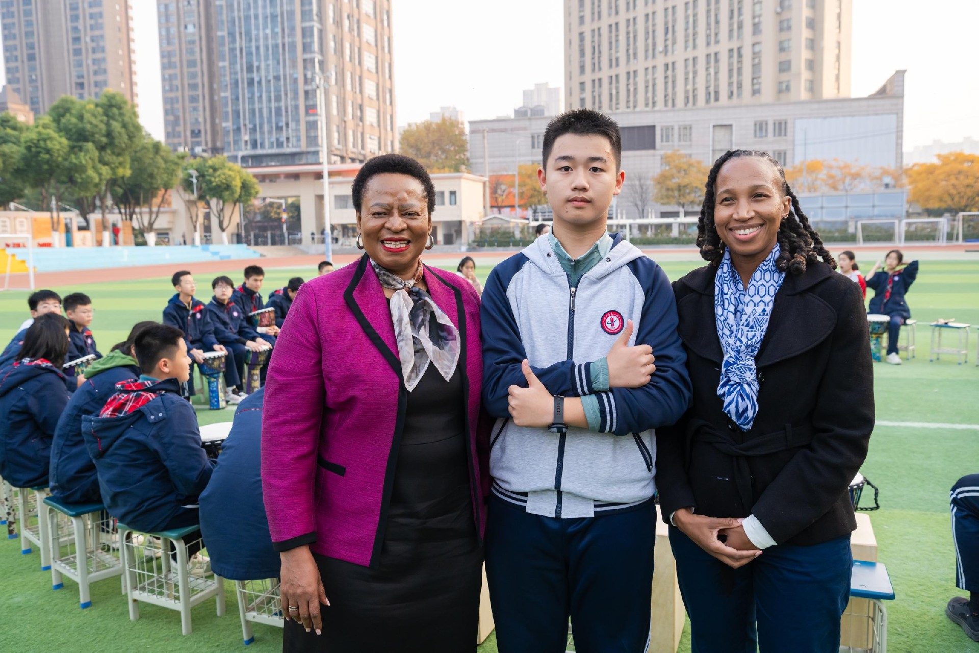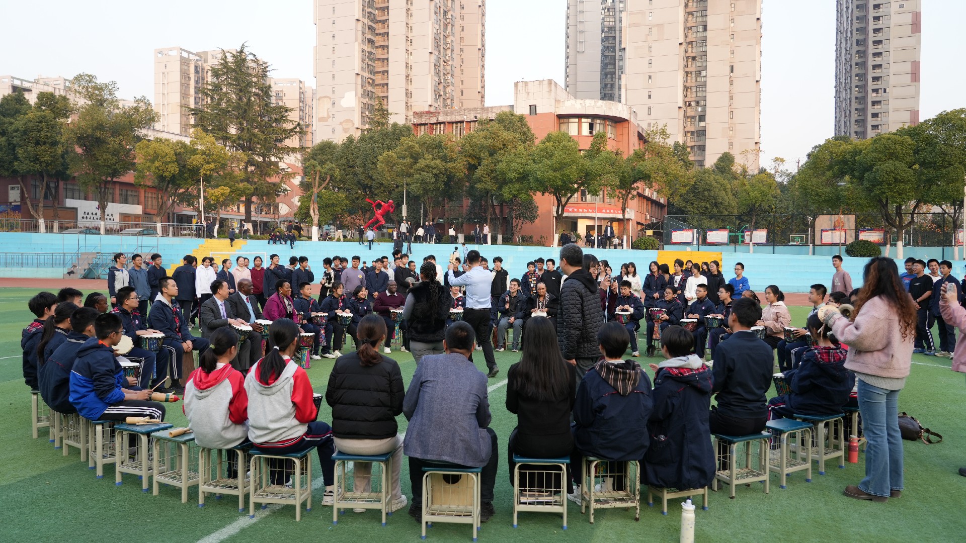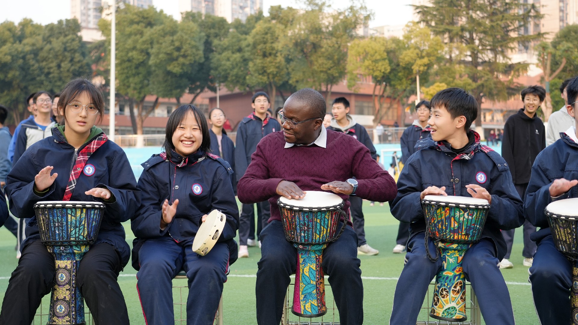 在学校操场,学生鼓圈社团活动正在热烈进行。姆豪莱副部长一行受邀观摩并欣然加入,与同学们在节奏与欢笑中感受校园生活的活力。