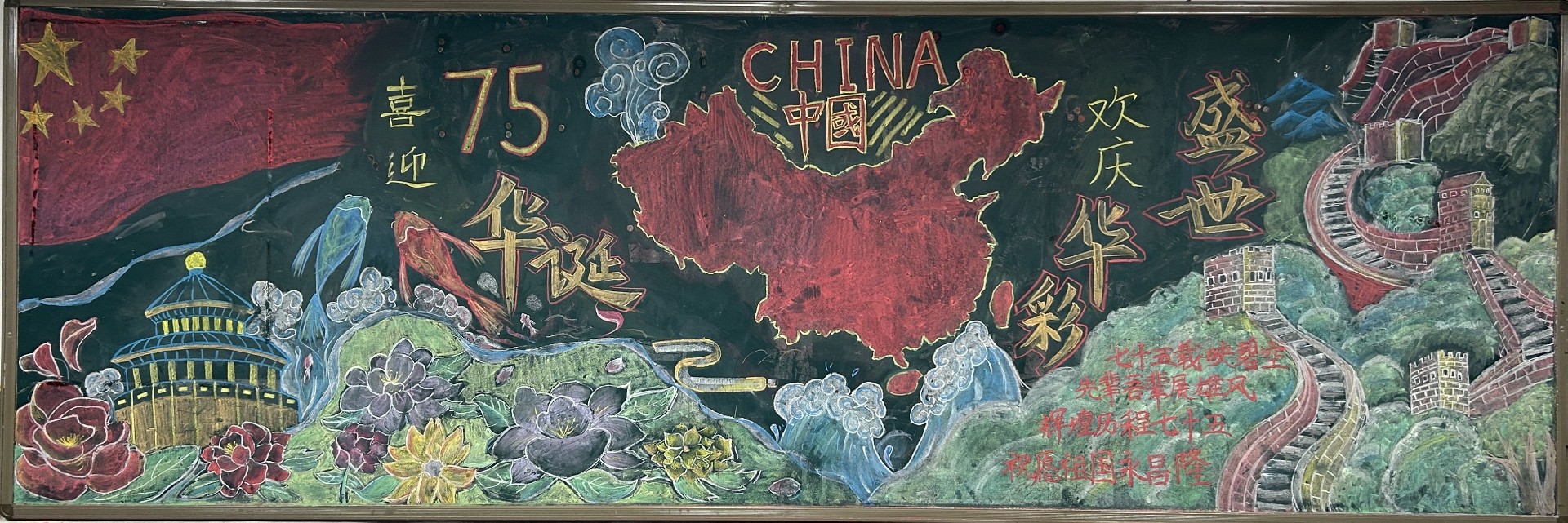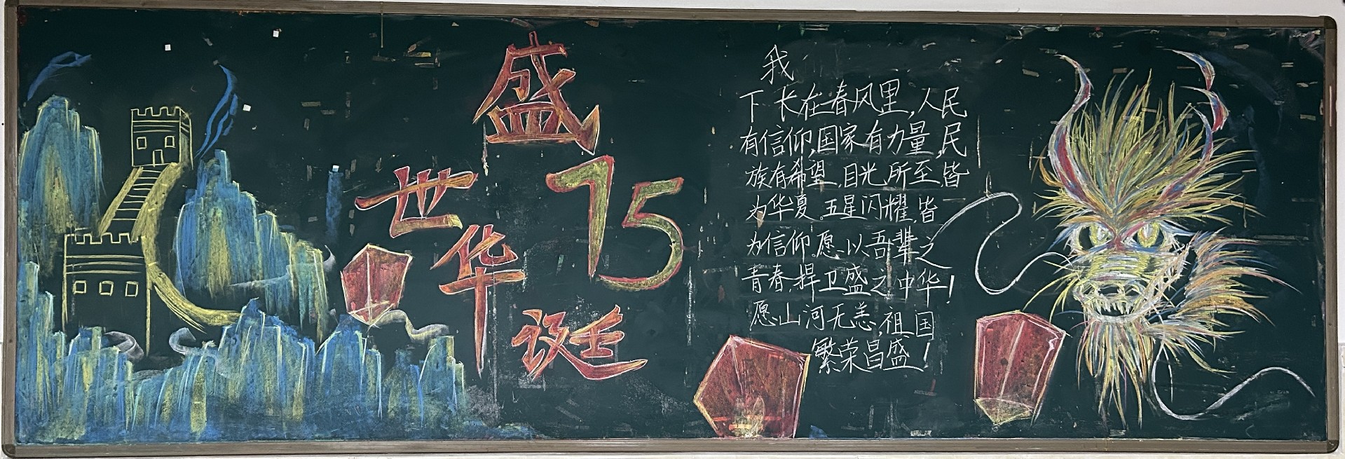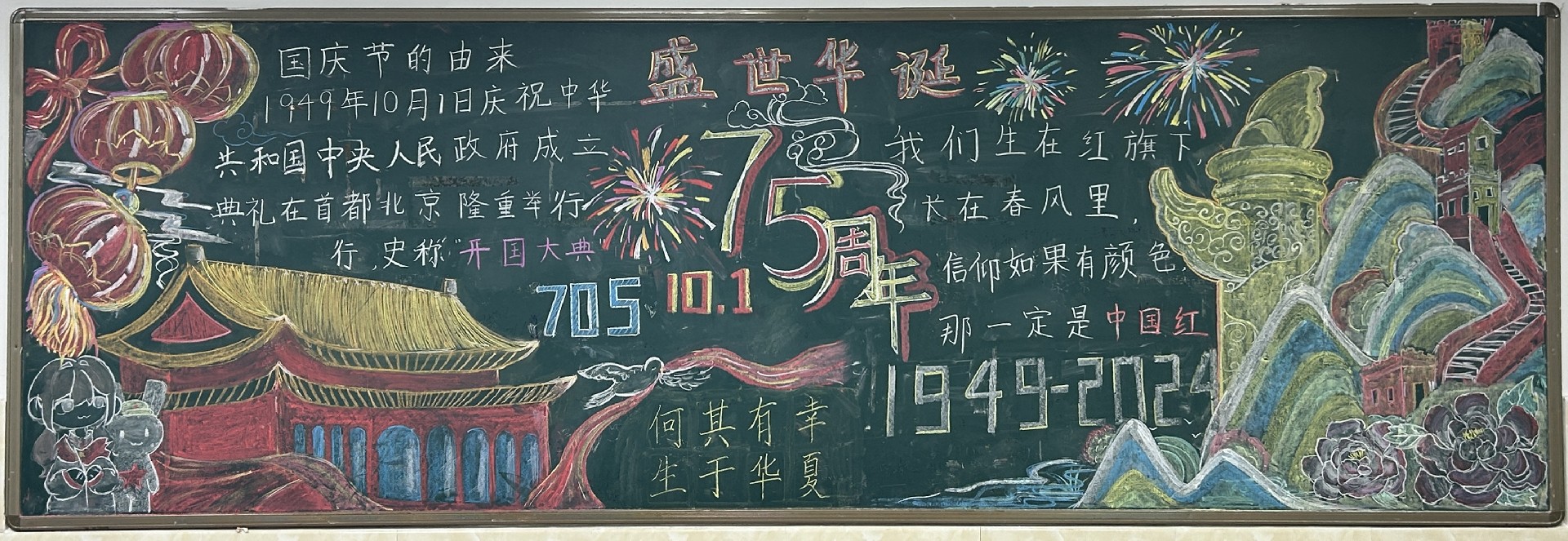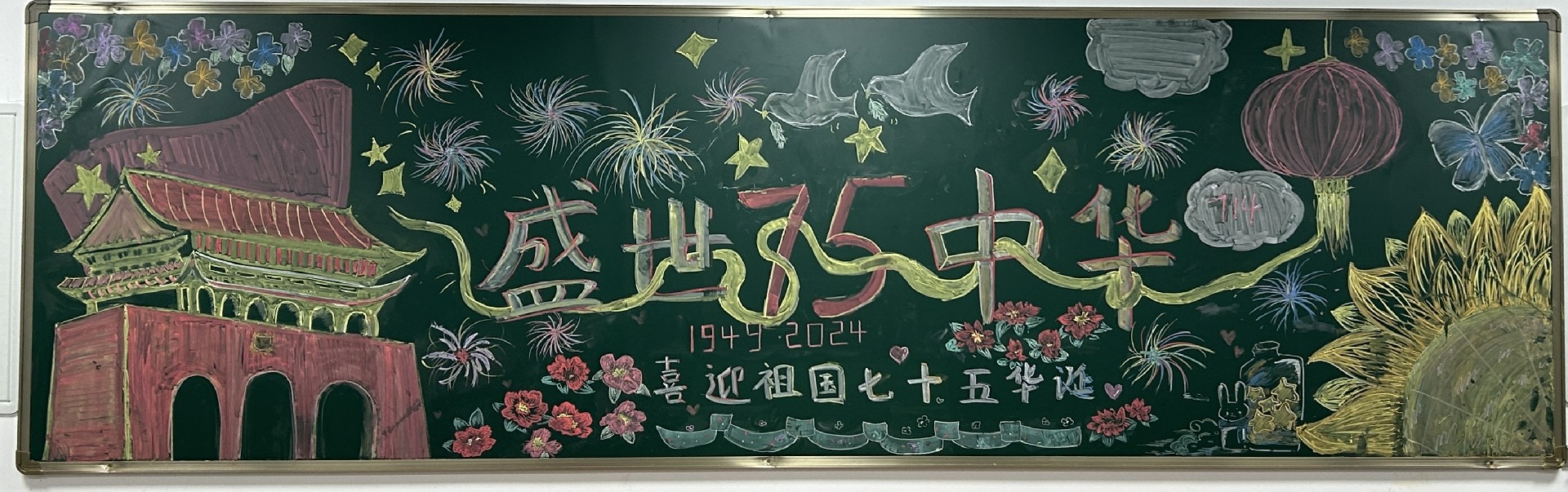 在中华人民共和国即将迎来其辉煌灿烂的75周年华诞之际,七年级开展了国庆节主题黑板报活动。本次活动旨在营造国庆氛围,进一步培养学生爱党爱国的高尚情操,弘扬伟大的民族精神,加强学生爱国主义教育。