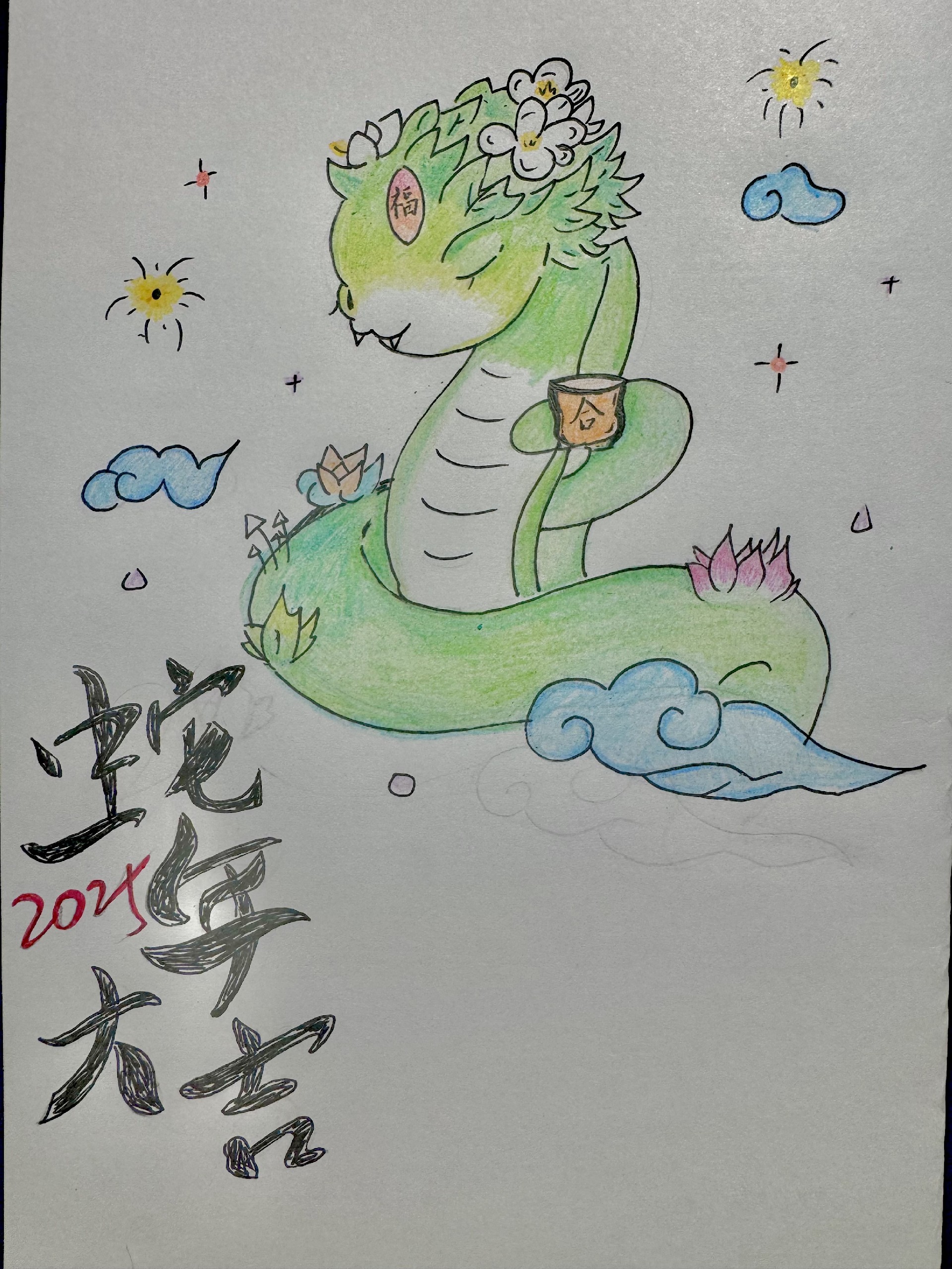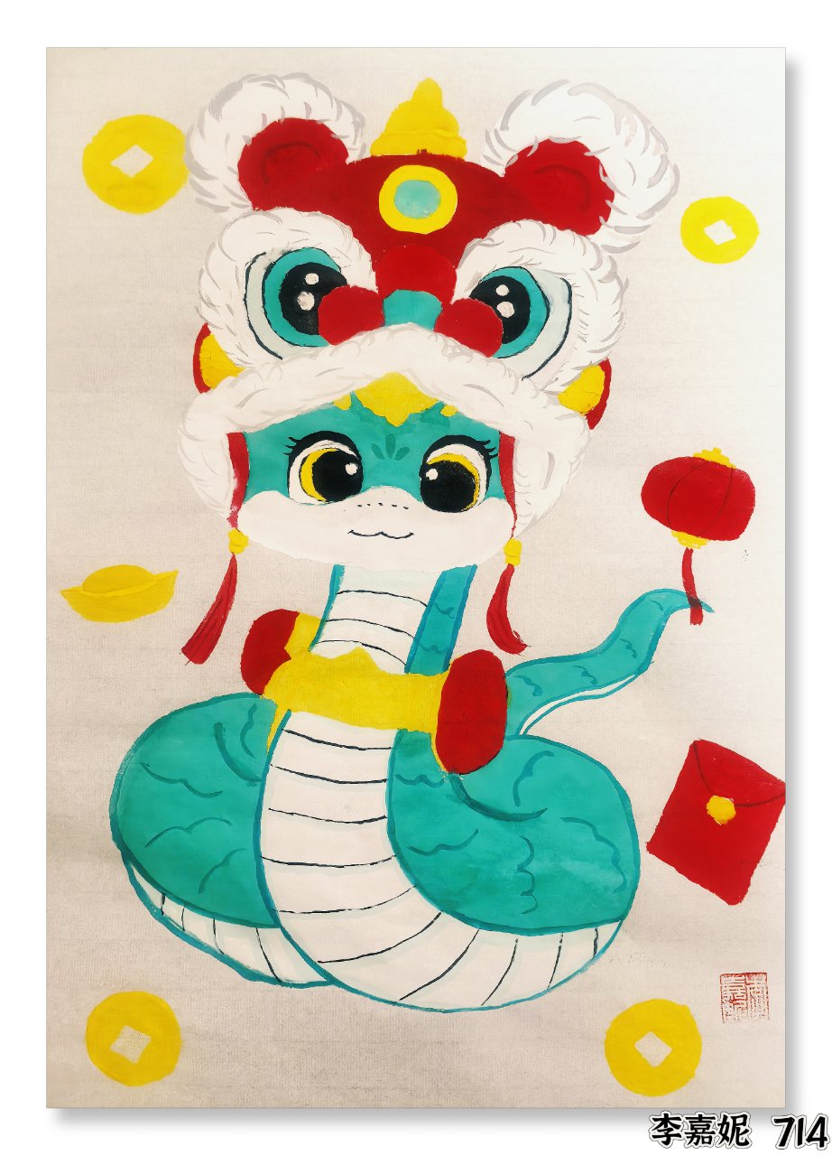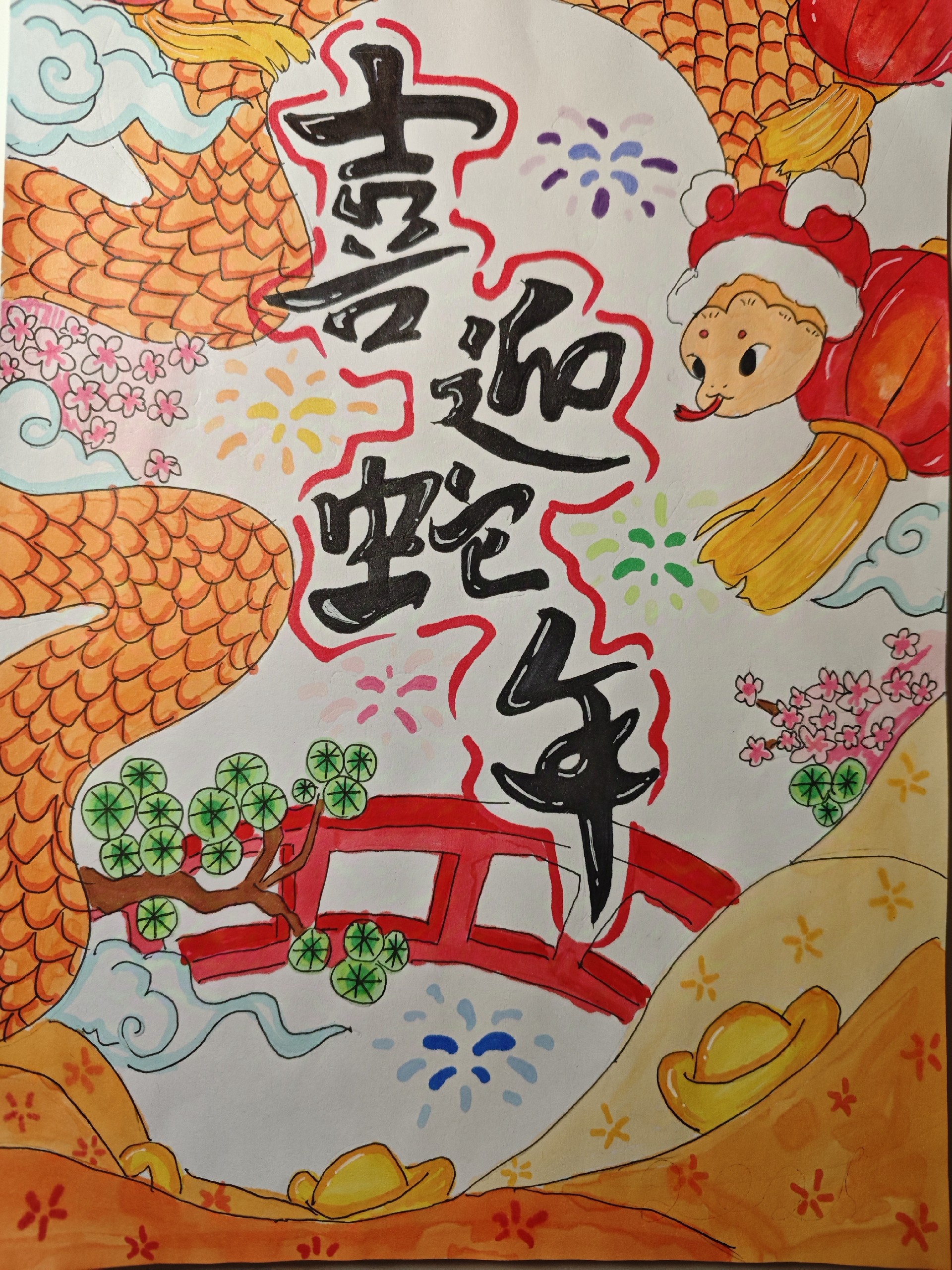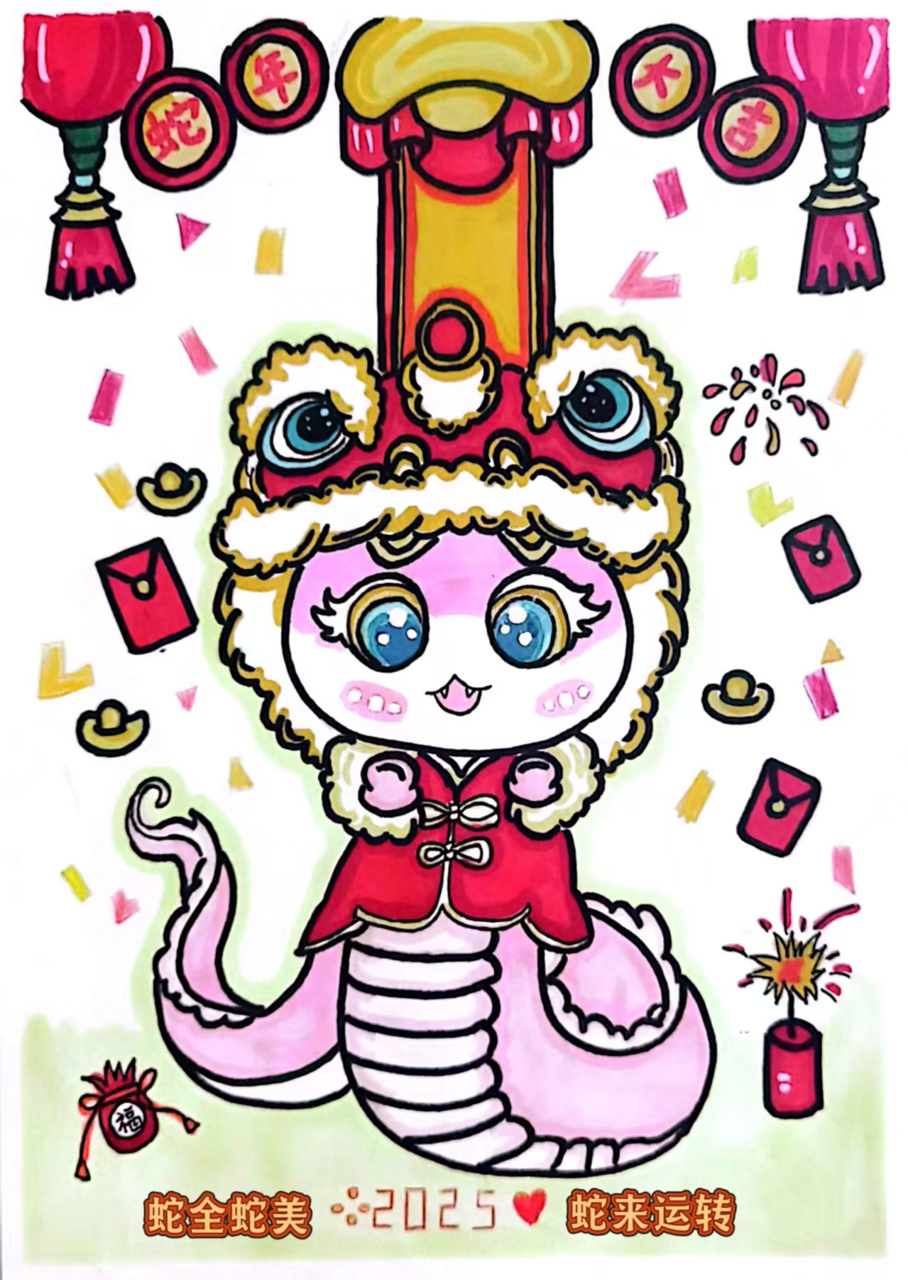 春节承载着中华民族深厚的文化和满满的情感。学生们用画笔描绘出浓浓的年味,一幅幅充满童趣的作品,传递着对巳蛇春节的美好祝愿。