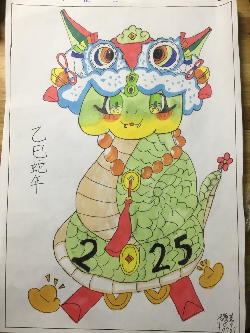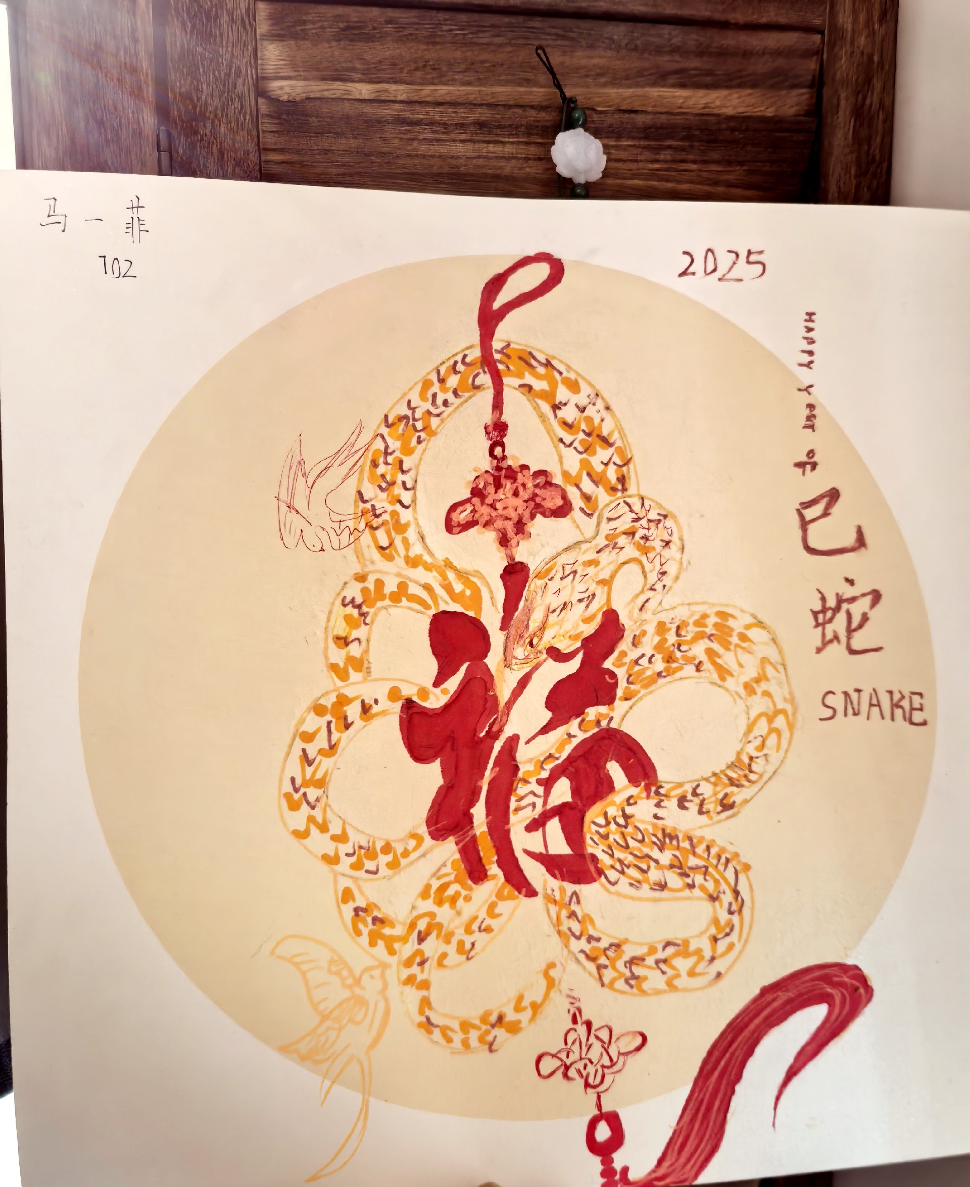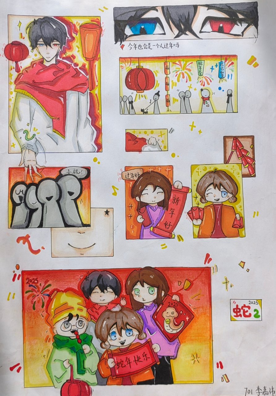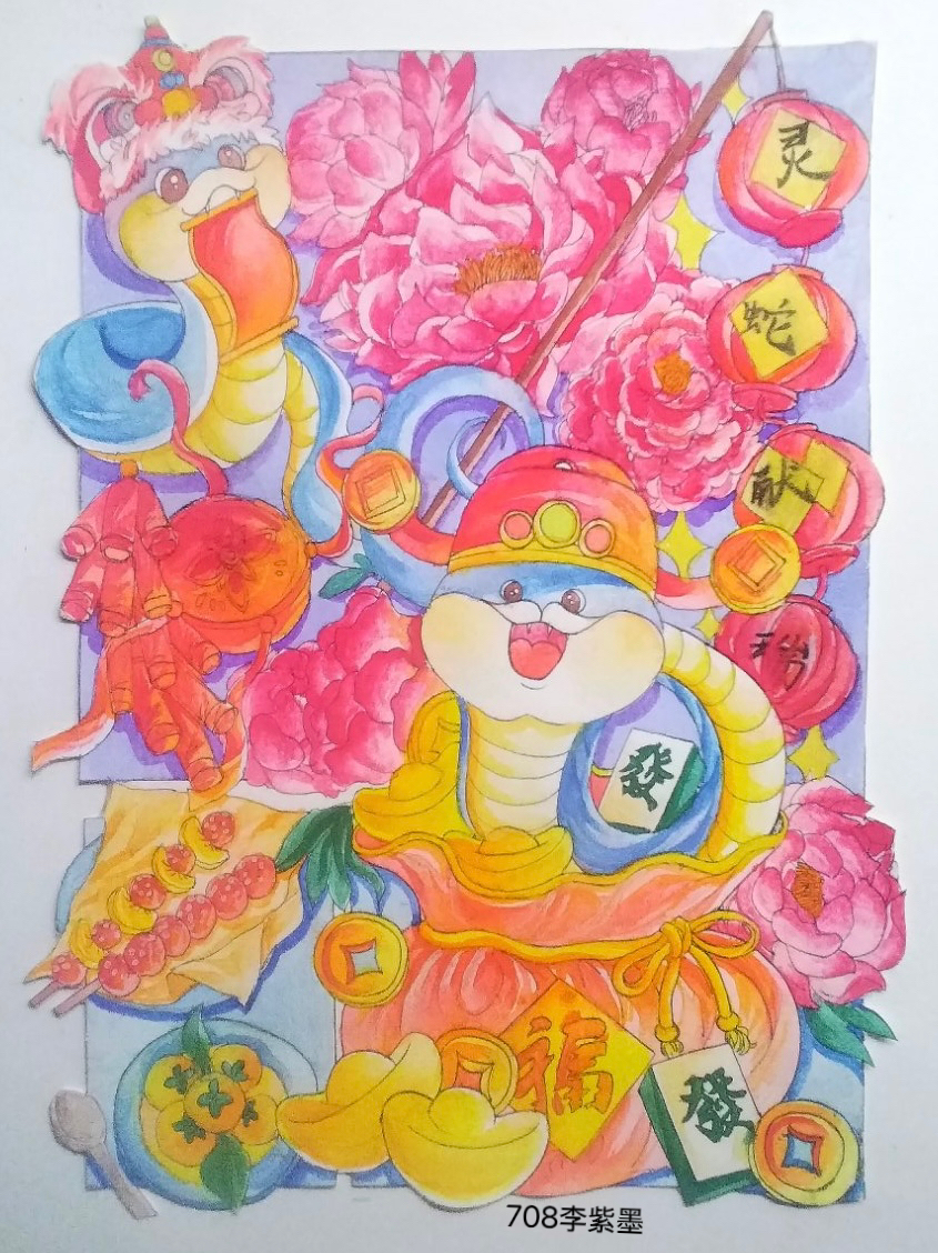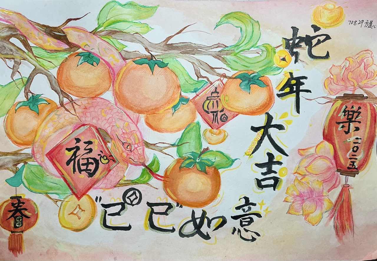 春节承载着中华民族深厚的文化和满满的情感。学生们用画笔描绘出浓浓的年味,一幅幅充满童趣的作品,传递着对巳蛇春节的美好祝愿。