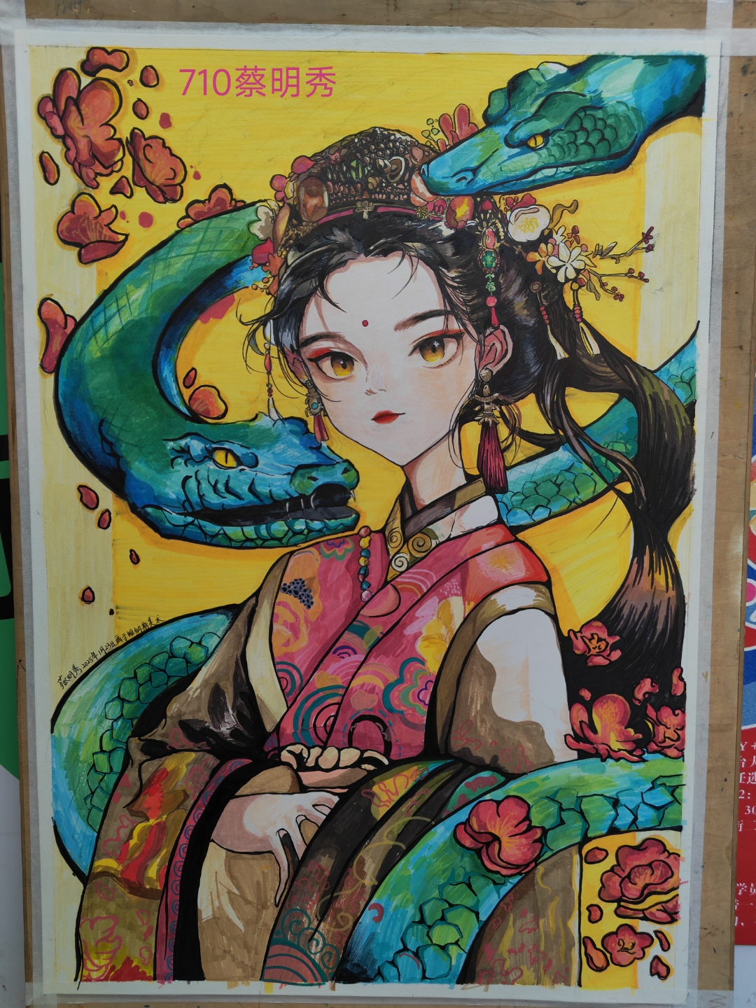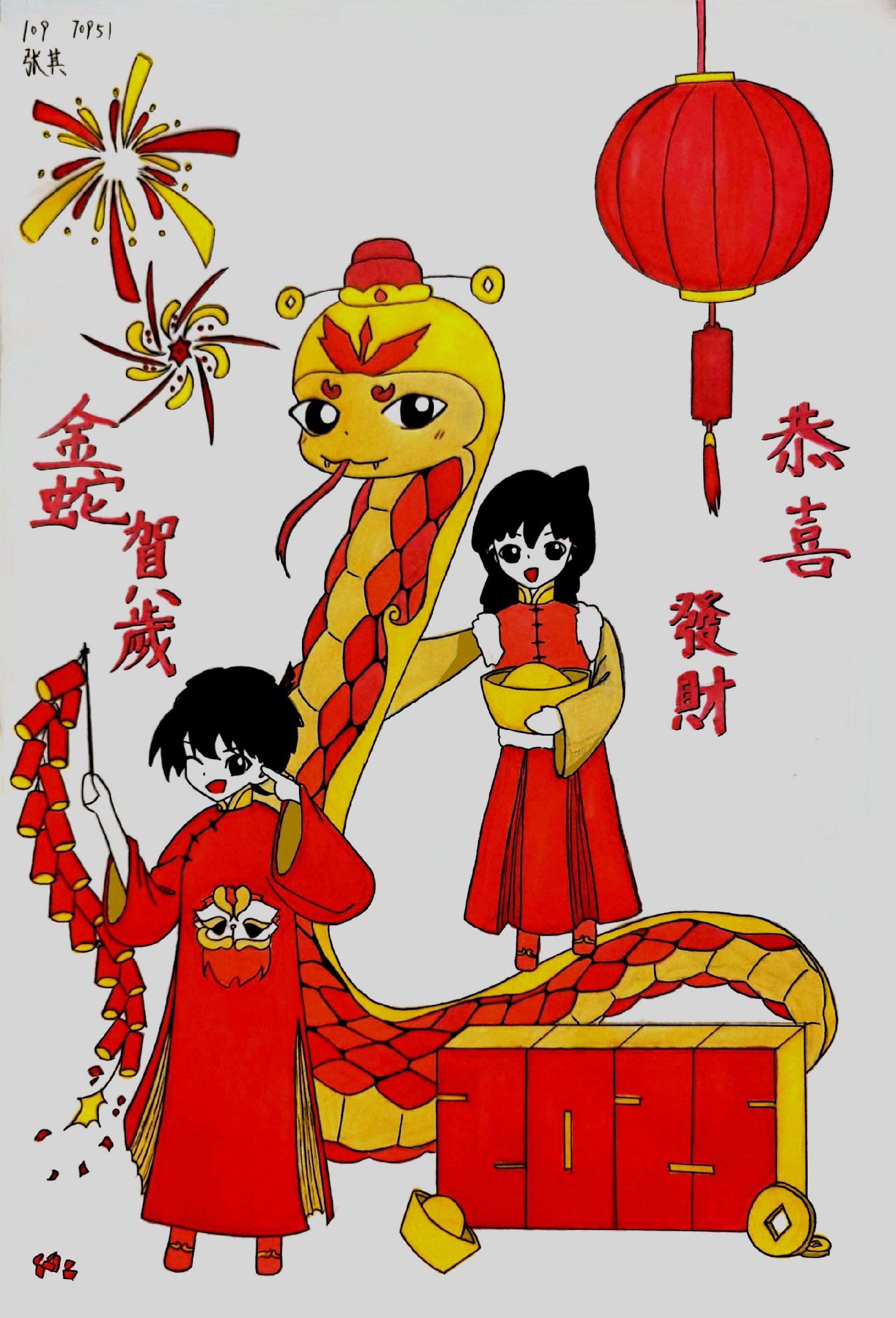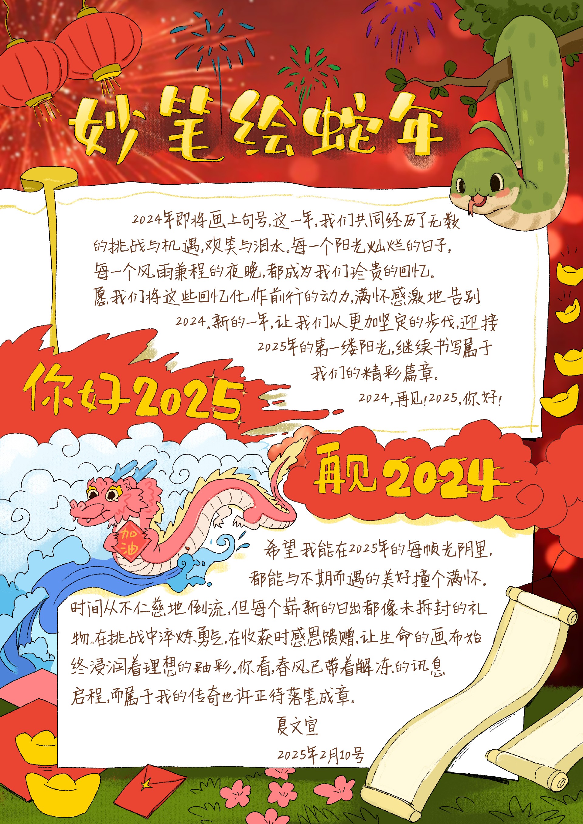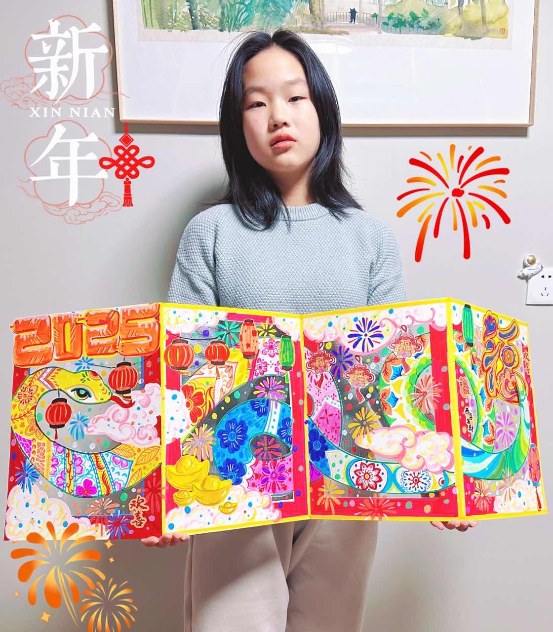 春节承载着中华民族深厚的文化和满满的情感。学生们用画笔描绘出浓浓的年味,一幅幅充满童趣的作品,传递着对巳蛇春节的美好祝愿。