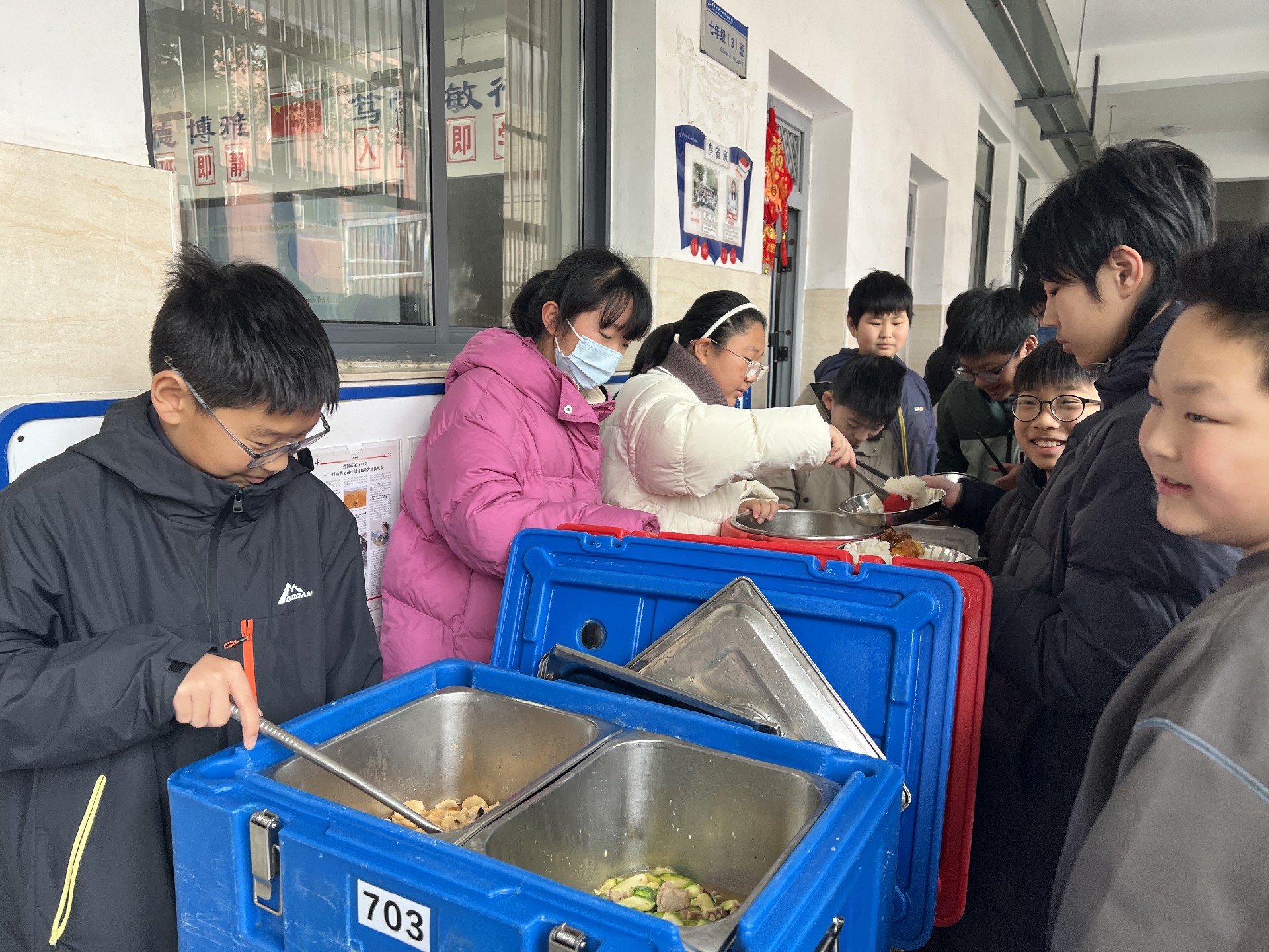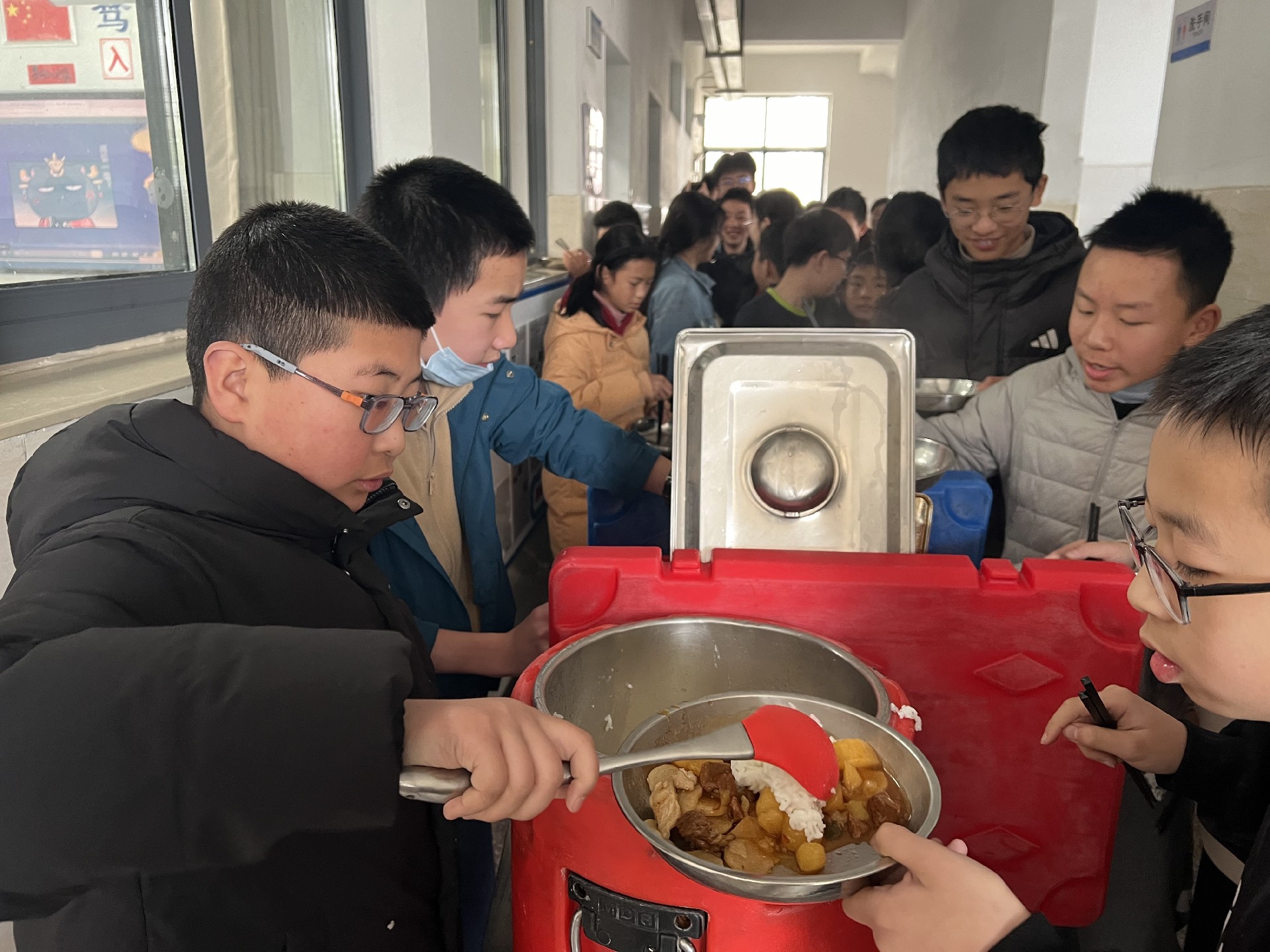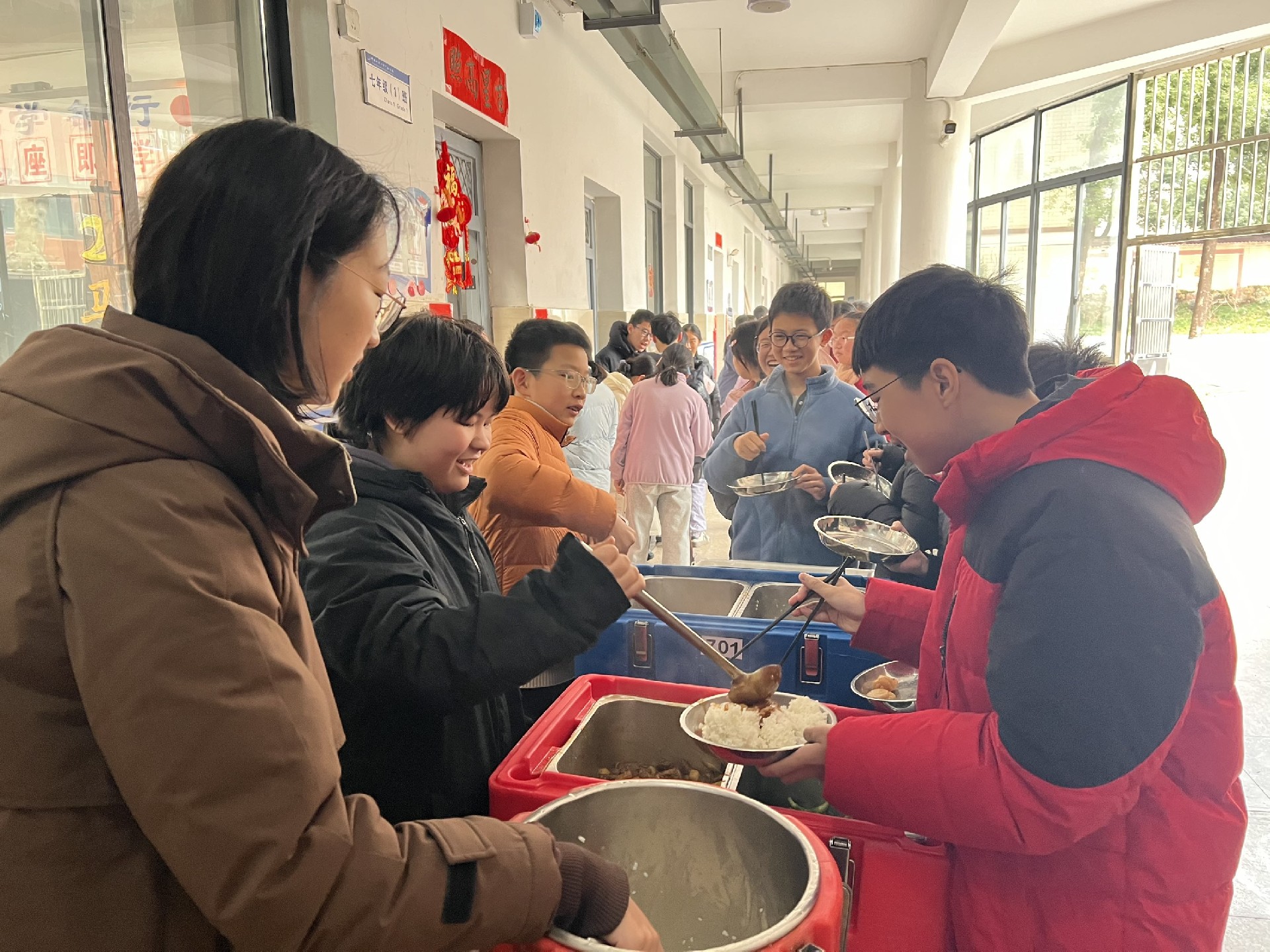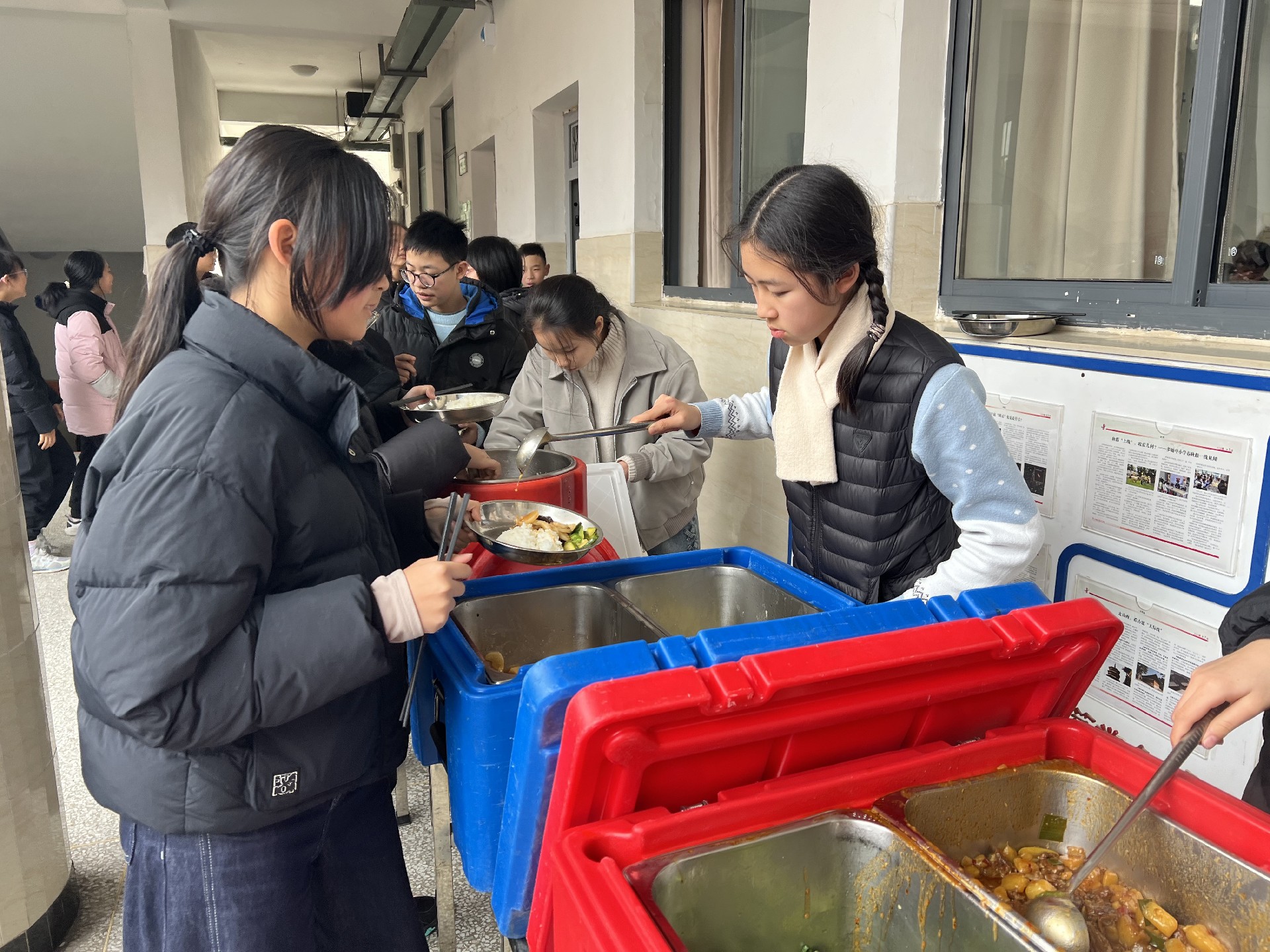 中午时分,学生们有序在走廊排队,迎来新学期的“开学第一餐”。用餐期间,大家有的互相推荐心仪菜式,有的分享寒假趣事,教学楼笑语盈盈,秩序井然却又充满温情。简简单单的一顿饭,凝聚的是集体的温度,是久违的“家”的味道。