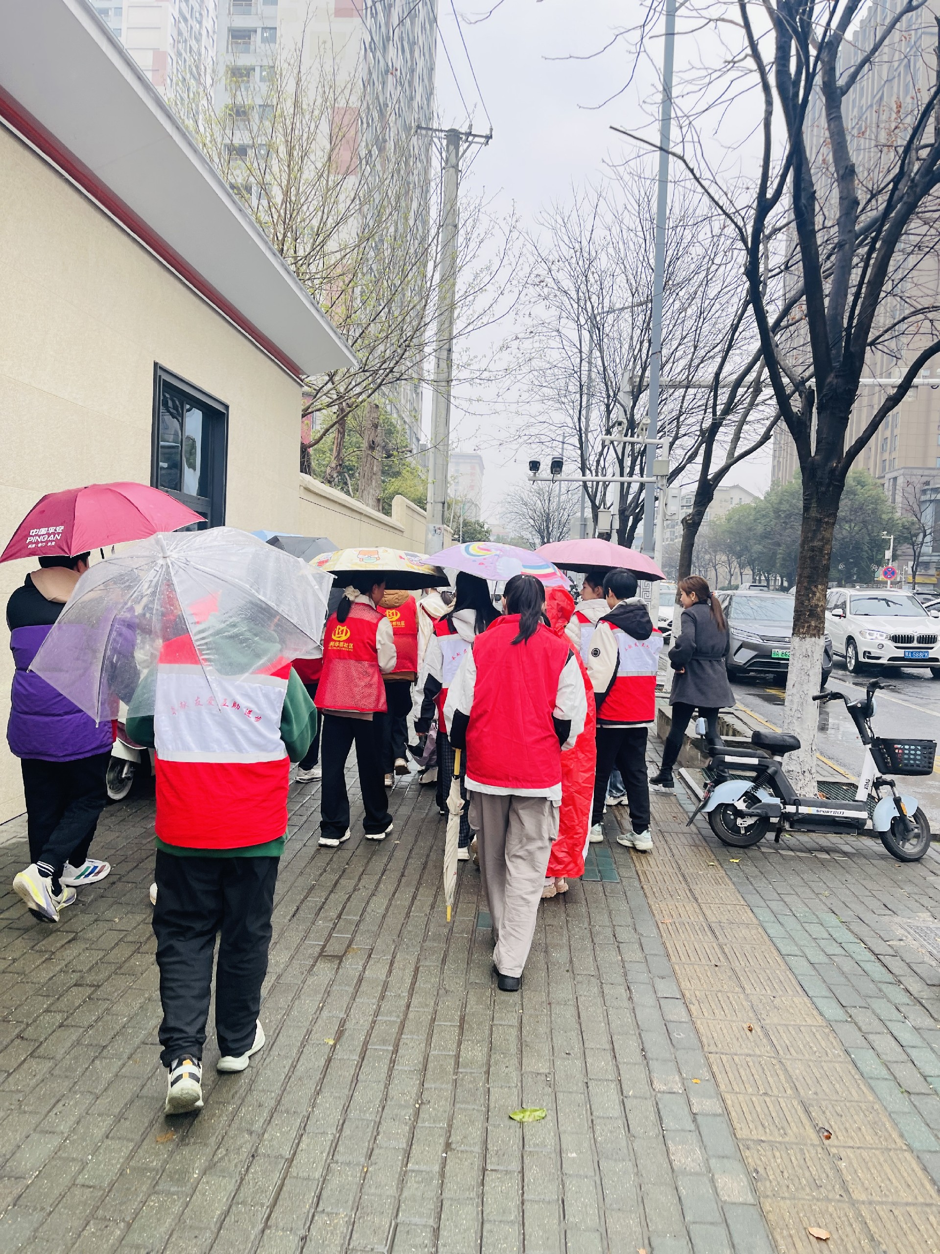花坛边,几个同学弯腰捡拾着隐蔽的垃圾。烟头、纸屑、塑料袋,一一被夹起放入垃圾袋。雨水打湿了他们的发梢,却没有一个人停下手里的动作。他们知道,干净的环境能让居民的心情如这春风般舒畅。