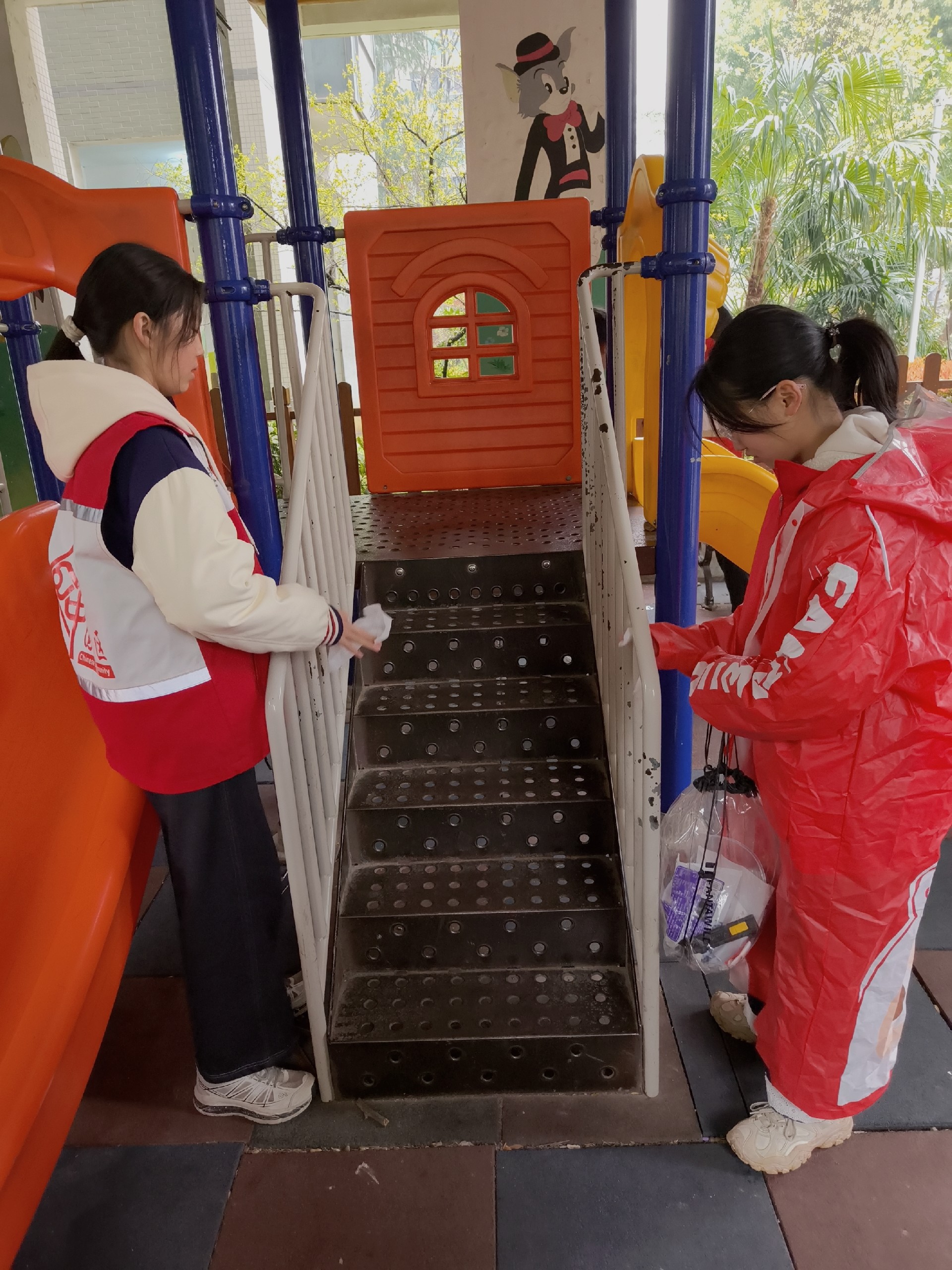 游乐设施旁,擦拭器材的同学细心地抹去每一处灰尘。滑梯、秋千、健身器材,在他们的努力下焕然一新。一想到孩子们能坐在洁净的滑梯上肆意欢笑,老人们能伴着崭新的健身器材舒展筋骨,他们的脸上便漾开了欣慰的笑容。