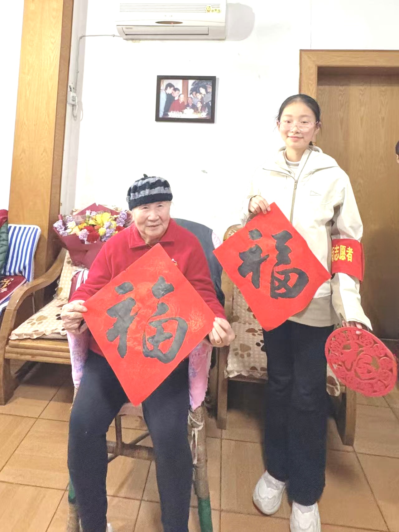 除赠送慰问品外,同学们还精心准备了一场精彩纷呈的才艺展示。长笛演奏悠扬婉转,街舞表演动感十足,毛笔书法笔力遒劲,巧手剪制的窗花与灯笼栩栩如生,敬老主题手抄报情真意切……吹拉弹唱、琴棋书画,节目内容丰富多样,精彩纷呈,赢得了奶奶和在场其他志愿者的阵阵掌声与欢笑。