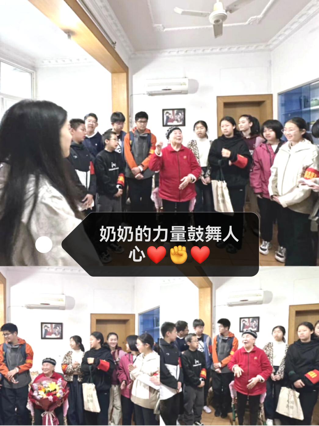 随后,志愿者小分队集体朗诵了诗歌《春天里的约定》,并合唱了充满朝气的歌曲《奔跑》。当得知左奶奶年轻时曾是文工团演员后,现场气氛更是达到高潮。同学们依偎在奶奶身旁,聆听她讲述年轻时的奋斗历程与光荣岁月。奶奶语重心长地教诲同学们要珍惜时光、勤奋学习、立志成才,努力争做新时代的“雷锋”少年;同时也寄语家长们要与时俱进,以身作则,学习雷锋精神,形成人人参与、人人有为、人人共享的良好风尚。情至深处,奶奶即兴表演了一段拿手的说唱节目,尽管腿脚不便,她时而站立、时而落座,用饱含深情的演绎带领着大家穿越时光——92岁的她和13岁的他们,因艺术而心灵相通,因真情而彼此温暖。