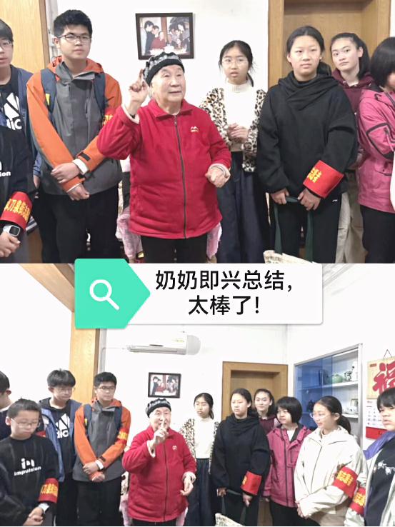 离别时分,依依不舍。在与奶奶合影留念后,同学们在楼栋门口自发围成一圈,分享着内心的感悟。陈子欣同学说道:“看到奶奶接过礼物时眼中的泪光,我忽然明白,真正的关爱从不在于礼物多么贵重,而在于我们愿意停下脚步、用心倾听、真情陪伴。作为新时代的少年,我们不仅要传承老一辈坚韧不拔的精神,更要将雷锋精神融入日常。”