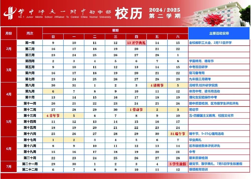 日期星期时间地点工作内容组织部门/单位2月23日星期日2月24日星期一上午9:30-10:10田径场升旗仪式学工处2月25日星期二2月26日星期三上午11:50-12:30阶梯教室党员大会党支部下午15:55-17:25七年级各班教室选修课开课科教处、七年级2月27日星期四下午15:55阶梯教室教师研修《数字化课堂实施技巧与案例分享》校办下午15:55-17:···