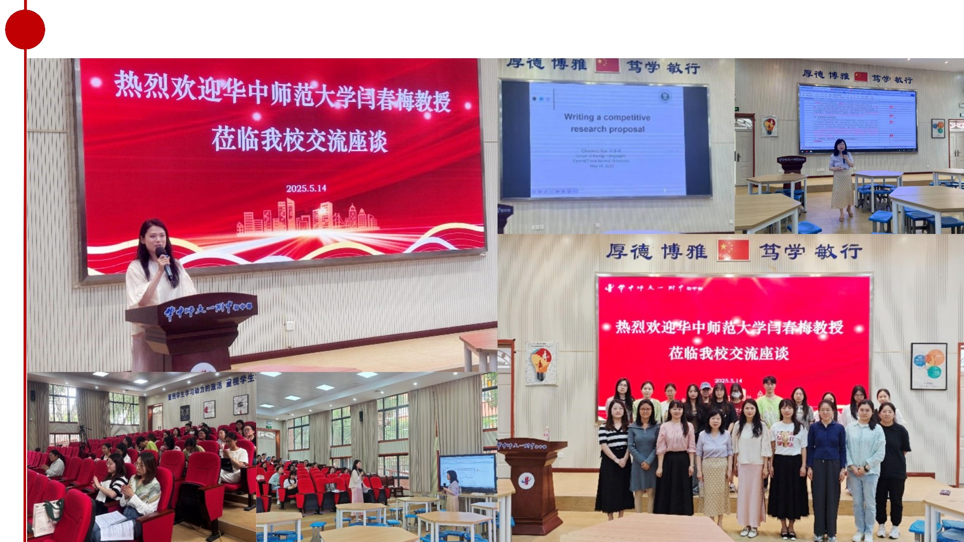 ▲ 5月14日,我校英语教研组特邀华师大外国语学院闫春梅教授主讲《如何撰写有竞争力的研究计划书》专家讲座。